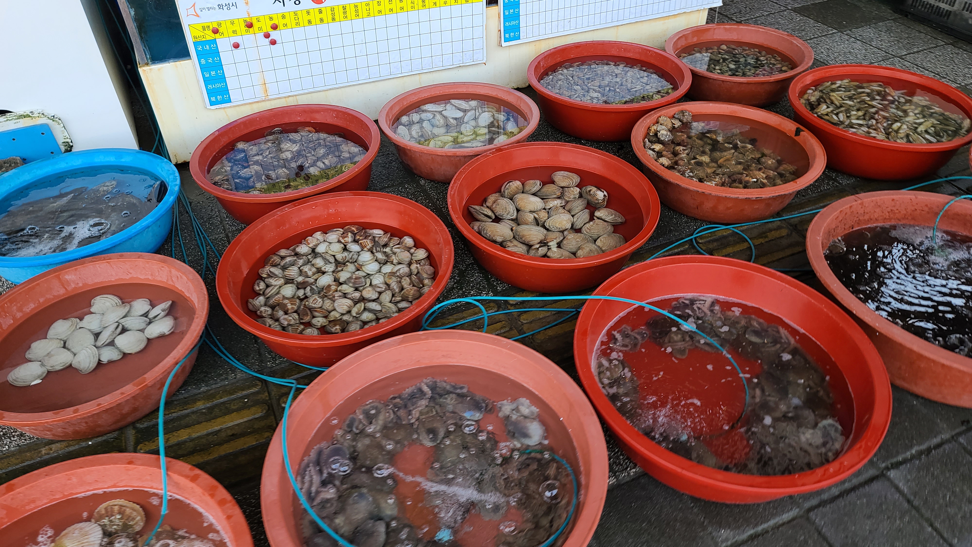 돌아다니며 가게들을 둘러보니 쭈꾸미, 가리비, 해삼, 맛조개 등등 다양한 제철 해산물들이 수족관 및 소박하게 바구니에 담겨있는 모습이 전통시장을 보는 듯 매우 이색적입니다.