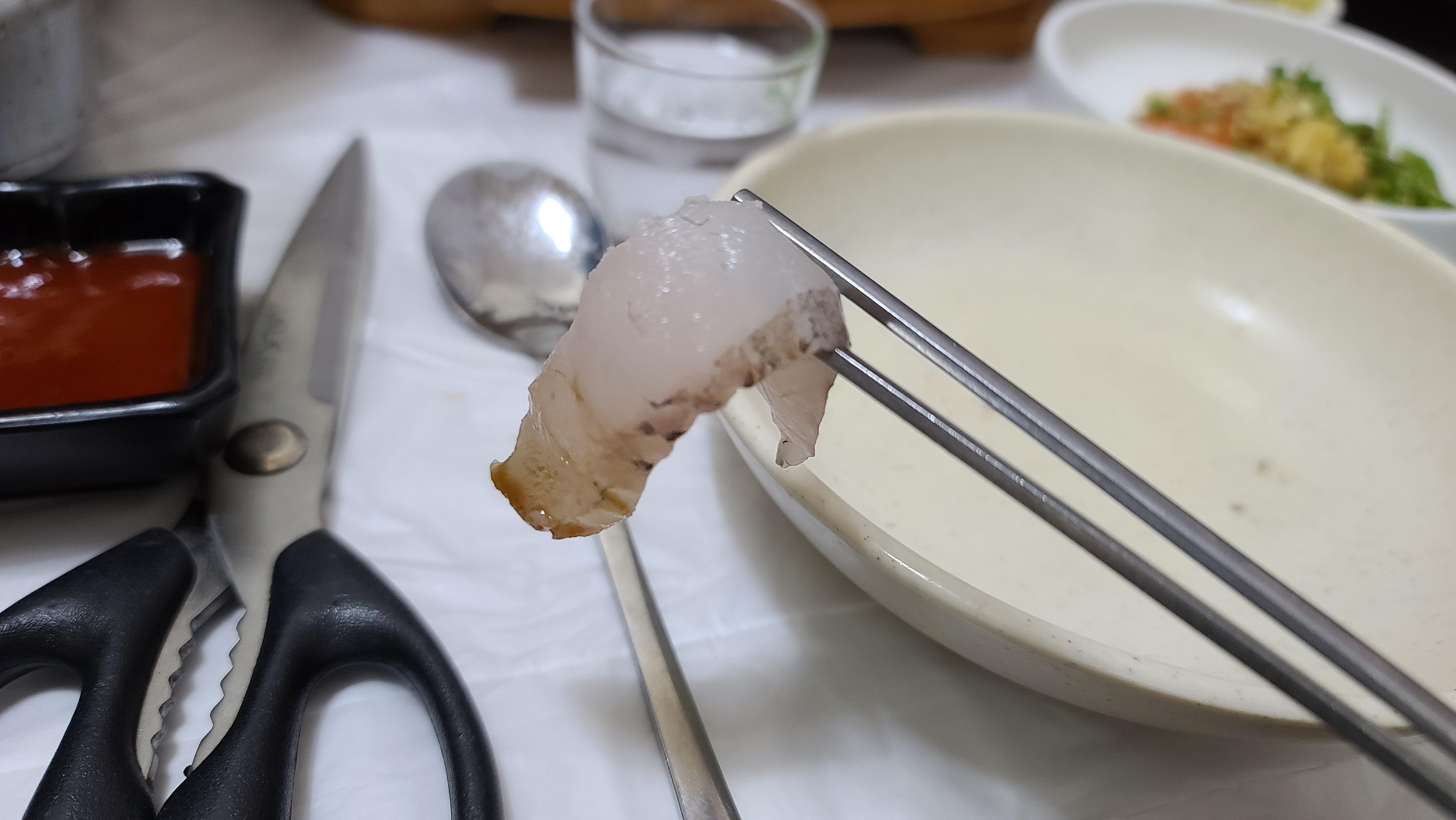 모듬회가 나왔습니다. 하지만 모듬회라고 하기에는 생선종류가 많지 않아보입니다. 광어의 뱃살과 우럭의 비늘만 보일뿐 아무리 눈씻고 찾아봐도 돔종류의 줄무늬나 다른 어종의 모습이 보이지 않습니다. 모듬회에 무엇이 들어가는지 여쭤보니 광어, 우럭이라고 합니다. 아무리 생각해도 '모듬'회의 의미를 잘 모르는 것 같습니다. 당했다고 생각하고 그냥 먹어보기로 합니다.