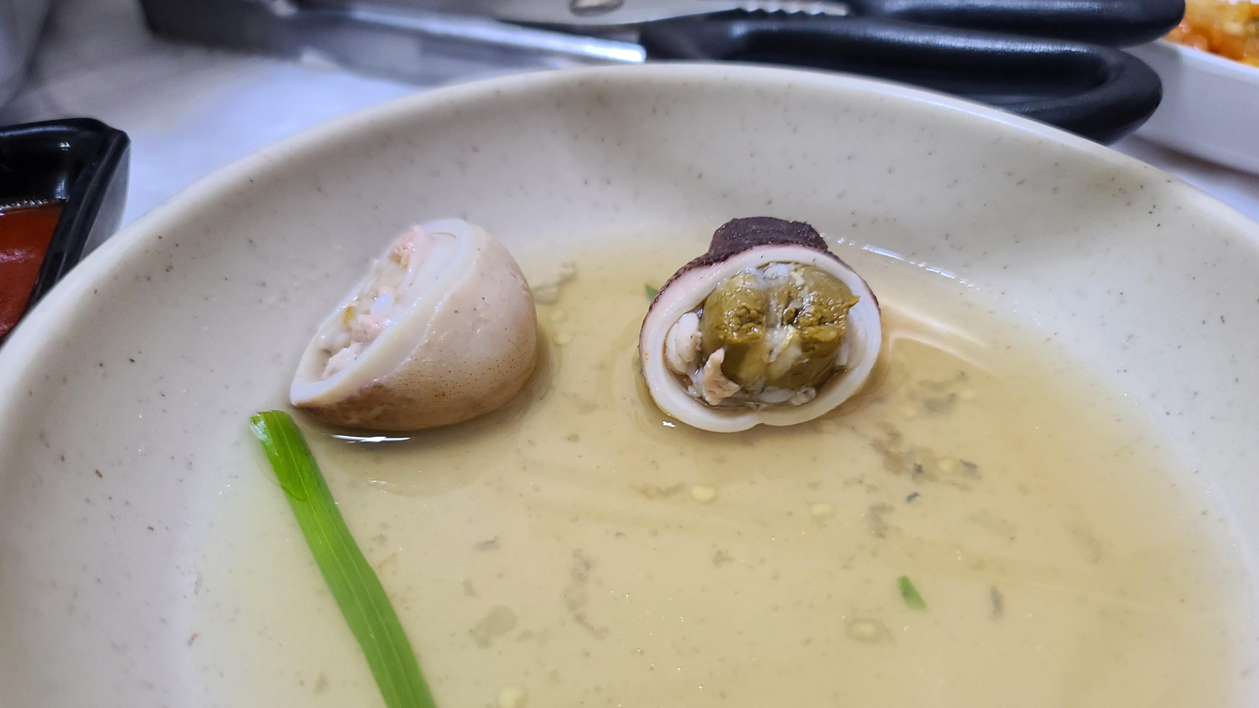 쭈꾸미의 머리는 육수가 우러나올때 까지 오래 데친 후 맛을 봅니다. 머리를 잘라보니 알이 가득차 있는 제철쭈구미의 그대로의 모습을 보여줍니다. 톡톡터지는 식감과 함께 육수를 함께하니 봄철 최고의 맛을 느끼게 해줍니다.