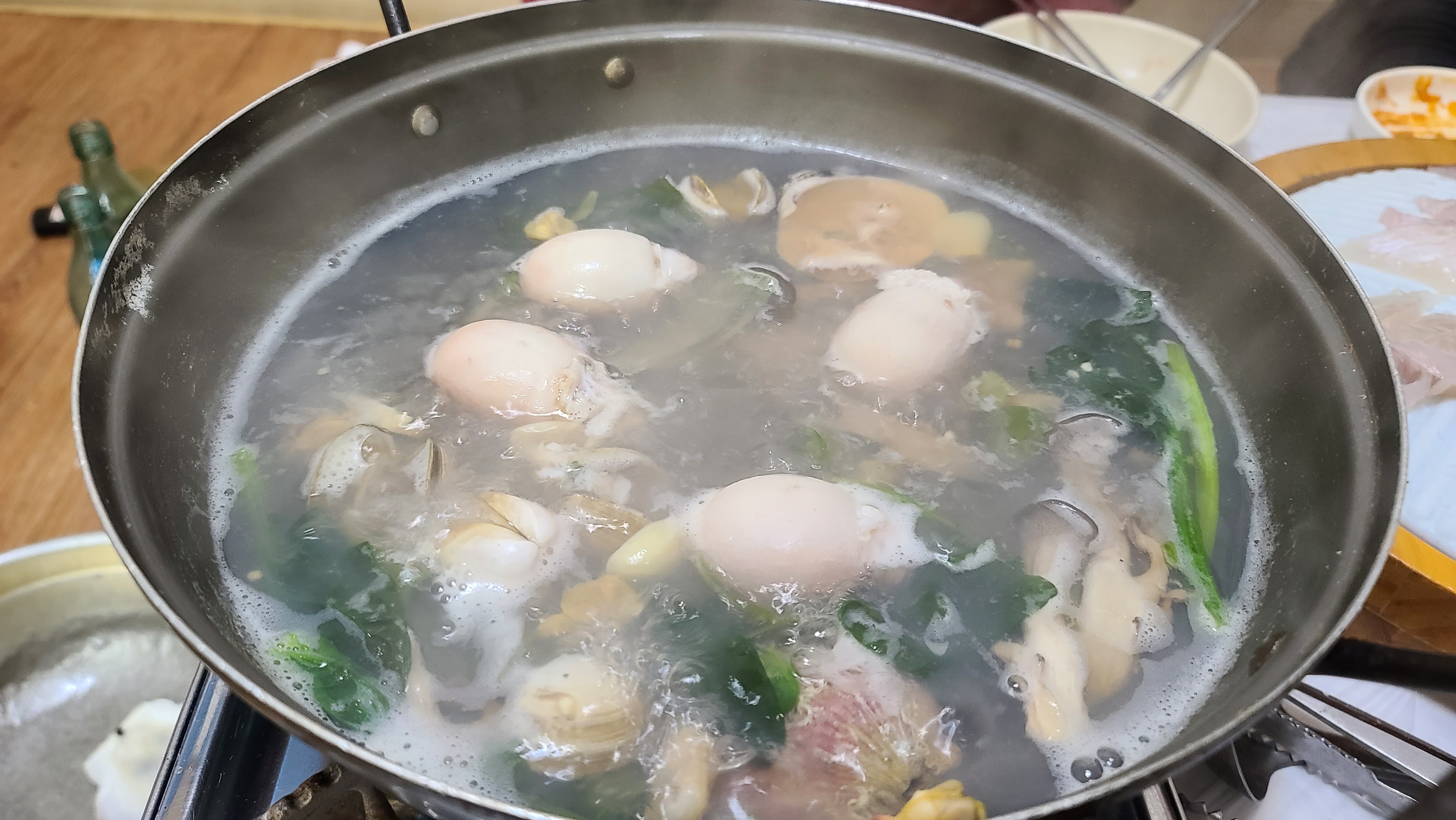 쭈꾸미를 육수에 야채와 함께 투척 쭈꾸미 샤브샤브를 즉석에서 제조해봅니다. 조개탕 베이스의 뽀얀 국물에 쭈꾸미 그리고 야채의 조합이 최고의 맛을 내줄것 같은 쭈꾸미 샤브샤브의 비주얼을 보여줍니다.