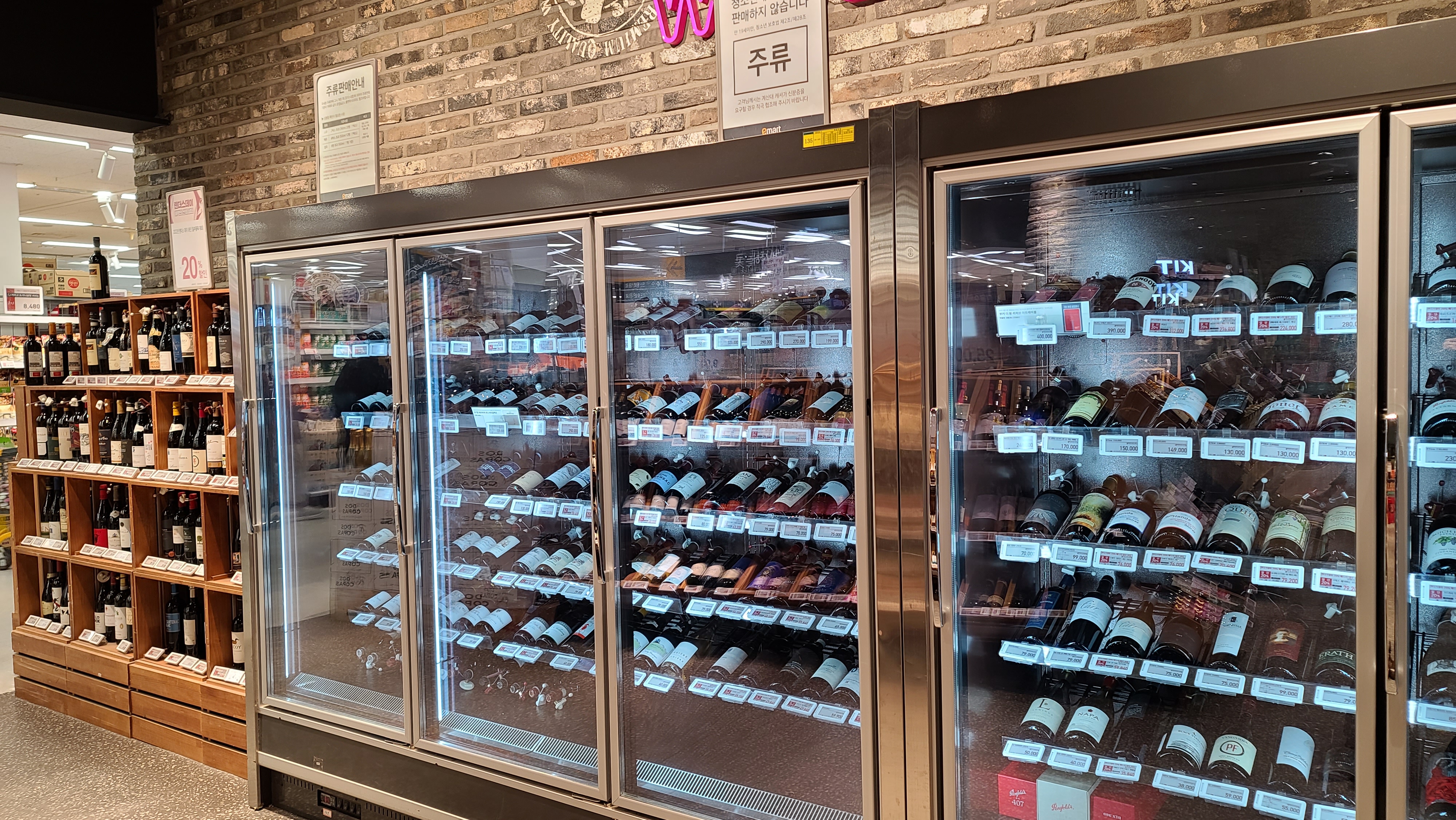 와인 철제 진열대와 와인냉장고 안쪽 으로는 와인 나무 진열대를 놔서 다양한 와인을 진열해 놓았습니다. 이마트의 PB와인 도스코파스가 자리잡고 있는 것으로 보아 많이 팔리는 와인은 이 주류매대에 진열되어 있는 것으로 보입니다.