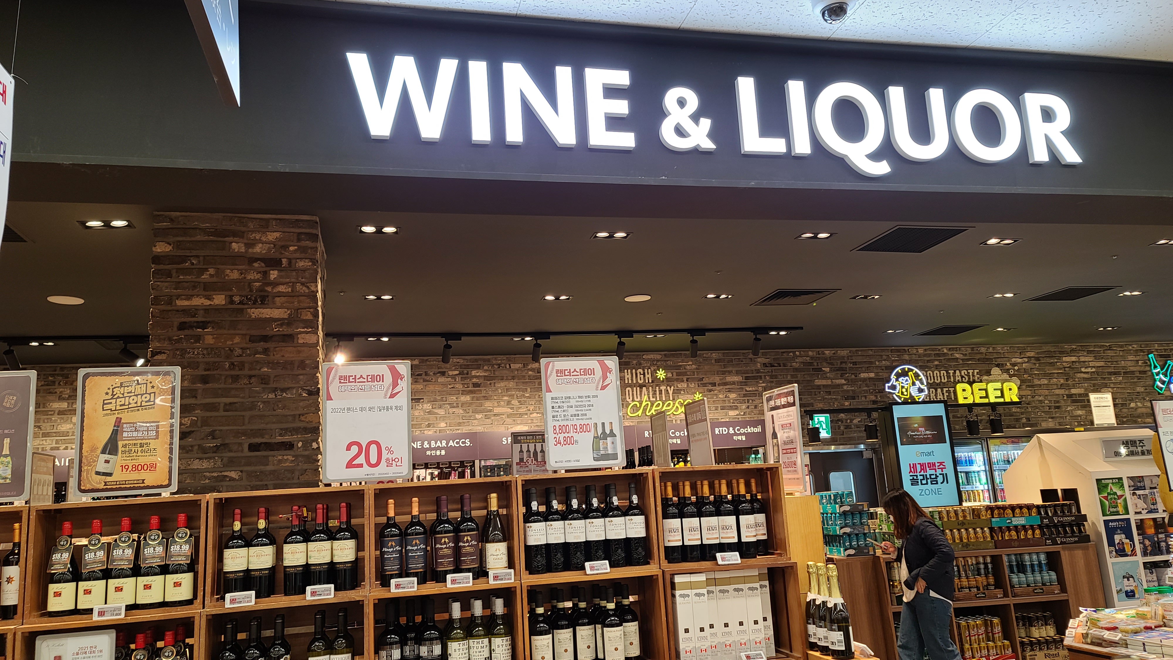 정면에서 보이는 주류 진열대를 사진으로 담아봅니다. 양주, 칵테일, 와인, 샴페인, RTD 등 주류카테고리별로 다양한 제품들이 진열되어 있는것이 보입니다.