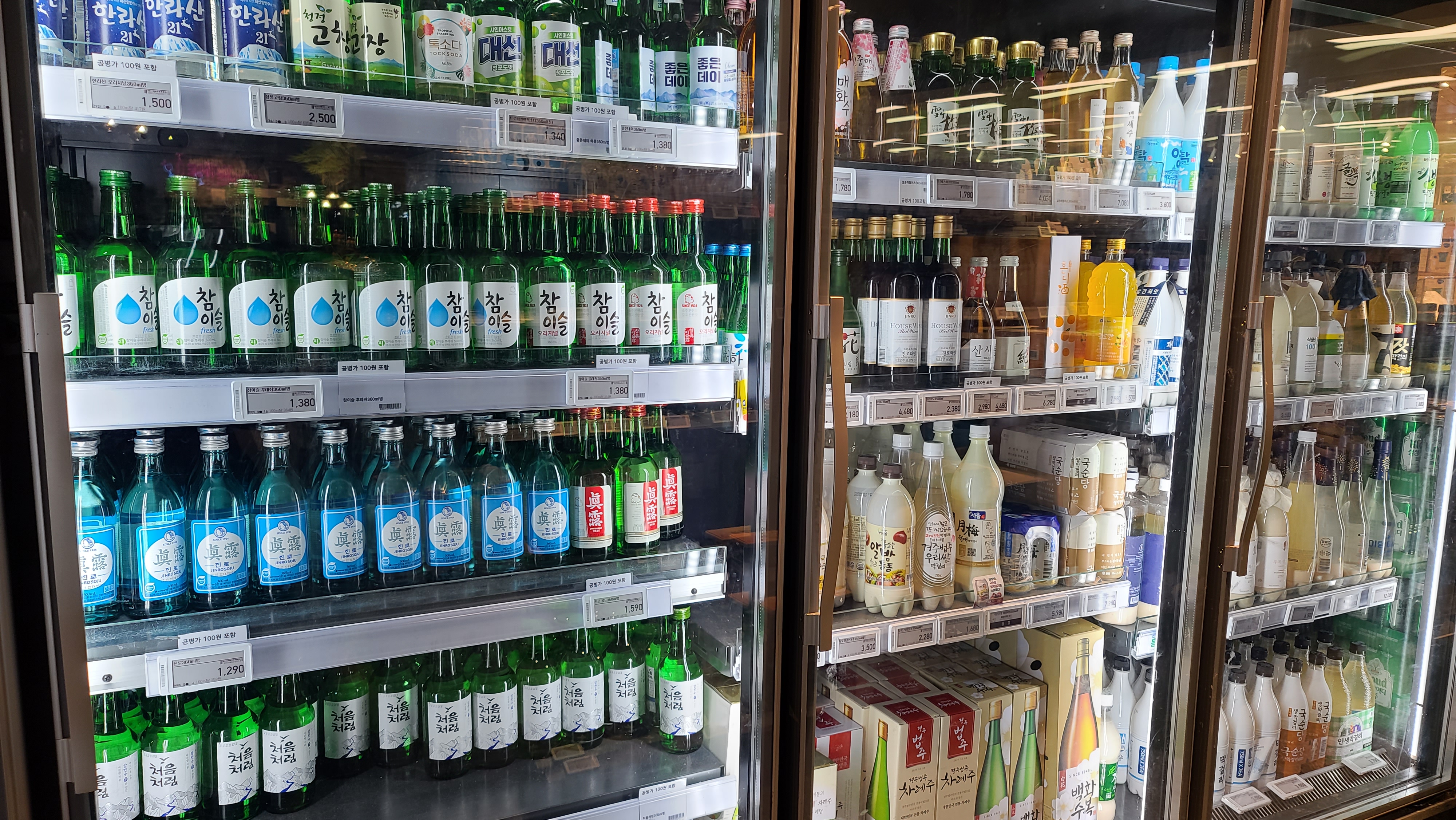 와인에 이어 인기가 좋은 맥주 매대를 지나면 한라산, 참이슬, 진로, 처음처럼, 대선, 좋은데이 등의 소주 냉장고가 보이고 그 옆으로는 다양한 막걸리와 청주 제품이 진열되어 있는것이 보입니다.