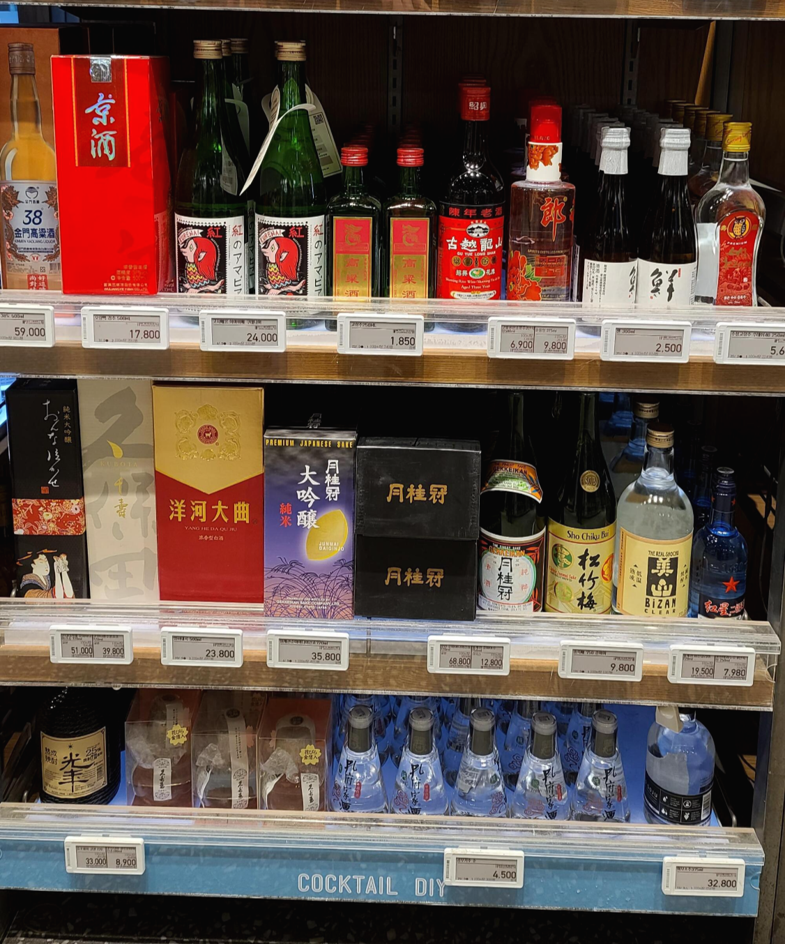 금문고량주, 오량액 경주, 코자에몽 아마비에 쿠레나이, 고량주, 소흥황주, 순품랑, 센, 수성고량주 등 백주가 진열된 아래로는 온나나카세, 쿠보타 만쥬, 양하대곡, 월계관 쥰마이다이긴죠, 호린 준마이다이긴죠, 월계관 준마이, 송죽매, 월계관 비잔클리어, 홍성 이과두주 8년이 보입니다. 맨 아래로는 여보소주, 공부가주 기타 사케가 진열되어 있습니다.