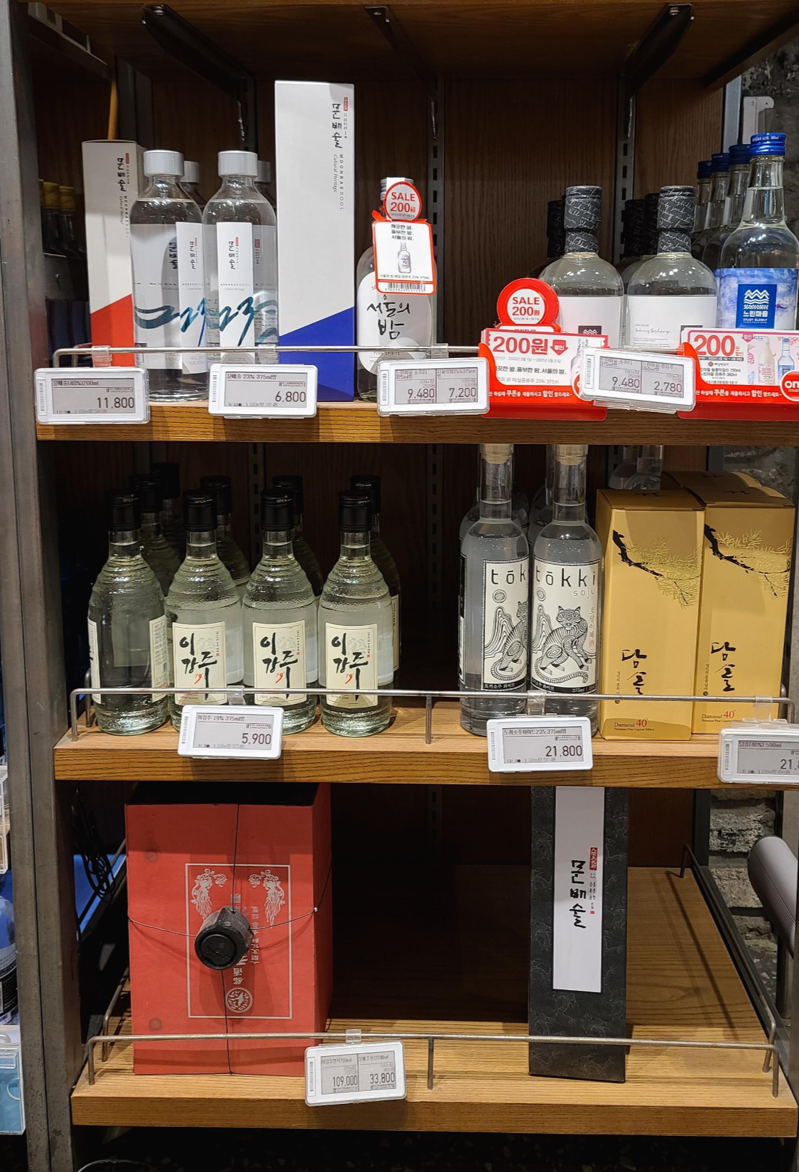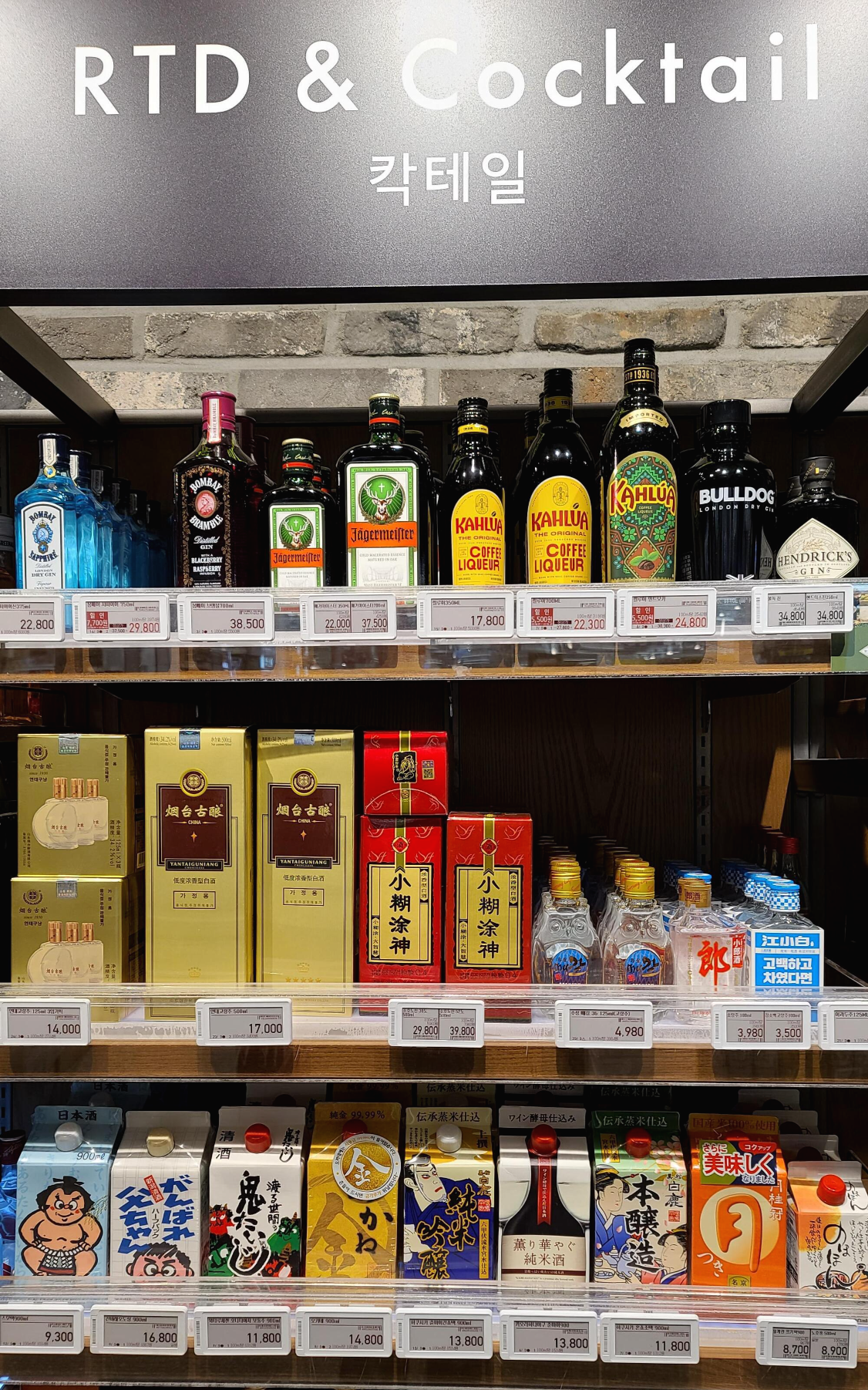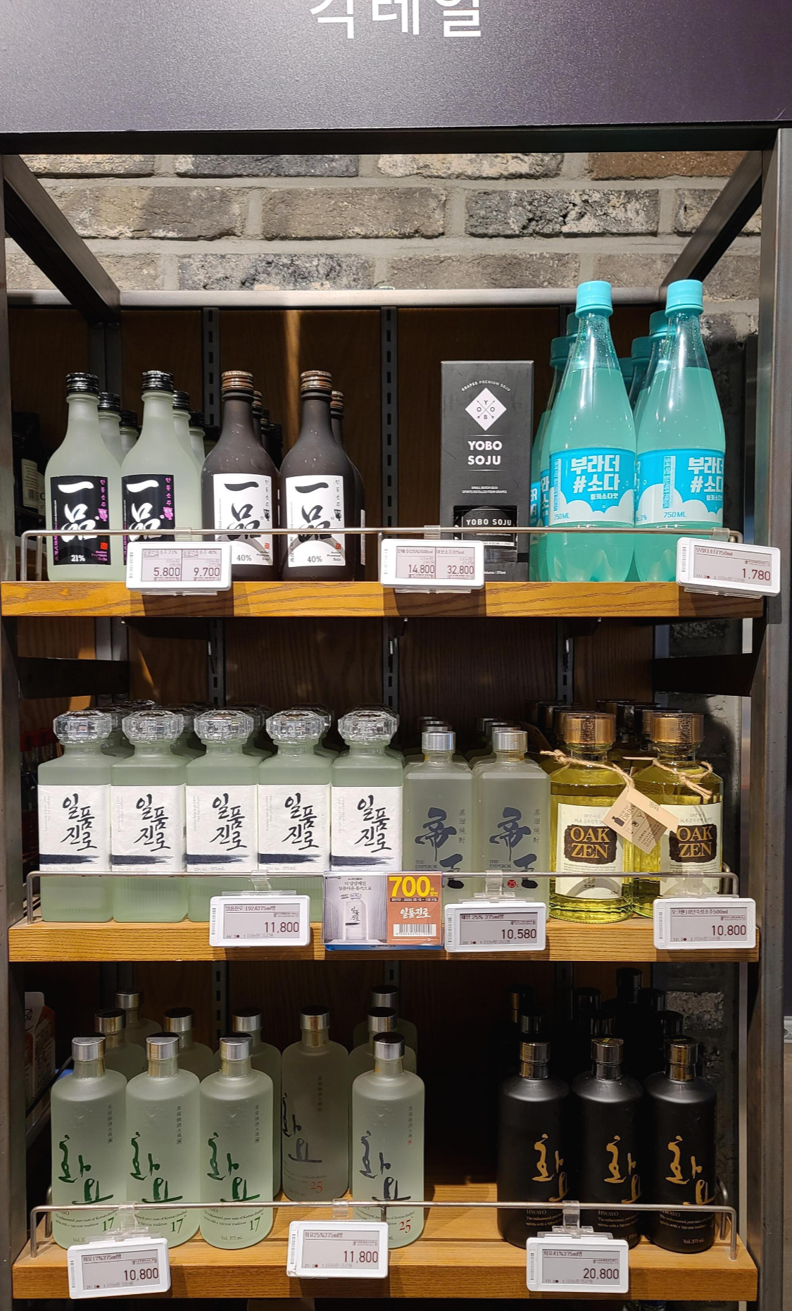 가장자리 칵테일과 RTD 진열대부터 살펴보니 일품안동소주, 여보소주, 일품진로, 제왕, 오크젠, 화요, 문배술, 서울의밤, 느린마을, 이강주, 토끼소주, 담솔, 문배주 등의 전통소주가 보이고 부라더 소다 RTD 제품도 보입니다.