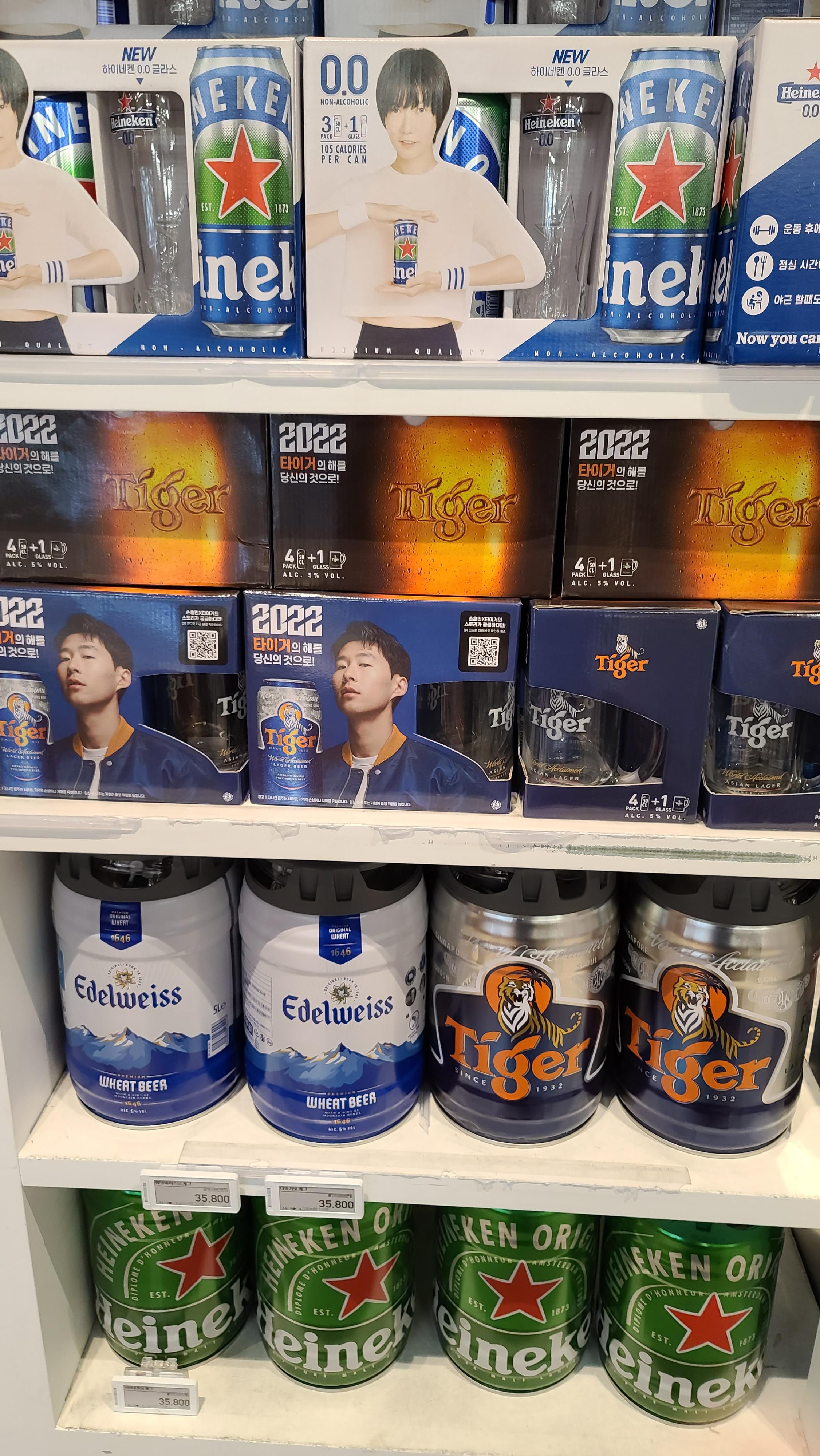 캔맥주 외에도 한쪽으로는 하이네켄, 에델바이스, 타이거 등 유명한 맥주들의 대형 케그가 보이고 전용 글래스를 제공하는 세트도 보이고 있습니다.