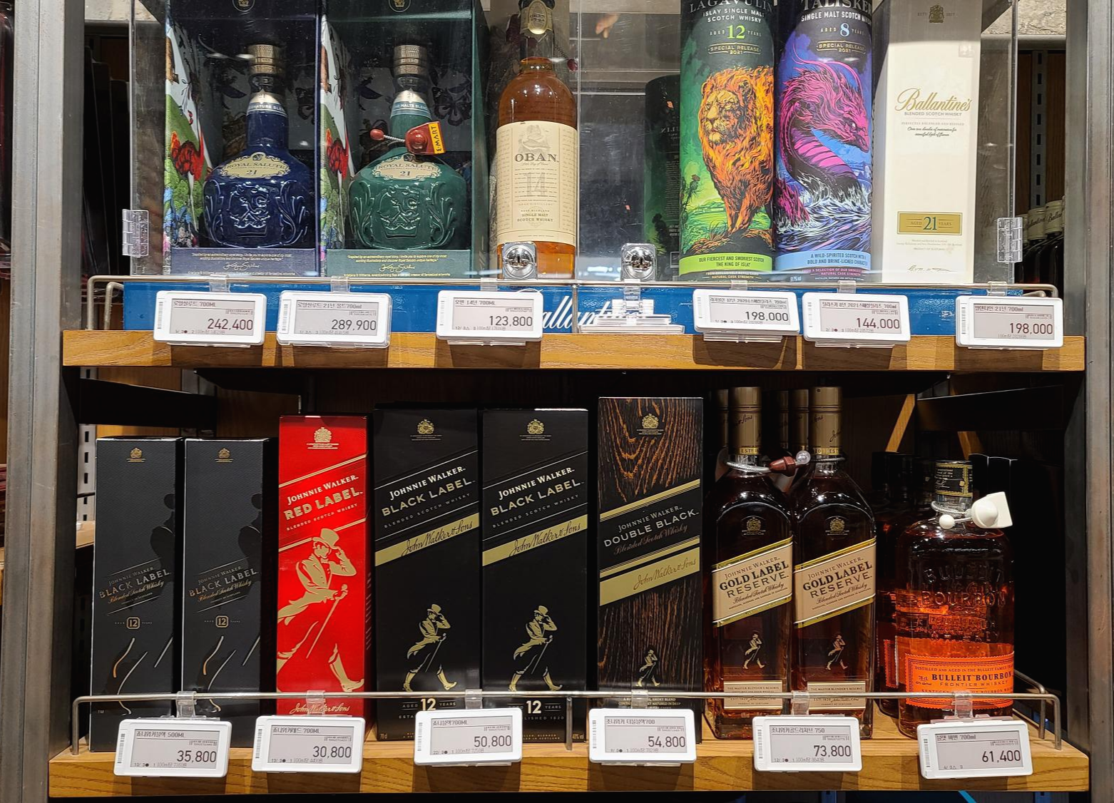 양주코너의 마지막 진열대를 살펴봅니다. 로얄살루트, 오반, 라가불린 12년 스페셜릴리즈, 탈리스커 8년, 발렌타인 21년, 조니워커블랙, 죠니워커레드, 죠니워커 더블블랙, 조니워커 골드, 블랙 버번 위스키가 진열되어 있습니다.