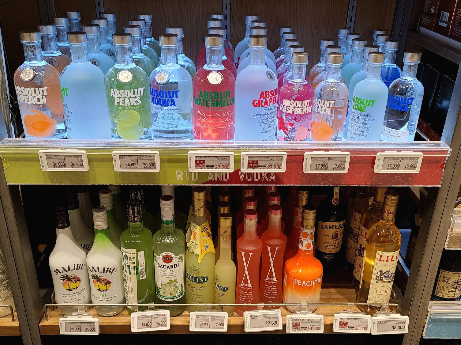 양주 Spirits 아래쪽으로는 앱솔루트 어피치, 라임, 피어스, 워터멜론, 자몽, 라즈베리, 블루 등의 보드카 시리즈와 더 아래쪽으로는 말리부, 카리브모히또, 바카디 모히또, 팔리니, 엑스레이티드, 피치트리, 릴렛 블랑 제품이 진열되어 있습니다.