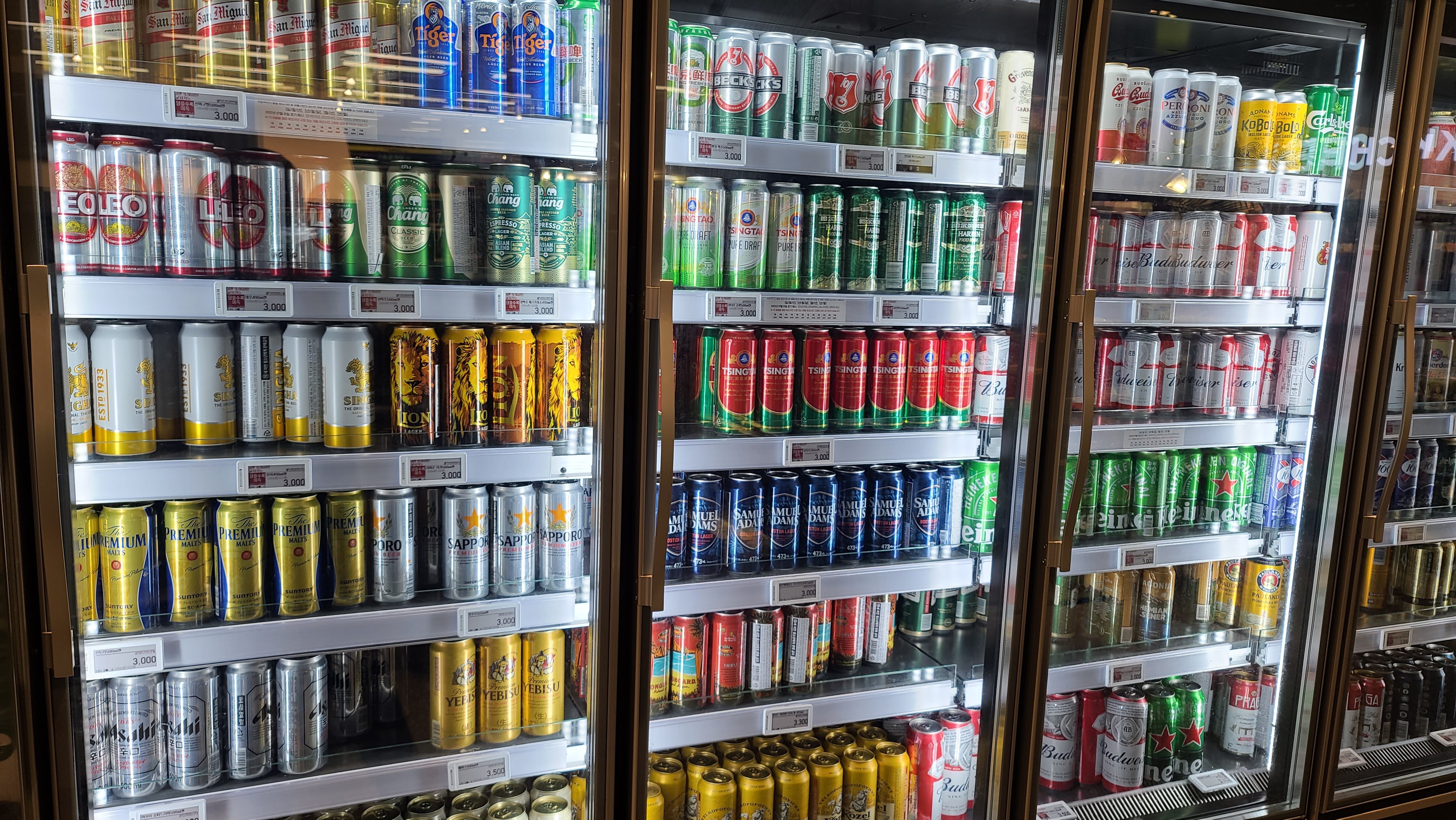 긴 와인매대가 끝나고 끝쪽으로는 맥주 냉장고가 보입니다. 산미겔, 칭따오, 아사히, 벡스, 버드와이저 등 다양한 수입맥주가 끝도없이 채워져 있는 모습입니다.