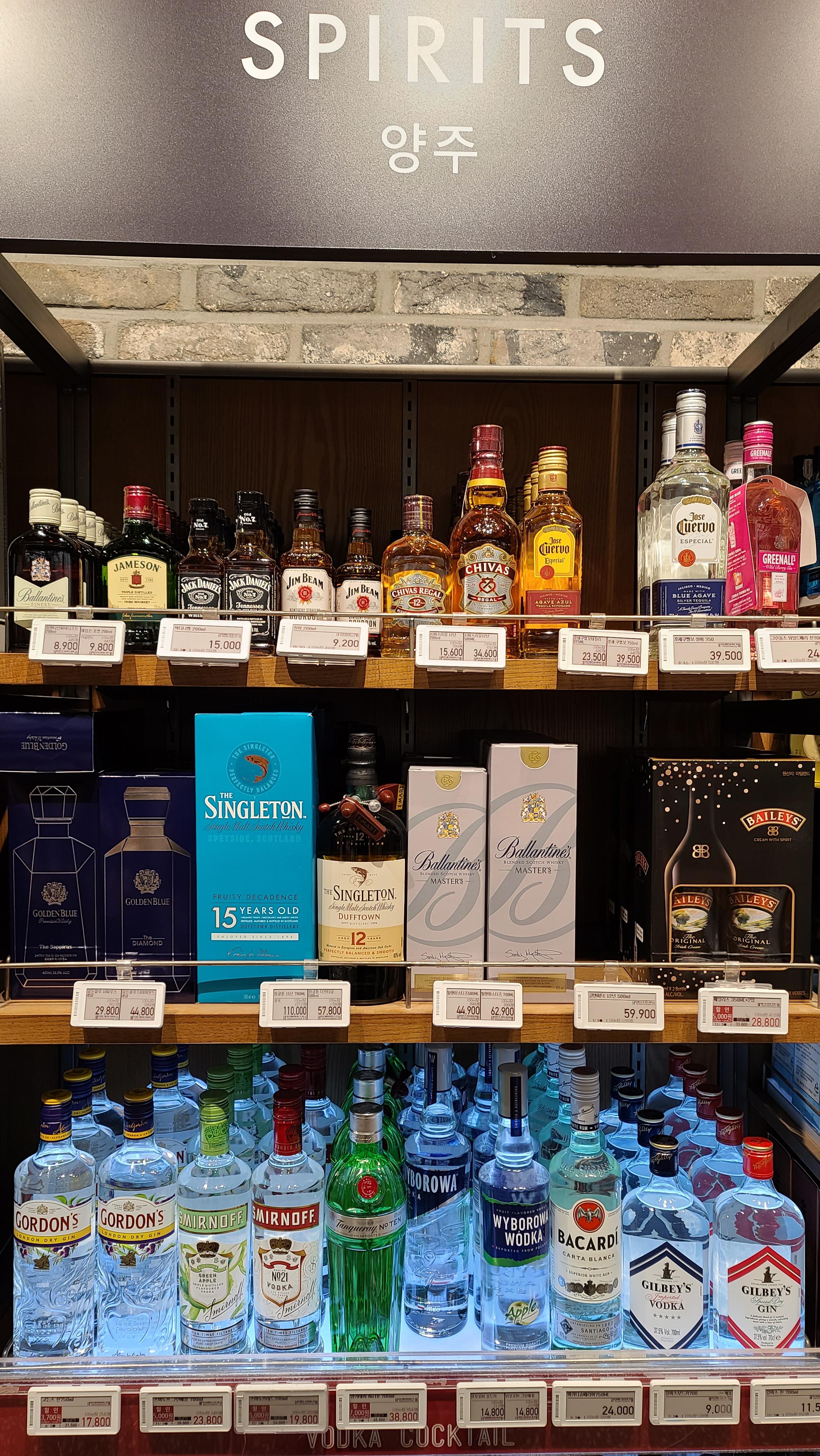 이어서 이마트 양주코너를 살펴봅니다. 발렌타인 파이니스트, 제임슨, 잭다니엘, 짐빔, 시바스리갈, 호세쿠엘보, 그린올즈 와일드베리, 베일리스, 글렌피딕, 발렌타인 마스터즈, 싱글톤 더프타운, 골든블루 사피루스, 다이아몬드, 고든스, 스미노프, 탱커레이, 위보로비, 바카디, 길비스 보드카, 진 등 다양한 위스키와 진, 보드카 등이 진열되어 있습니다.