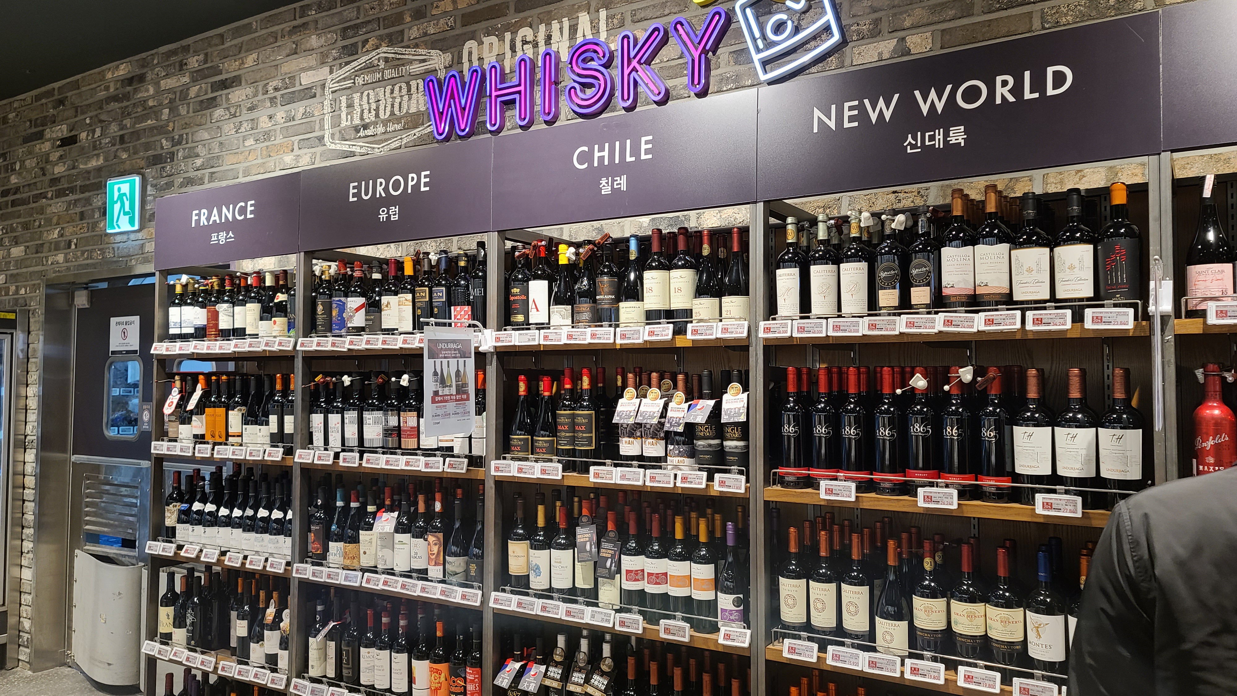 왼쪽으로 이동하여 와인제품 진열대도 살펴보기로 합니다. 와인이 진열되어 있고 상단에 위스키라고 표시되어 있는 것이 상당히 재미있게 생각됩니다. 이마트 와인 진열대는 프랑스, 유럽, 칠레, 신대륙의 카테고리로 나뉘어져 있는 모습입니다.