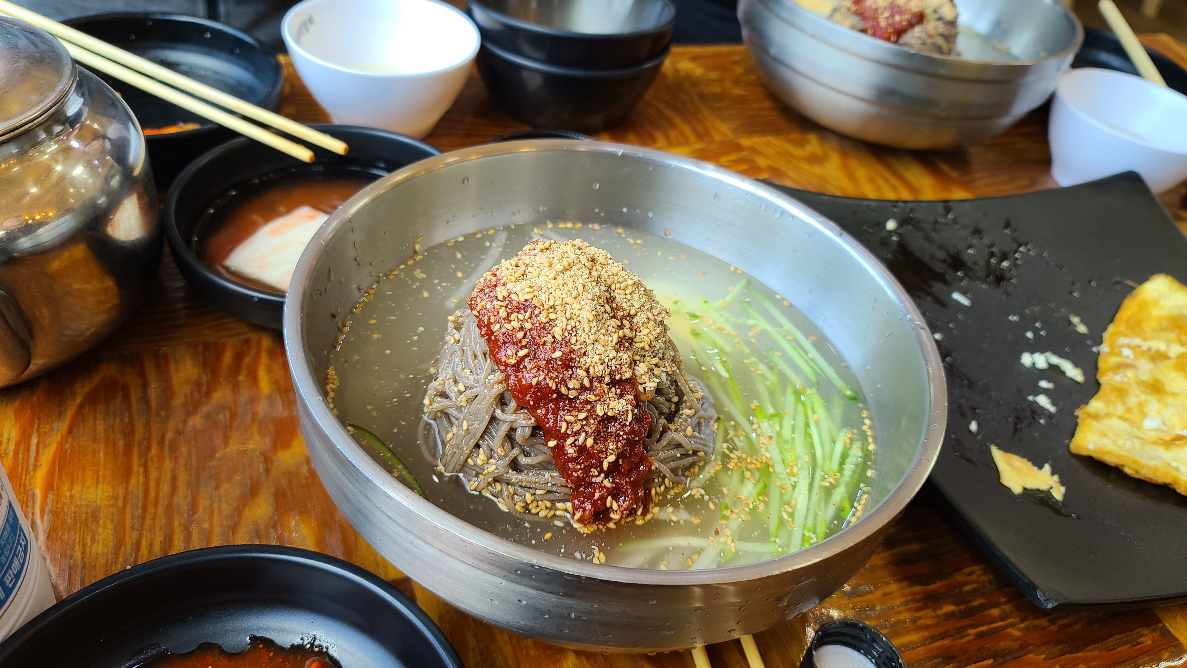 두부와 막걸리에 이어서 메인메뉴인 막국수가 나왔습니다. 100% 메밀면에 시원한 육수와 비법 양념장 그리고 깨가루를 듬뿍 뿌려 고소한 맛을 자아내는 강원도 토속 막국수로 시원하게 배를 채우고 마무리를 합니다. 골프장에 가기전 밥대신 매우 조화로운 식사가 아닐수 없습니다.