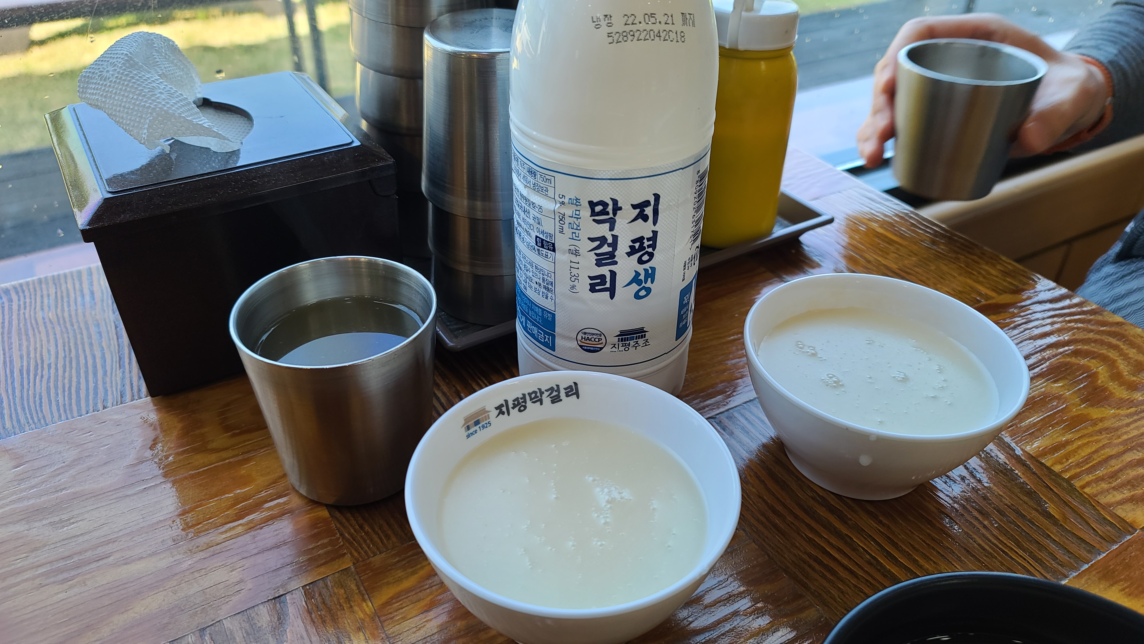 주문을 마치고 잠시기다리자 막걸리와 반찬을 세팅해 주셨습니다. 메밀가 근처에 지평막걸리 양조장이 위치하고 있기 때문에 막걸리는 지평으로 통일되어 있는 모습입니다. 가볍게 목을 축이고 경치를 감상하며 음식을 기다려봅니다.