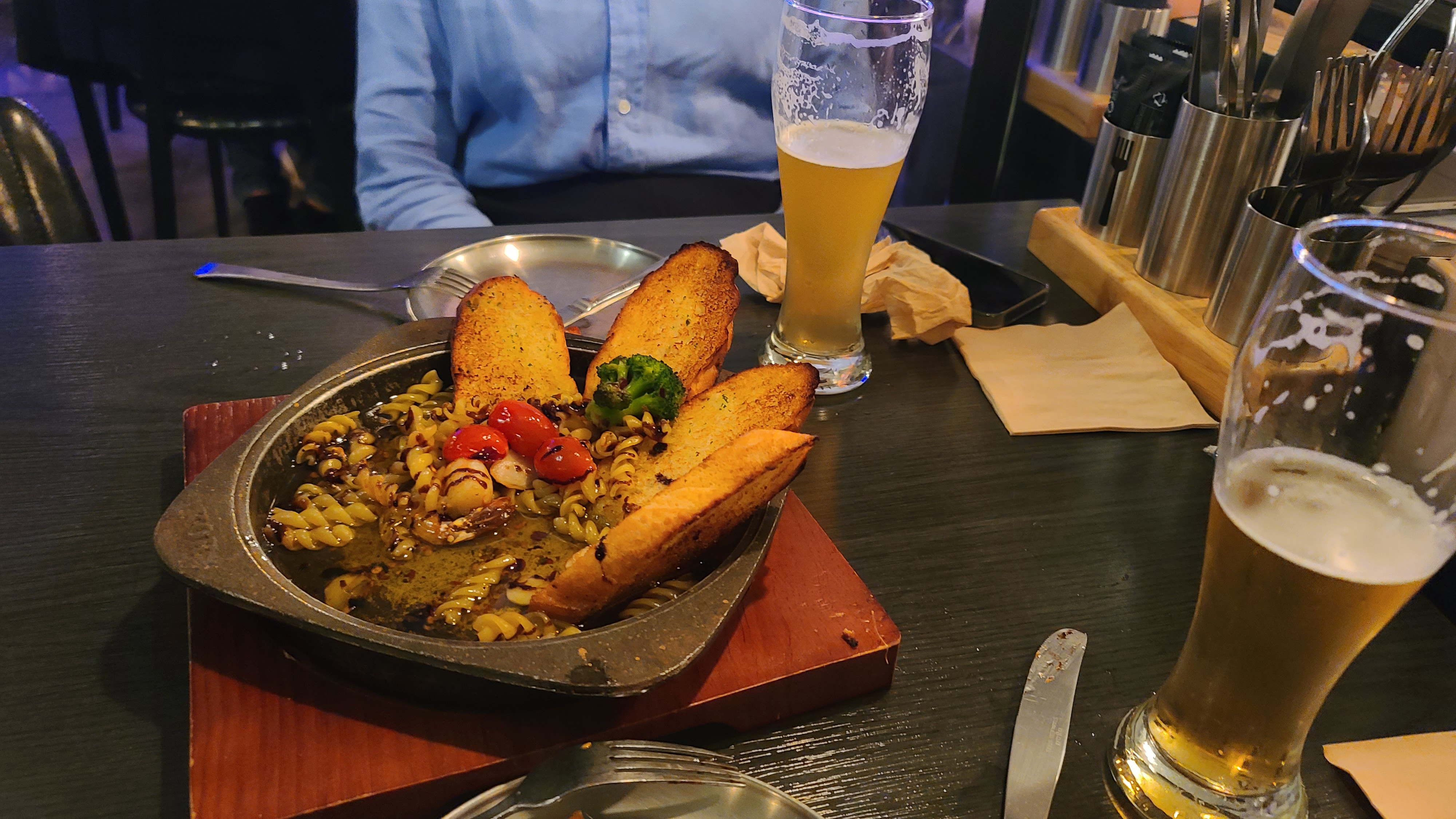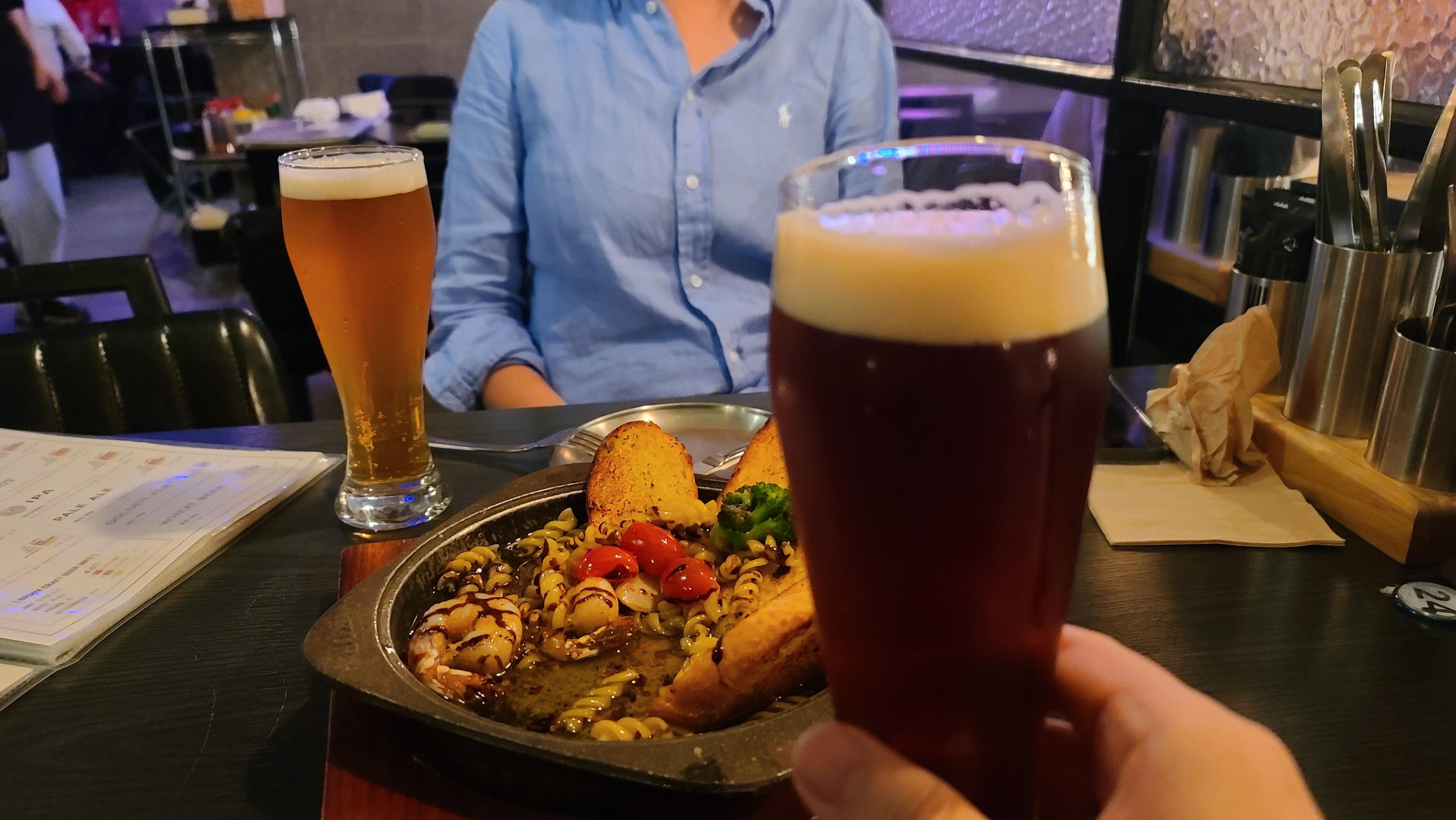 첫번째 맥주와 안주가 나왔습니다. 배경에 꽃이 있어 설정샷 놀이를 하며 수제맥주를 즐겨봅니다. 아메리칸 라거 프레시는 전형적인 깔끔한 라거맥주의 맛으로 첫잔을 시작하기에 매우 좋았습니다만 안주로 시킨 감바스는 발사믹소스를 뿌려서 나와 맛의 균형이 맞지를 않았습니다. 감바스가 느끼한 갈릭향으로 먹는 건데 여기에 시큼한 발사믹소스를 뿌려서 느끼함을 잡으려 하다니 무언가 실패작이 아닐수 없습니다.