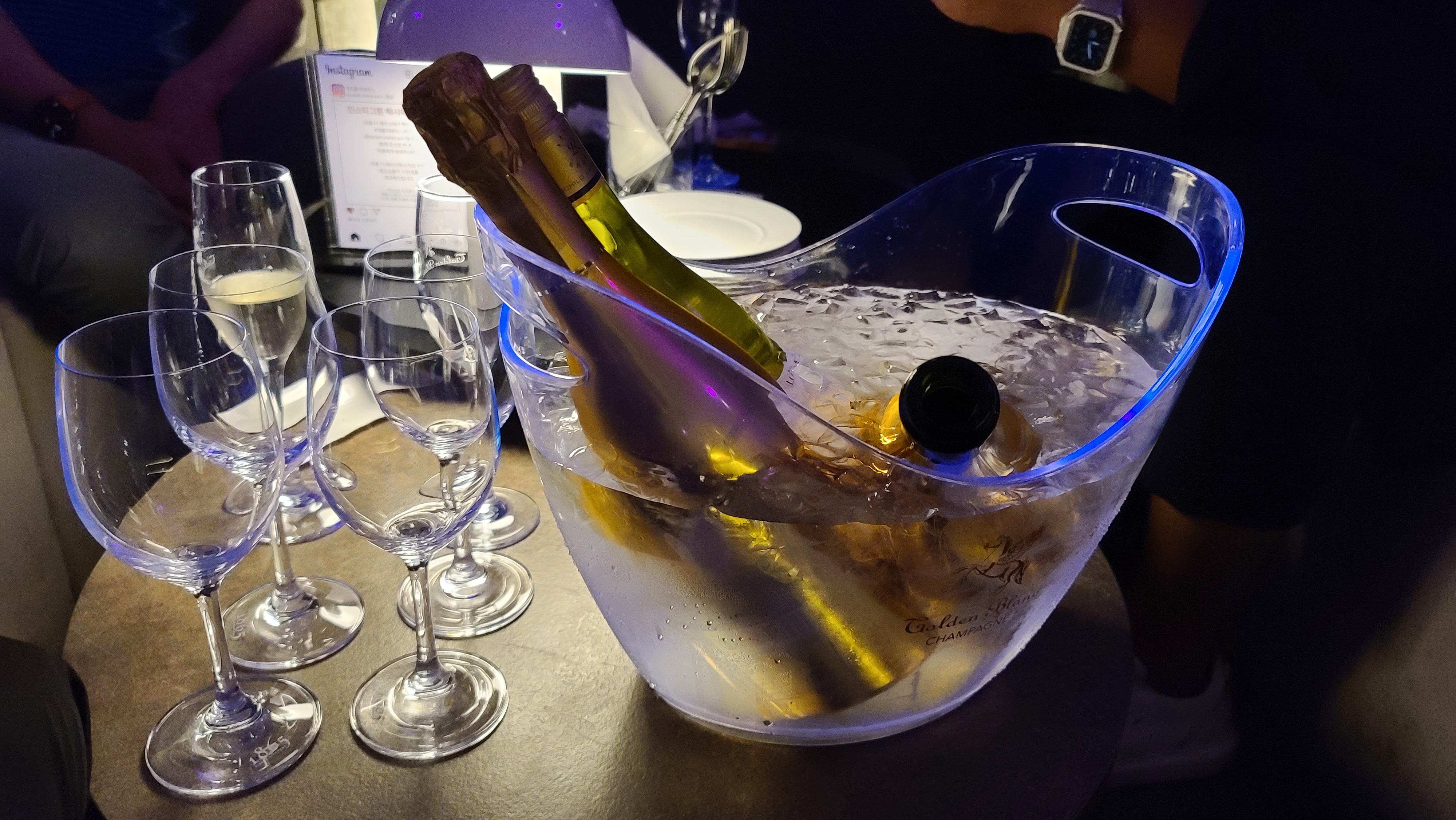 주문한 골든블랑과 화이트 와인이 나왔습니다. 차가운 아이스버킷에 칠링되어 샴페인잔과 함께 서빙되어진 모습입니다. 황금색 샴페인병을 테이블에 올려두니 눈에 확 띄는게 무언가 주목받는 기분을 들게 합니다.