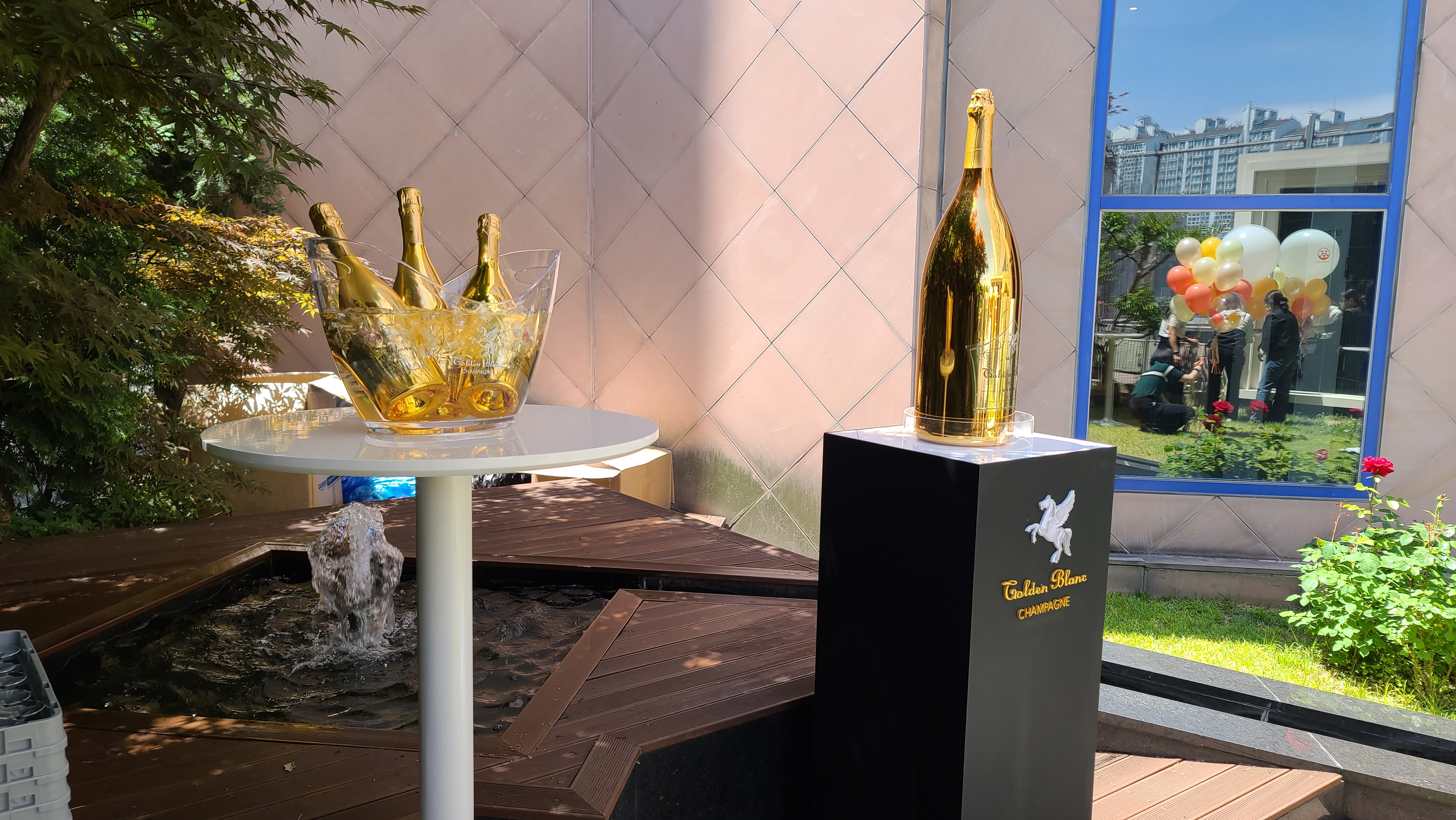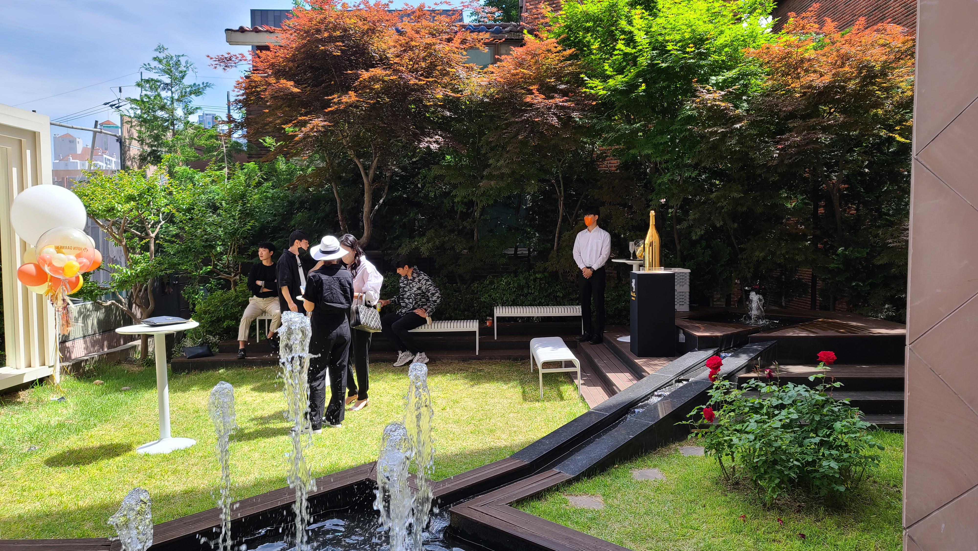분수대가 설치되어 있고 나무들로 그늘진 한곳에서 전시된 대형 샴페인 병이 상당히 인상적입니다. 이렇게 다양한 포토존들로 많은 사람들이 저마다 사진을 찍으면서 혼가먼트 골프웨어 청담점의 오픈행사를 즐기고 있습니다.