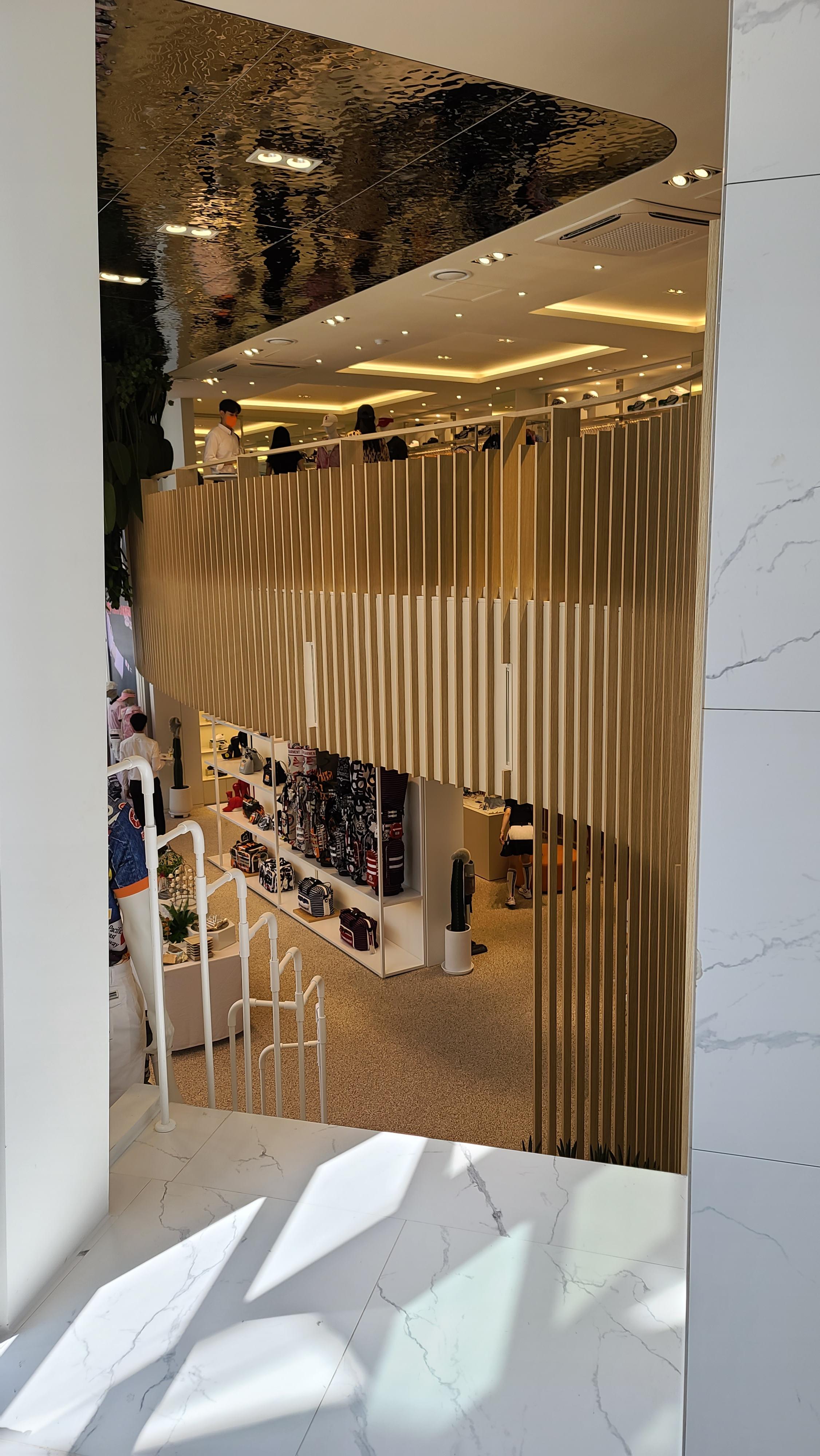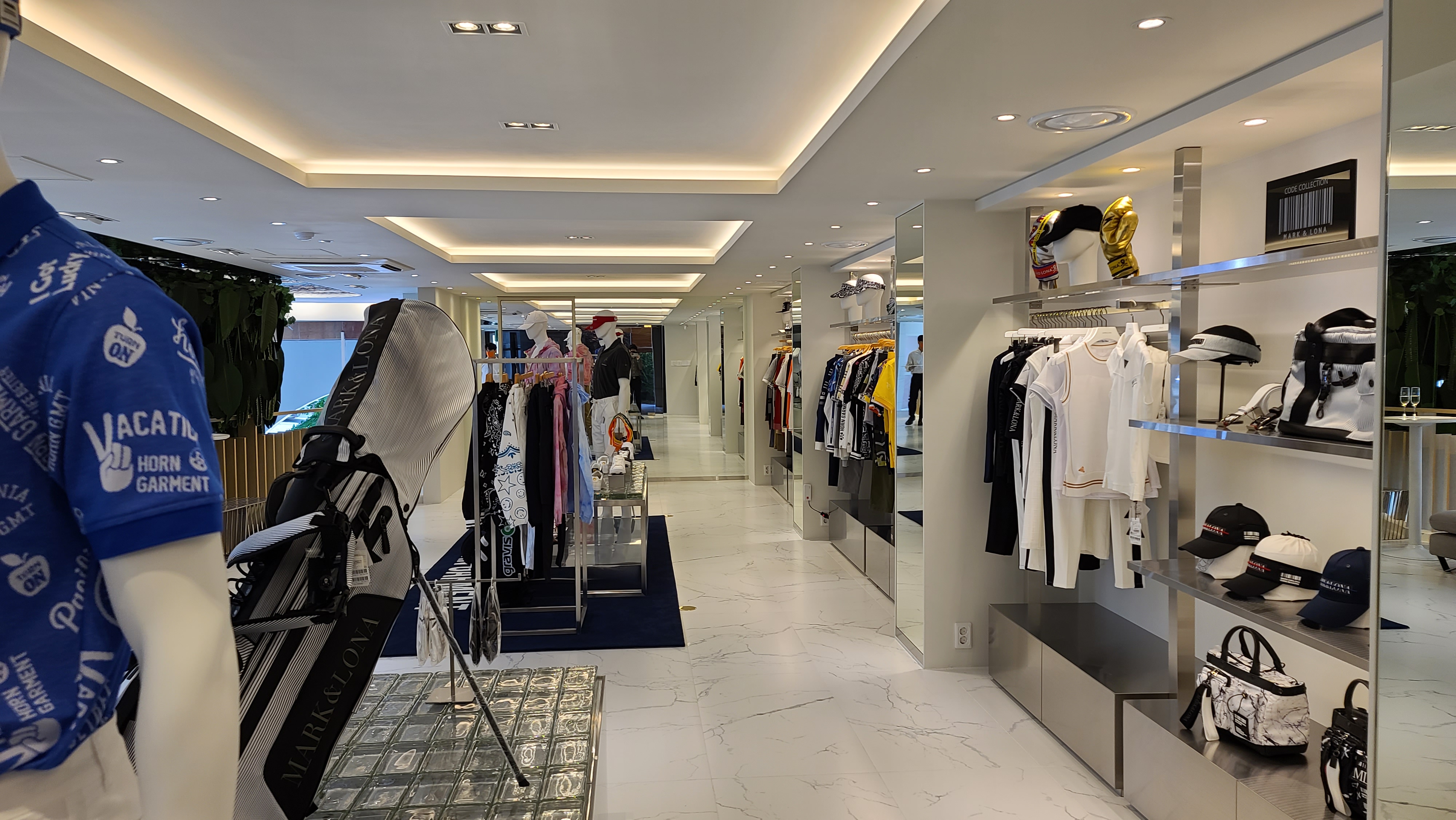 입구를 들어가서 살펴보니 봄날에 맞는 산뜻한 파스텔톤의 골프웨어들이 전시되어 있고 세로형 대형 LED화면에서는 혼가먼트의 브랜드 영상이 흘러나오고 있습니다. 외관과 입구에서부터 상당히 럭셔리한 인상을 심어주고 있습니다.