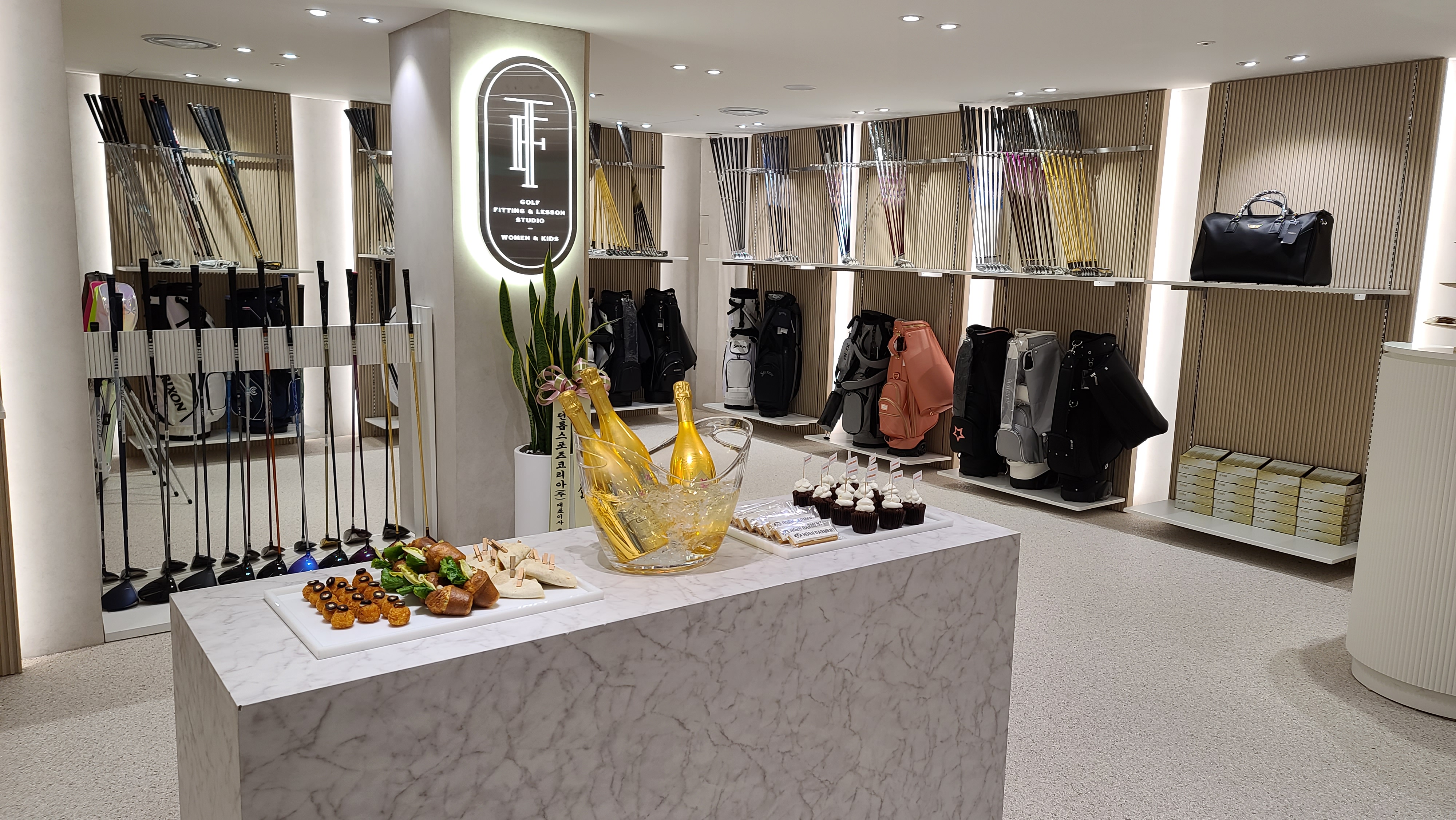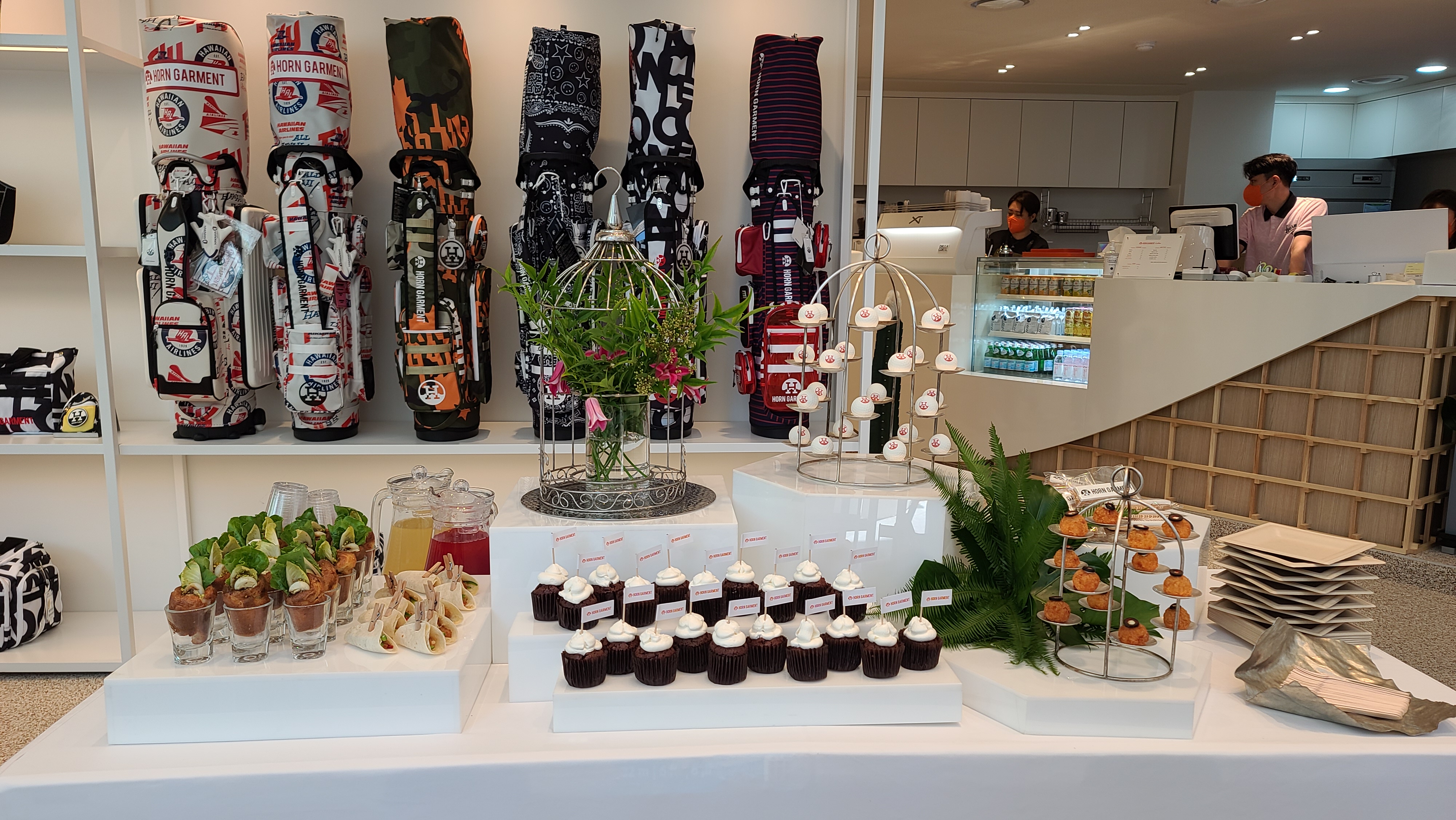 혼가먼트 청담점의 지하로 내려가면 골프클럽과 골프백 그리고 샤프트와 헤드를 상세하게 살펴볼수가 있도록 디자인 해놓은 모습입니다. 오픈행사여서 그런지 이쪽에서 다양한 음식과 고급스러운 샴페인을 세팅해 놓은 모습이 인상적입니다.