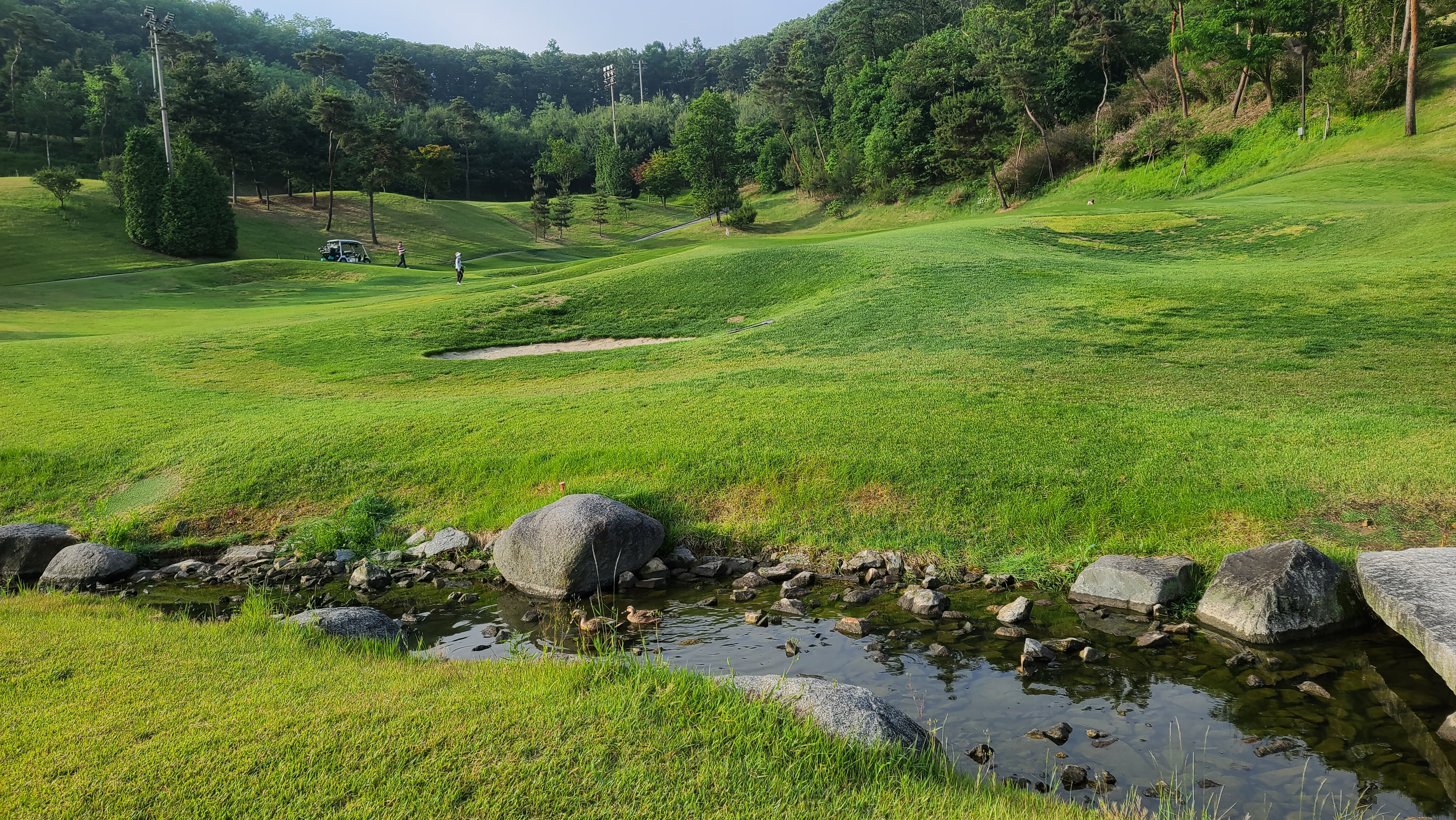 포천힐스 컨트리클럽의 코스는 대체적으로 긴전장을 보여주고 있으며 어느정도 비거리가 나와줘야 파4도 2온에 성공할수가 있습니다. 다만 코스 중간중간 사진처럼 실개천 해저드가 자리잡고 있는 홀이 많으므로 샷전에 캐디분께 상세히 코스에 대해서 물어보고 하는 편이 안전하게 타수관리를 할수가 있습니다.