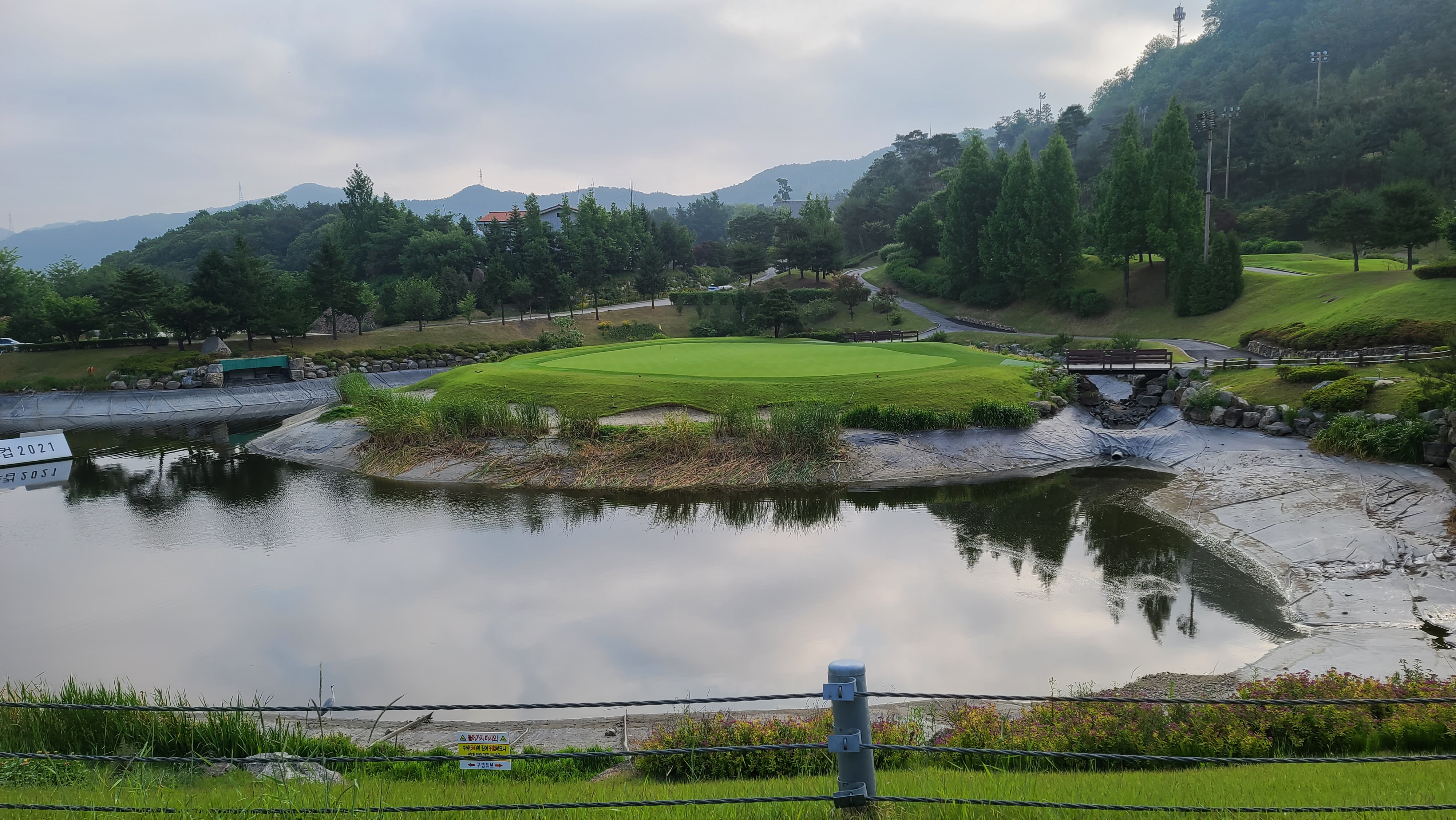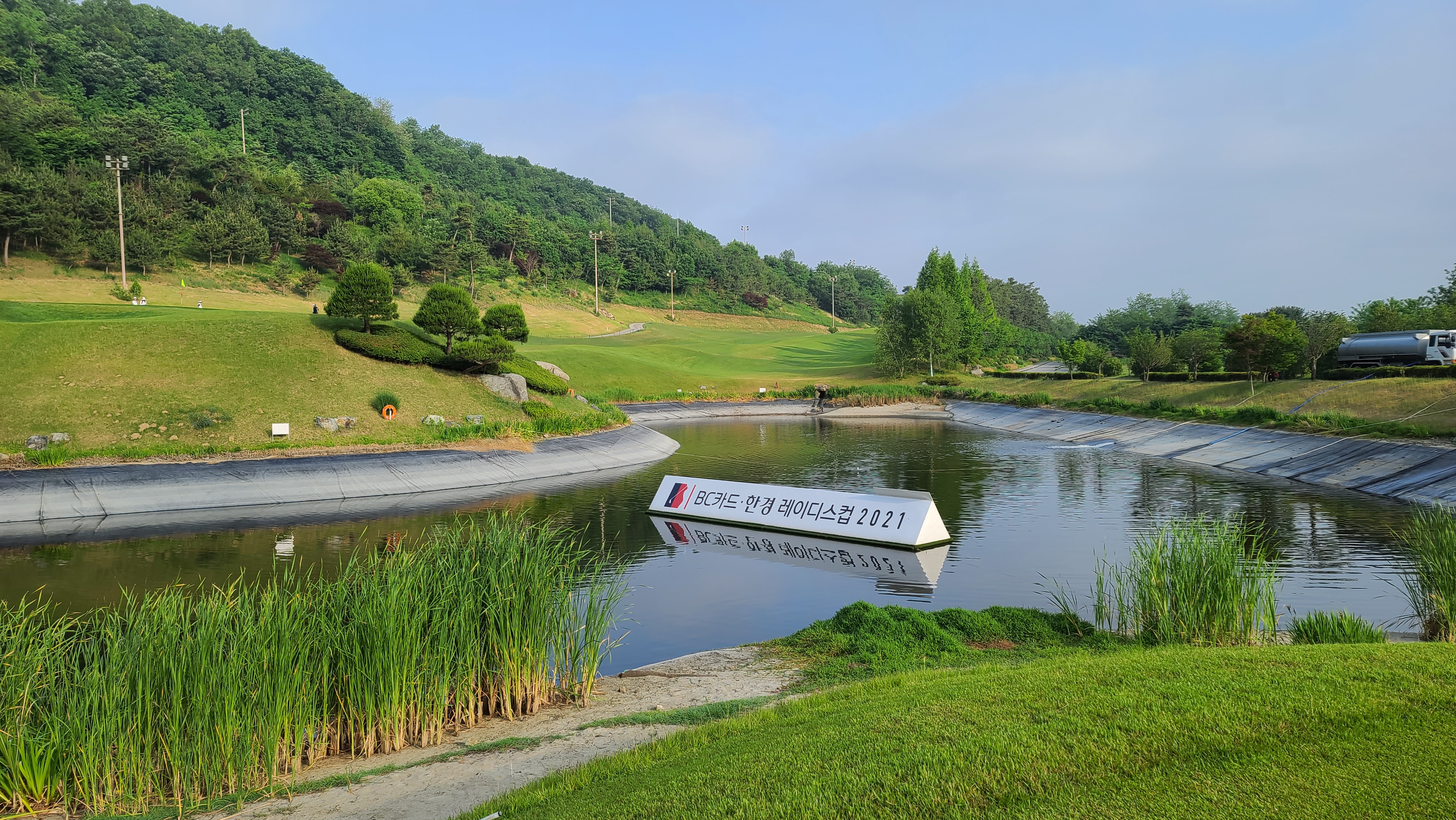 그린에 올라가서 주변을 바라보니 BC카드 한경 레이디스컵 배너가 호수에 설치되어 있는 모습이 인상적이며 마치 대회를 하는 느낌을 즐길수가 있습니다.