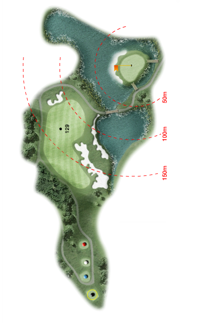 티샷후 세컨샷지점에서 바라본 아일랜드홀은 섬세한 거리감이 요구되며 또한 사진에서도 보이듯 그린쪽으로 내리막 경사가 이루어져 있기때문에 공을 띄우기 어렵게 설계되어 있습니다. 이중 삼중의 숨은 난이도를 보여주는 매우 어려운 코스가 아닐수 없습니다.