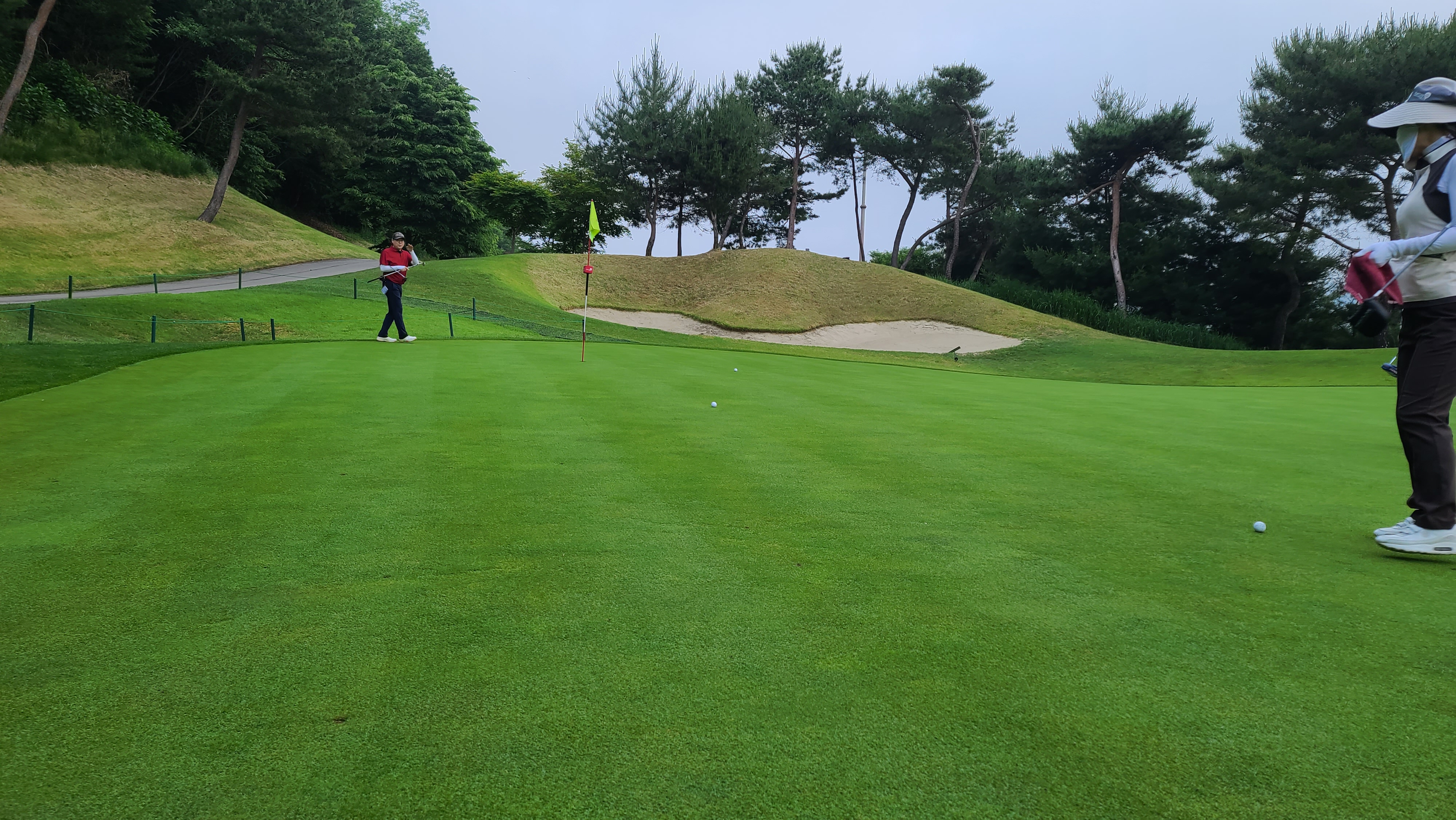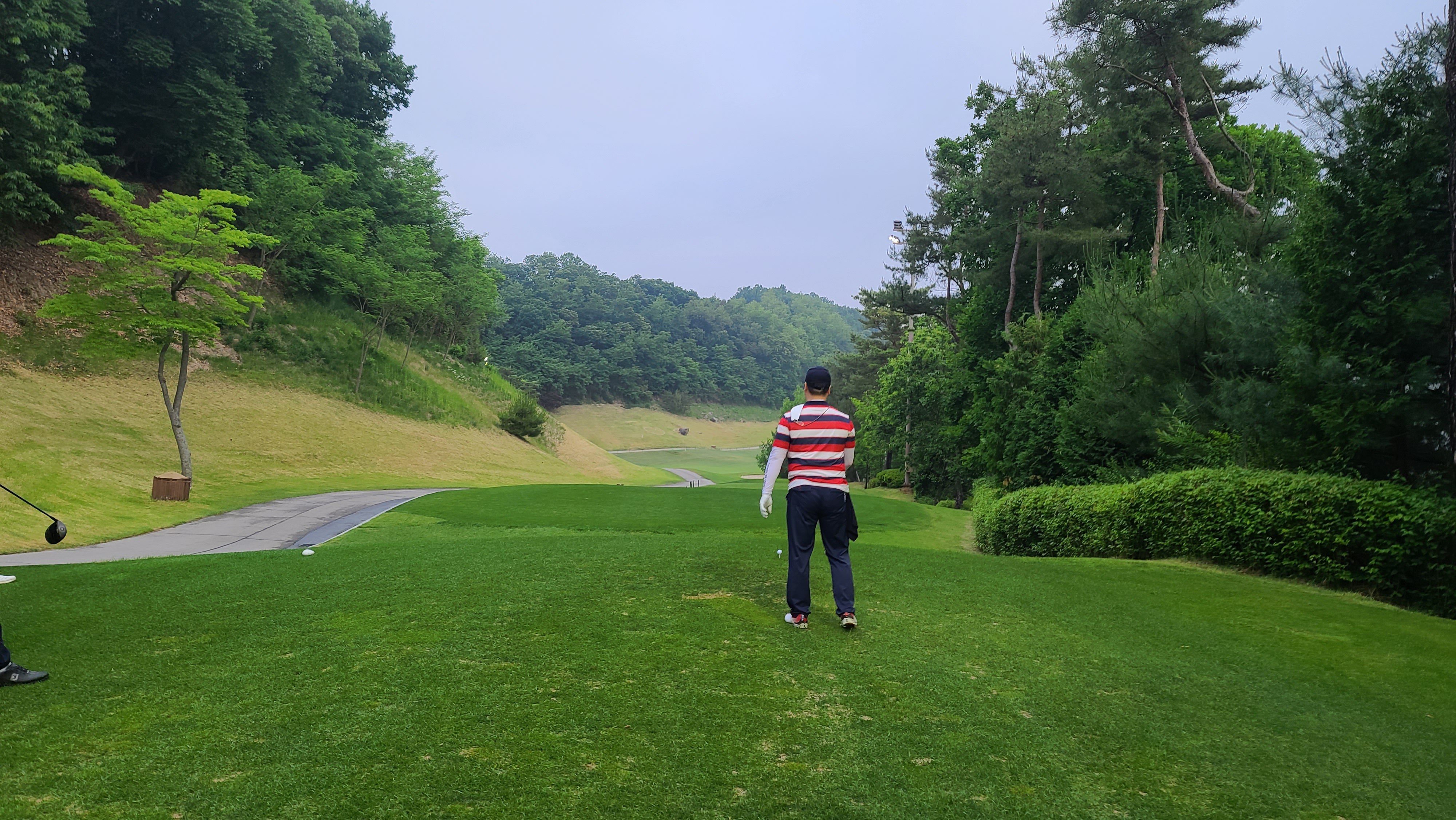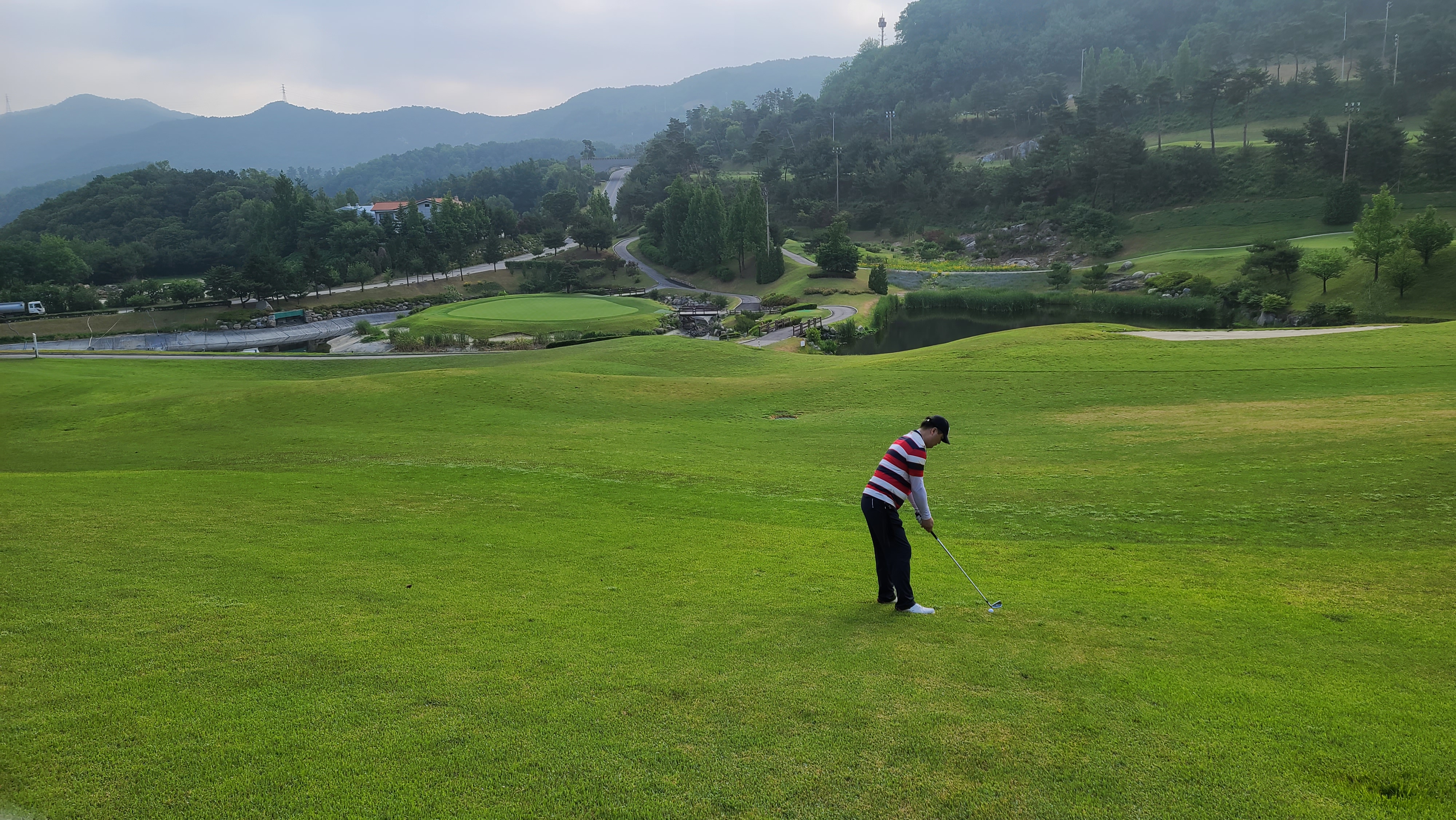 가든코스 4번홀 103m 비교적 짧은 파3홀입니다만 끊어져 있기 때문에 탑핑이나 뒤땅은 매우 위험합니다. 대회를 앞두고 관리차원에서 아이언티샷 지역은 매트가 깔려있는 모습입니다. 쉬운거리이지만 압박감에 당기는 샷을 하는 모습입니다. 역시 아마추어에게 있어 골프는 멘탈관리가 가장 중요한 것이 보입니다.