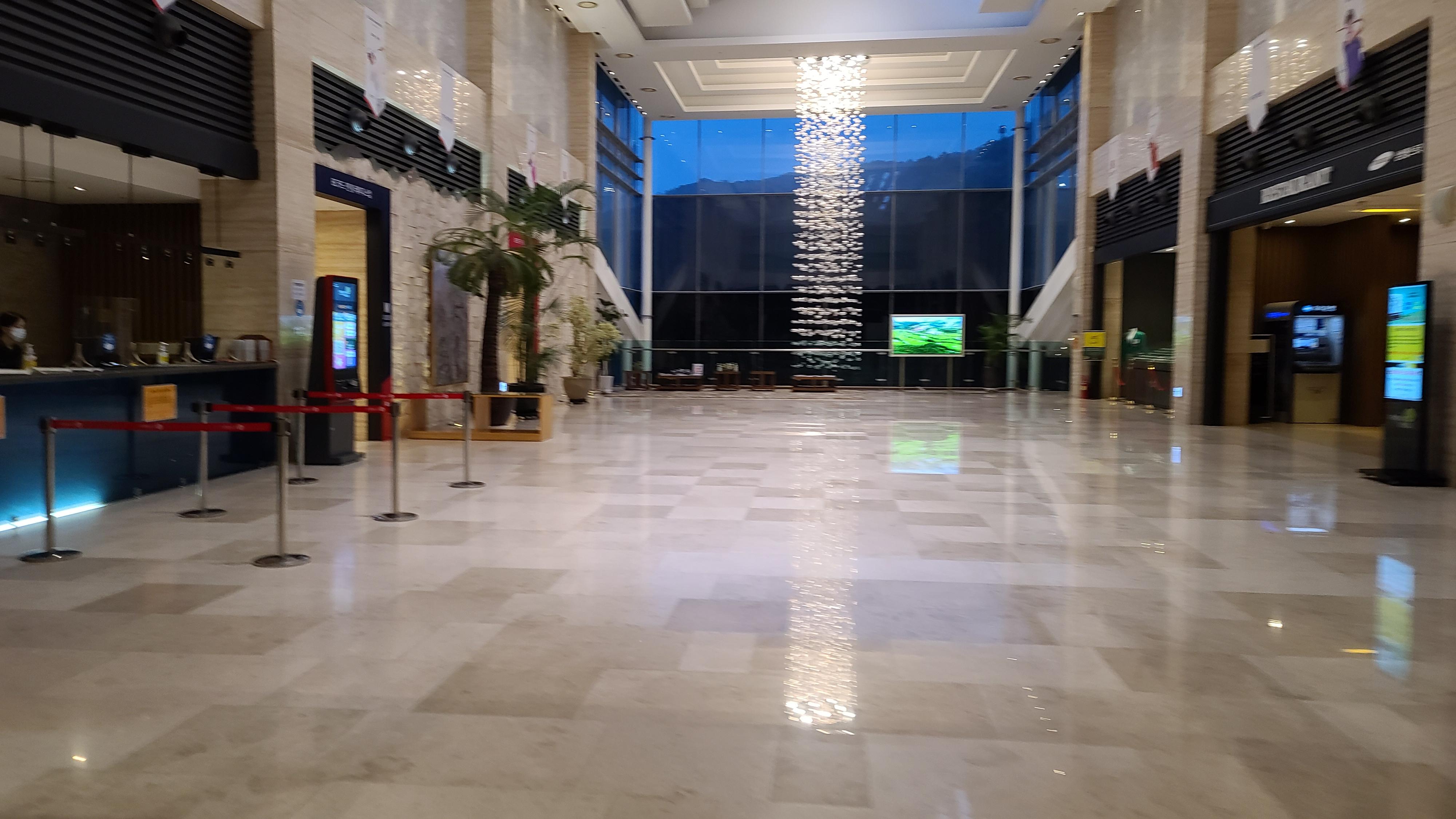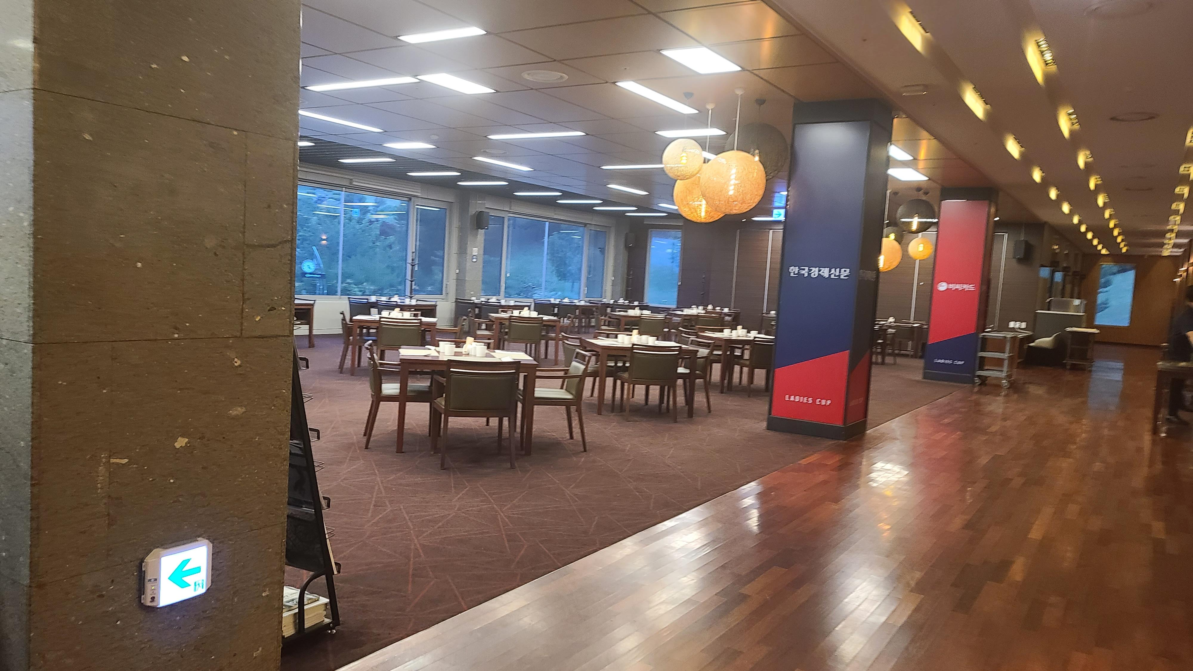 클럽하우스 입구를 보니 한경 레이디스컵 개최 포스터가 붙어 있습니다.대회가 얼마 남지 않았으니 잔디관리가 매우 잘 이루어져 있겠구나 하고 생각을 하며 즐거운 마음으로 입장을 합니다. 클럽하우스 내부는 대리석 바닥에 넓고 고급스러운 인테리어이며 앉을 장소를 모두 없애버려 클럽하우스 식당으로 유도하는 모습이 보입니다.