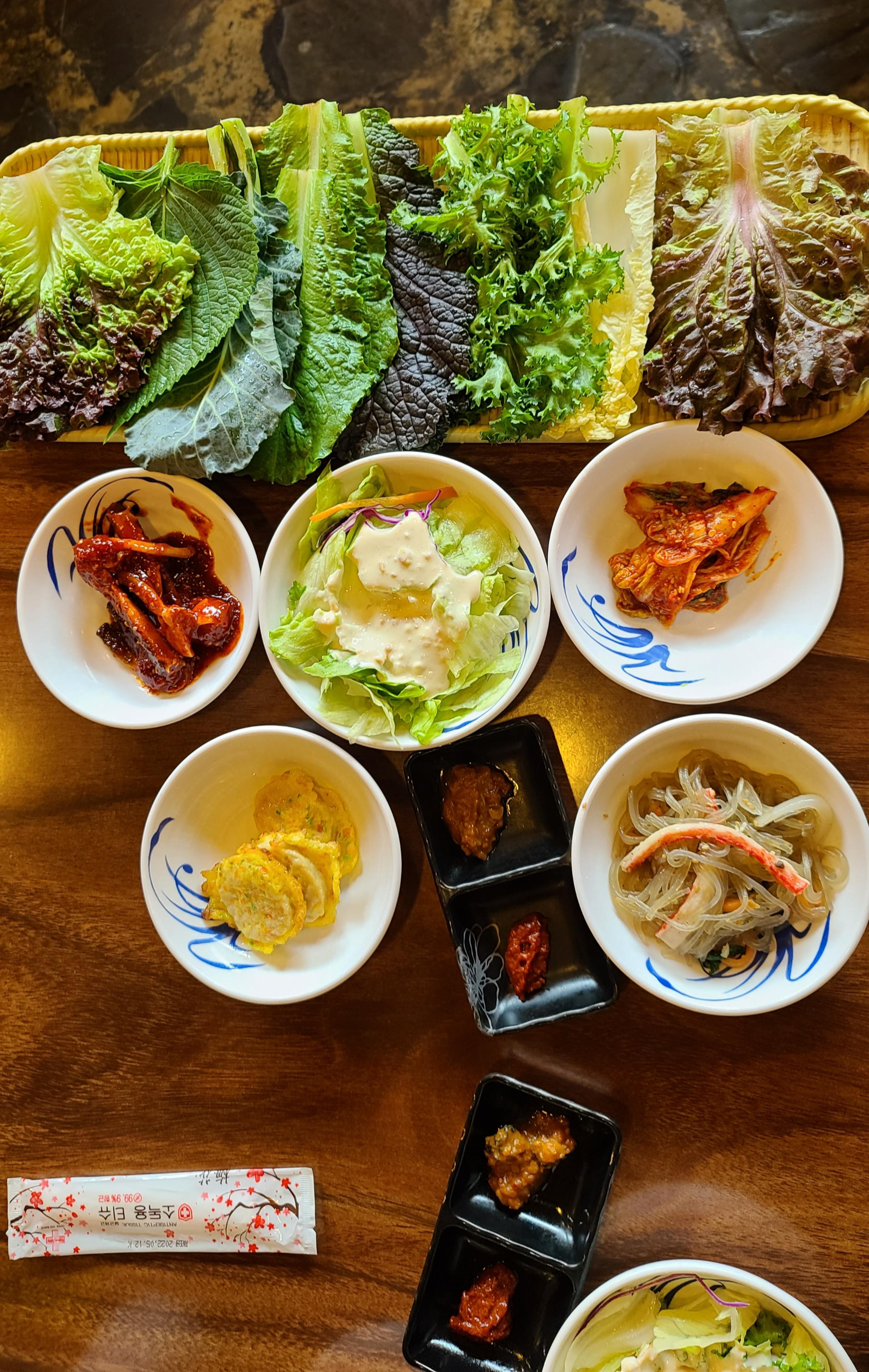 뒤를 이어 제육과 소불고기도 나온 모습입니다. 빨간고기와 담백한 고기의 빛깔이 매우 조화로워 보이며 보기에도 좋은 조합을 나타내고 있습니다. 맛있는 고기와 온갖 쌈채소의 조합이라니 상당히 기대가 되고 있습니다.