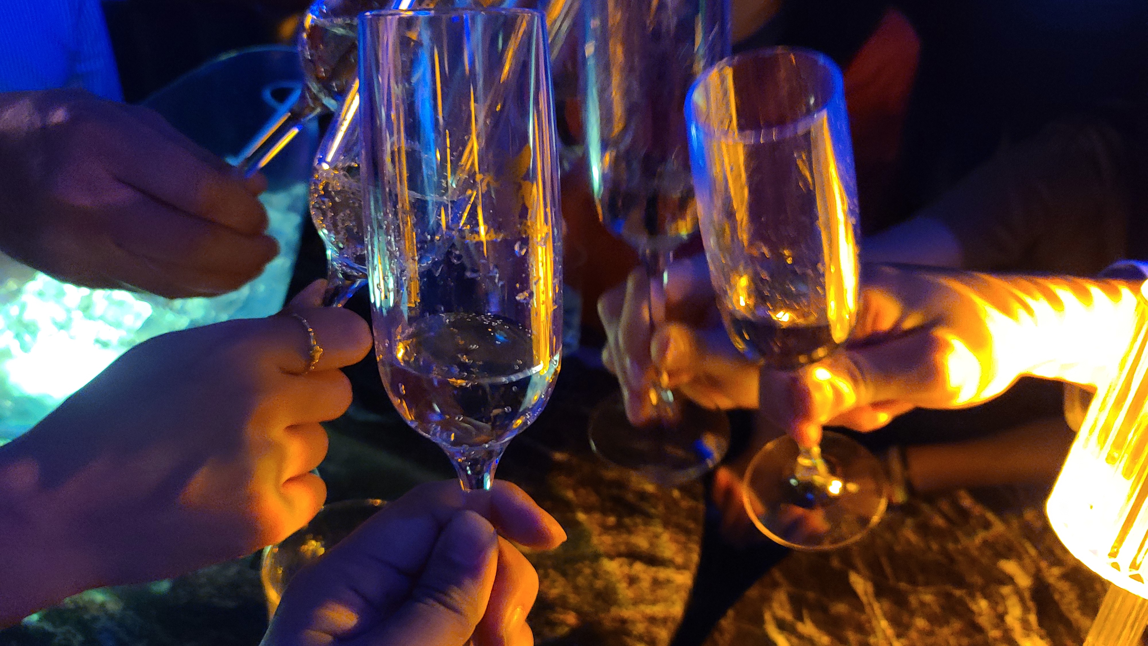주문한 샴페인 세트와 안주가 나왔습니다. 어두운 조명에 황금색 샴페인이 더욱 도드라져 보이고 테이블이 주목받는 느낌이 납니다. 클럽이나 라운지바나 역시 펍에서도 샴페인은 주변의 이목을 끄는 효과가 있는것 같습니다.