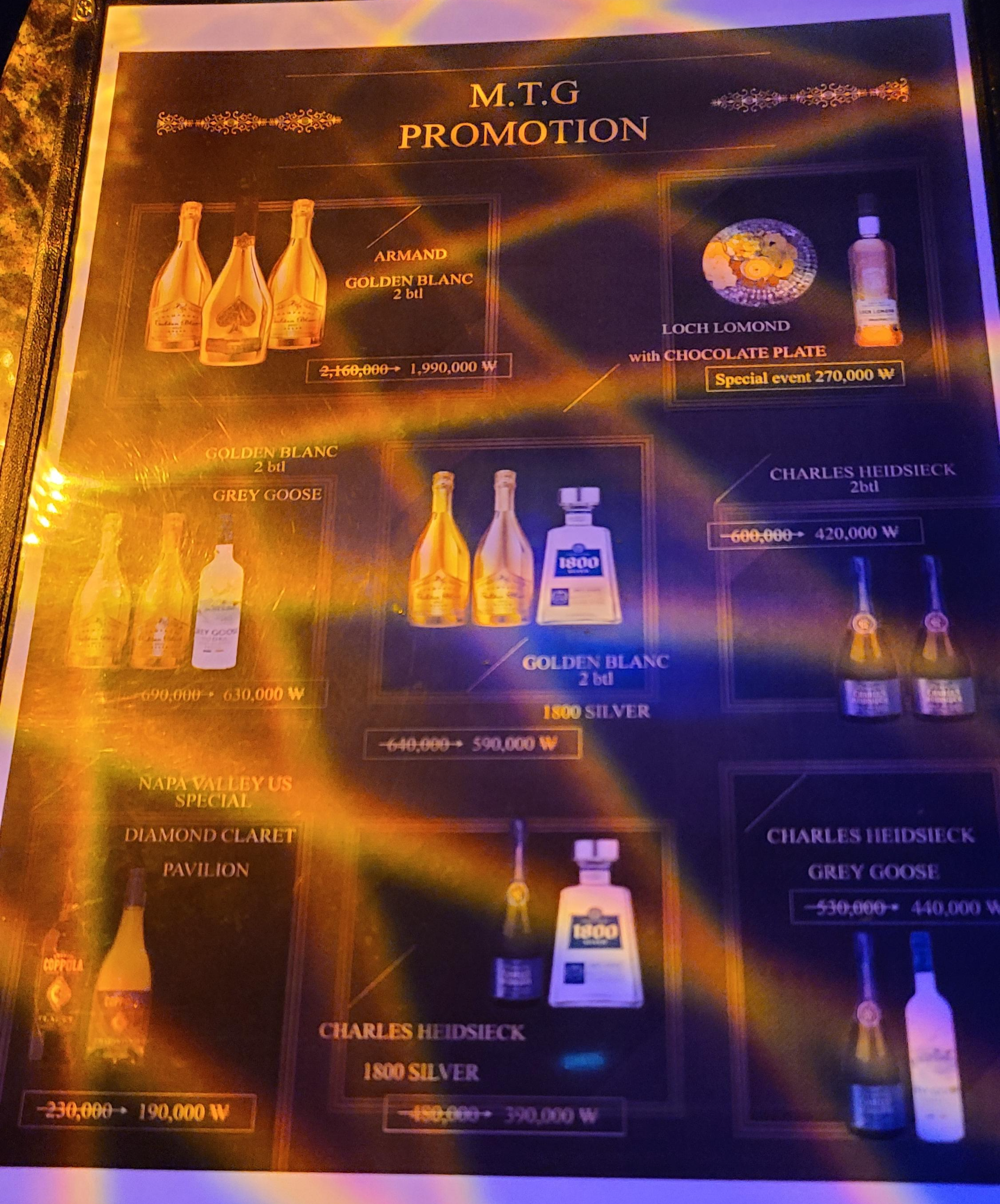 주변분위기를 잘 살펴보고 이번에는 메뉴판을 살펴보기로 합니다. 아르망 드 브리냑, 골든블랑의 고급샴페인부터 1800 데킬라, 그레이구스 보드카 , 로크로몬드 위스키까지 다양한 주류의 조합이 인상적입니다. 마음같아선 가장 비싼 아르망드 브리냑과 골든블랑 황금샴페인의 조합을 맛보고 싶지만 가격대가 너무 비싸니 중앙에 있는 골든블랑과 1800 샴페인과 데킬라의 조합을 경험해보기로 합니다.