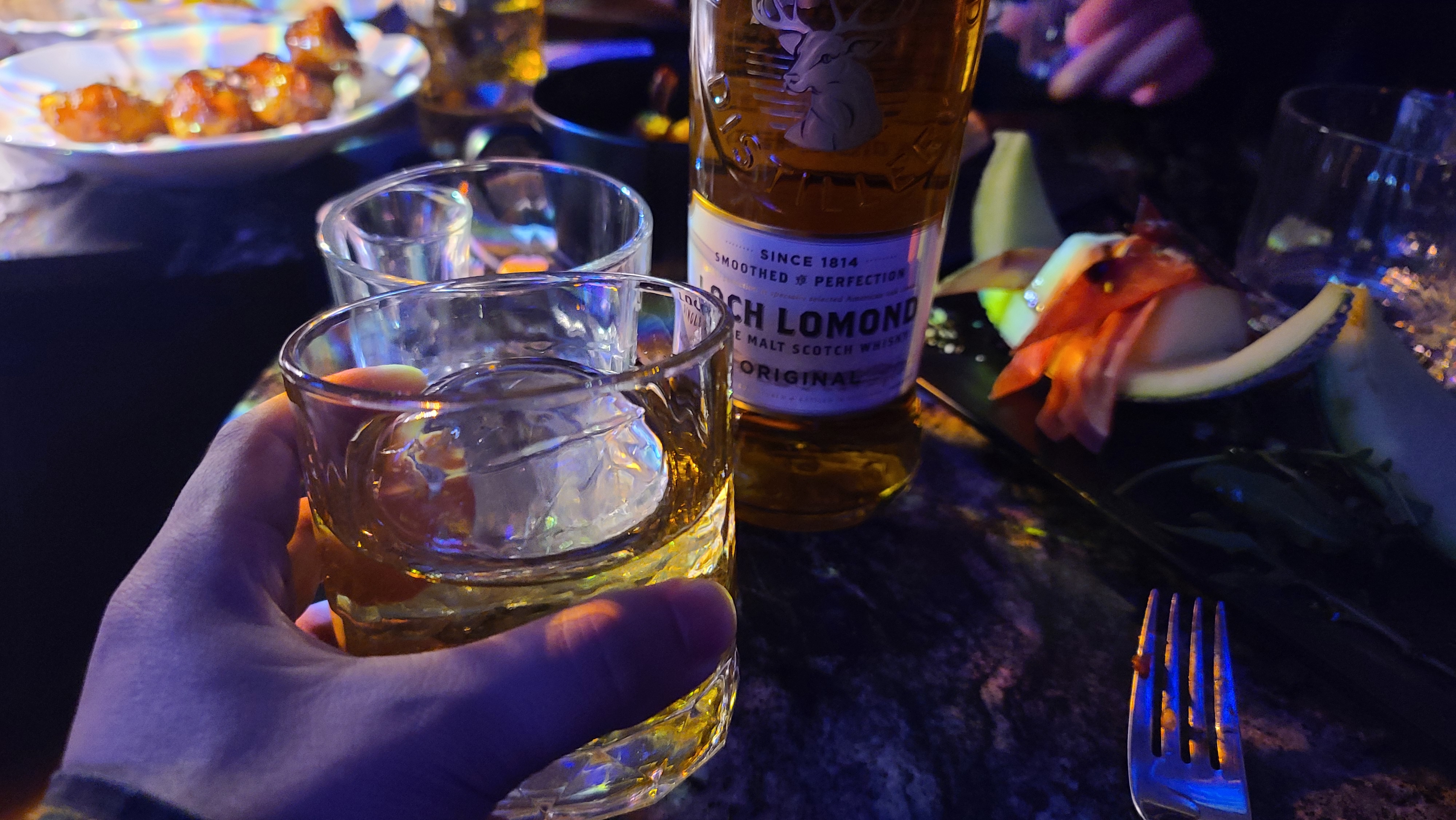 이런 좋은 분위기를 더욱 강하게 이어나가기 위하여 메뉴판에 있던 스카치 싱글몰트 위스키 로크로몬드를 주문해봅니다. 강렬한 위스키와 감바스를 추가적으로 주문하여 좀더 강하게 분위기를 띄워봅니다.