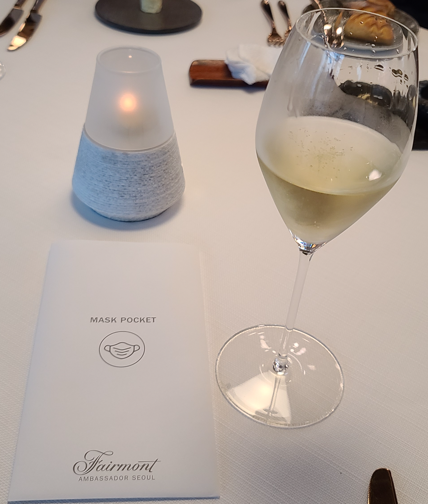 식전 빵에 이어서 에피타이저가 나왔습니다. 가볍게 손으로 집어서 한입에 넣는 타입으로 독특한 식감이 식욕을 자극하고 있습니다. 식전주로 샴페인과 함께 페어링하여 산뜻한 맛과 향으로 식욕을 최대한 끌어올립니다.