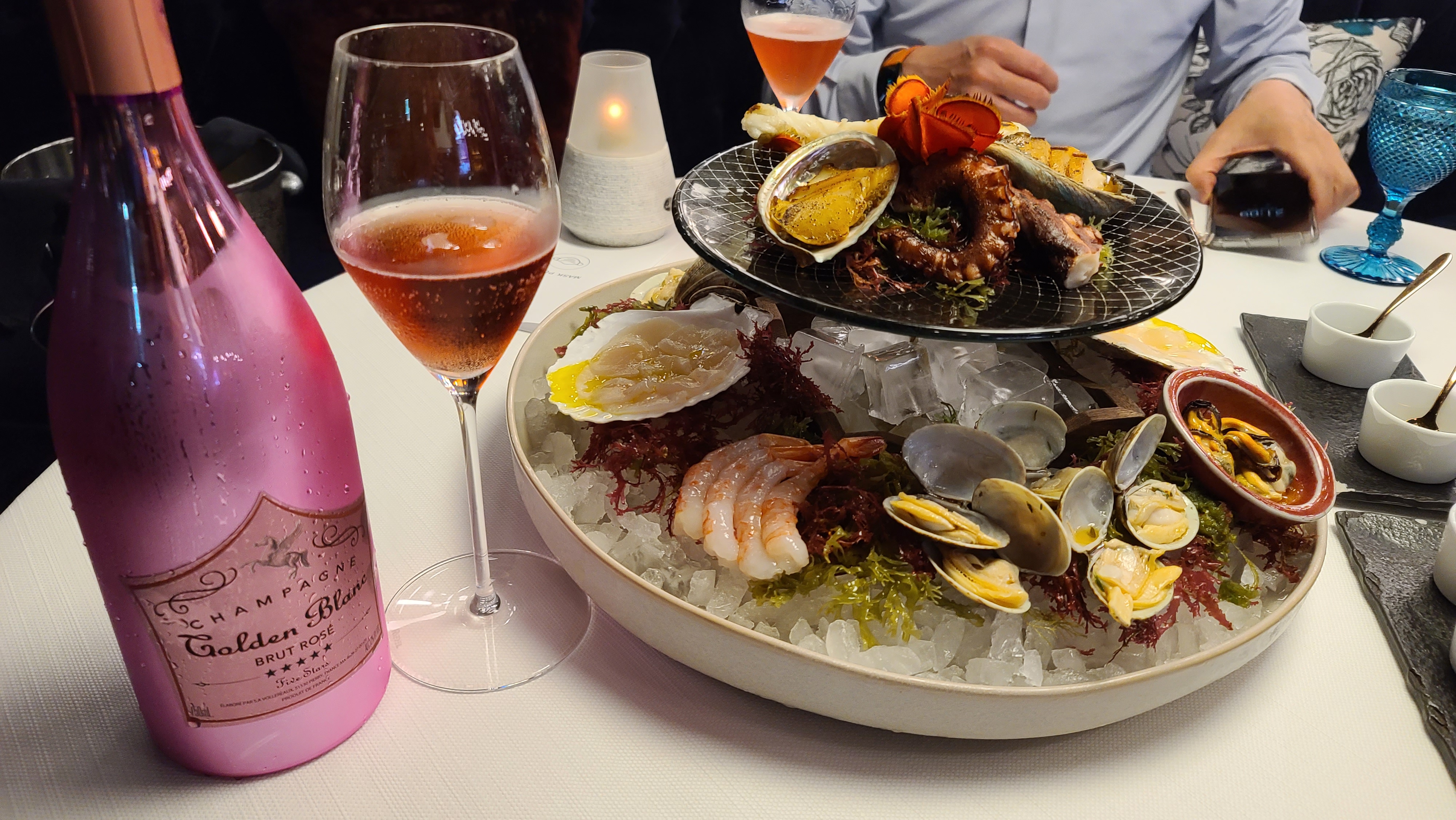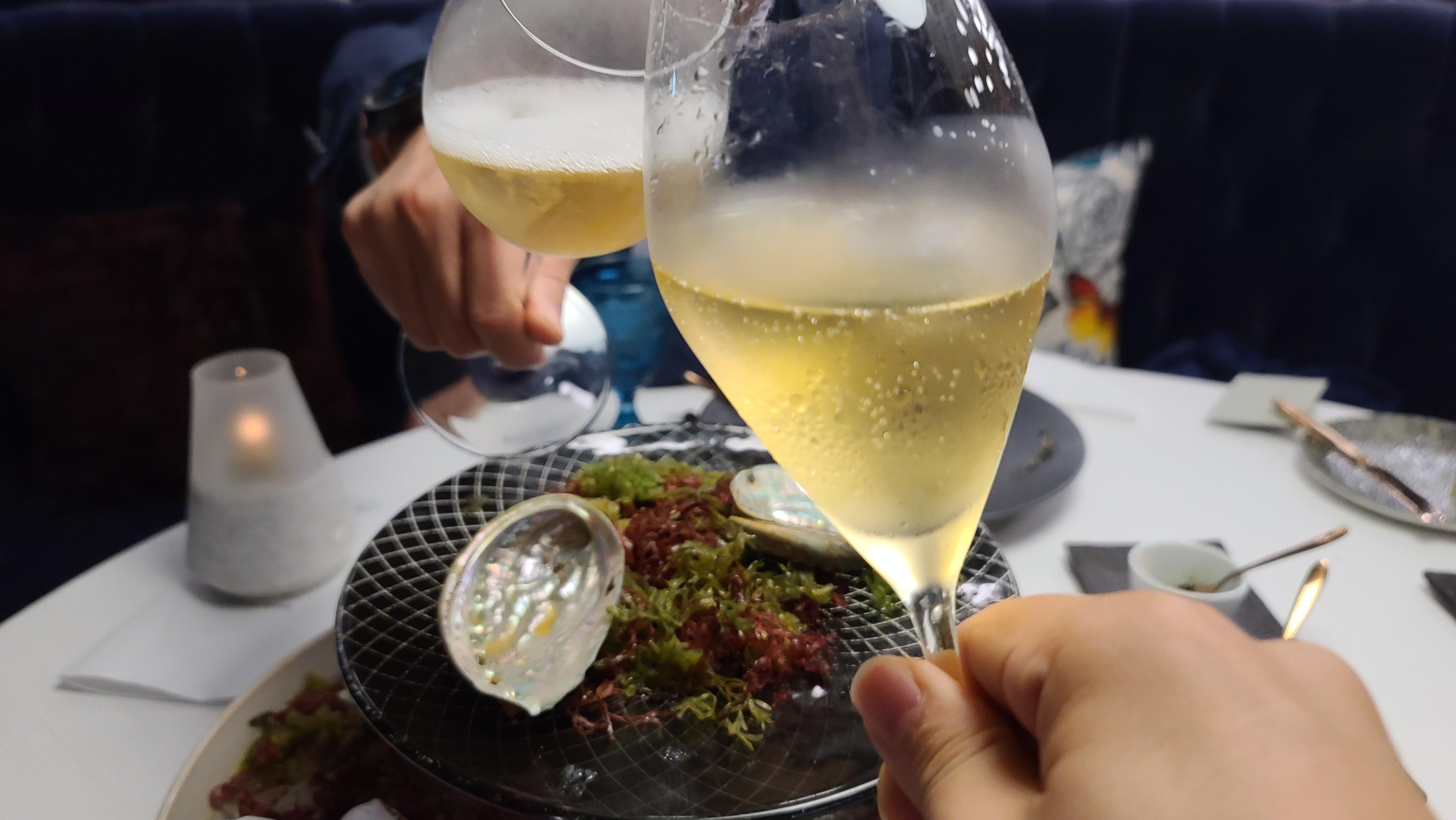 이렇게 신선한 해산물 요리에 술이 빠질순 없습니다. 해산물에 최고로 어울리는 샴페인을 페이링 하여 즐겨봅니다. 해산물의 섬세한 맛을 샴페인의 산도와 기포가 더욱 증폭시켜주며 혹시나 남아있을수도 있는 비린맛을 말끔히 제거해주고 새로운 입맛을 느껴지게 합니다. 골든블랑 로제 샴페인의 비주얼이 매우 러블리한 디너 분위기를 연출하고 있습니다.