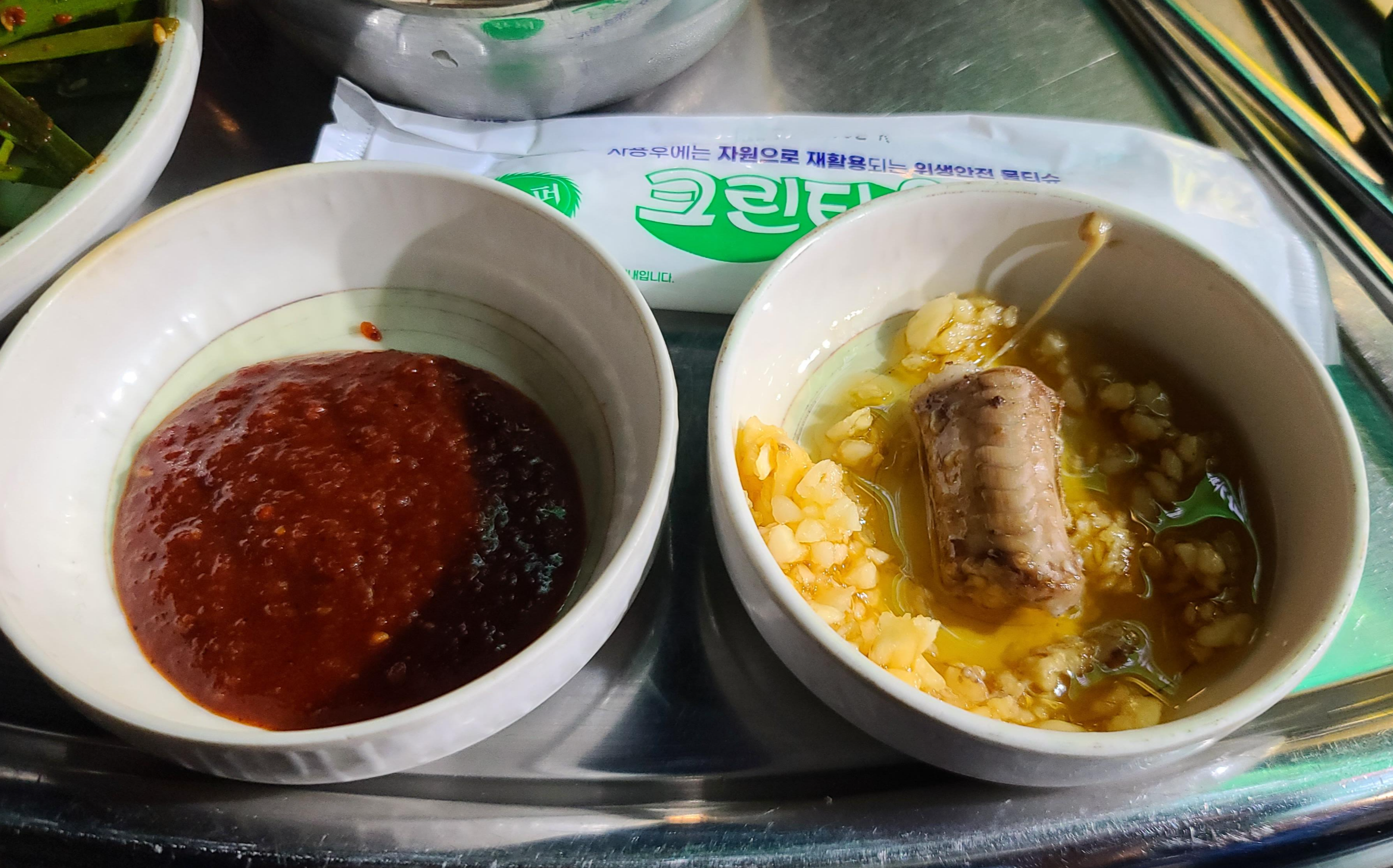 알맞게 익은 산꼼장어를 기름장에 양념장에 그리고 부추, 깻잎과 같이 싸서 여러가지 방식으로 즐겨봅니다. 야들야들하면서도 농축된 육즙이 터져나오는게 역시 산꼼장어의 풍미가 제대로 느껴집니다.