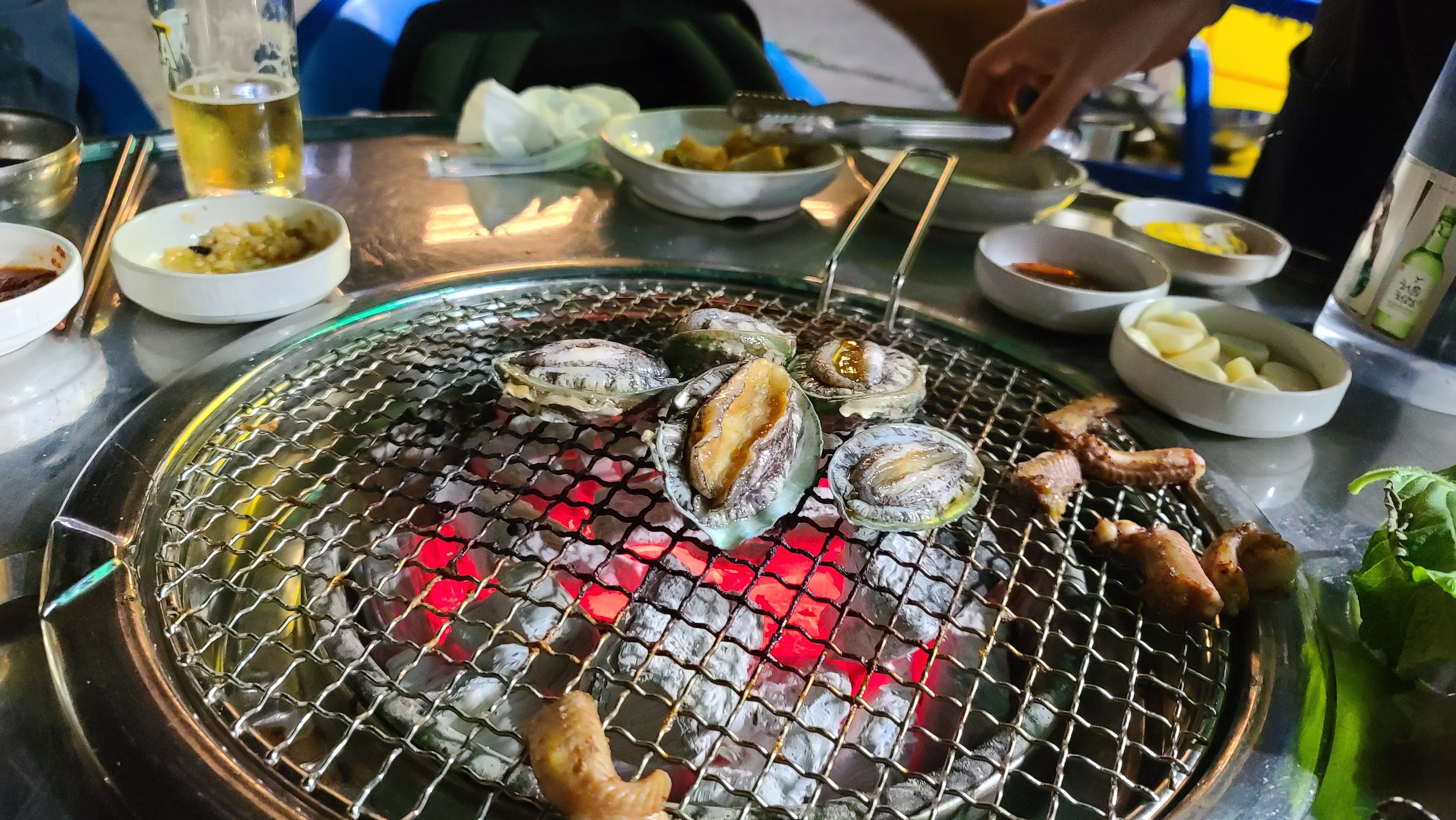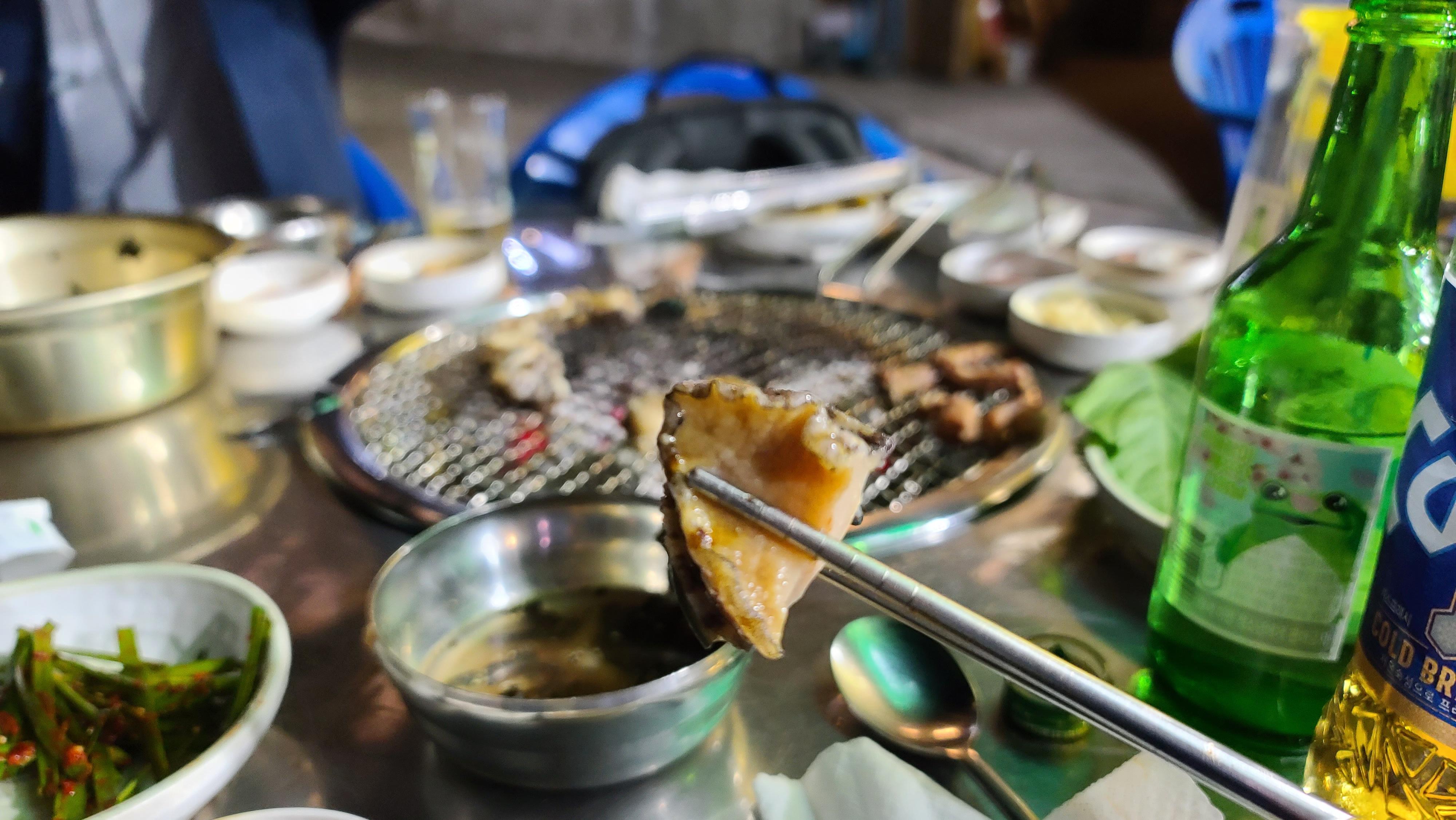 전복을 숯불에 구우니 짭짜름한 전복의 맛이 좋게 느껴지지만 기대처럼 엄청 맛있게 느껴지지는 않습니다. 아무래도 산꼼장어의 기름맛이 너무 맛있게 느껴진 후라 그렇거나 아니면 전복은 생으로 먹는게 훨씬 맛있어여서인지도 모르겠습니다.