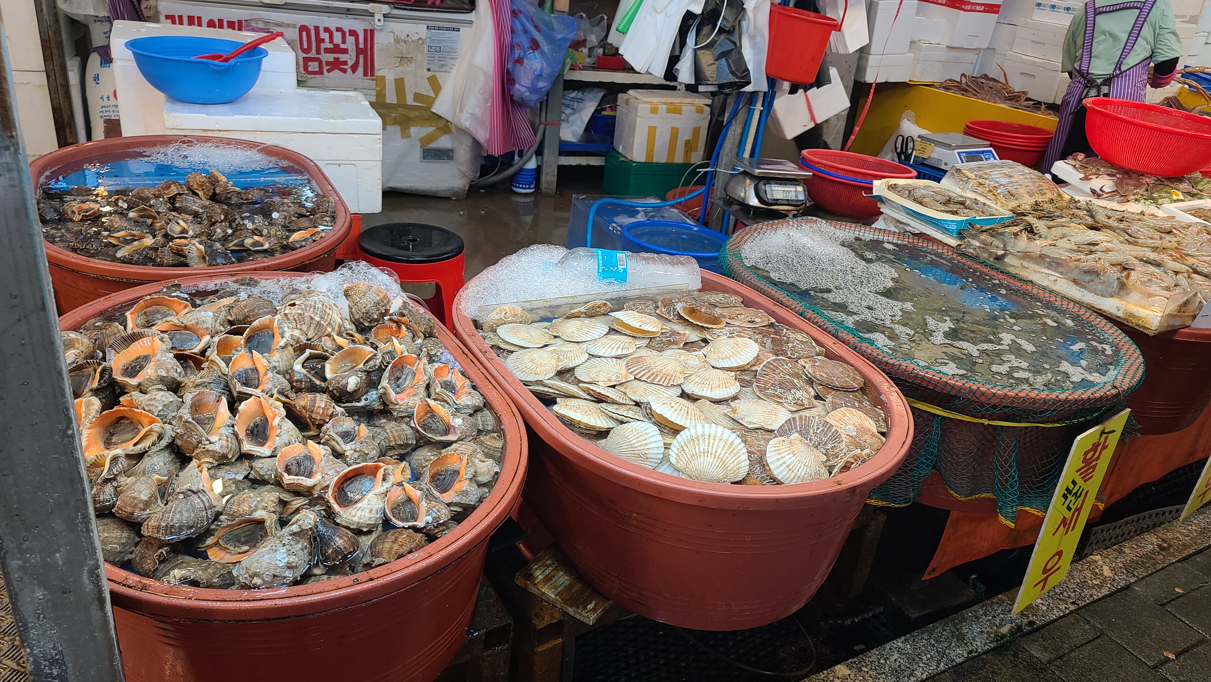 한쪽에서는 양동이에 다양한 패류를 판매하고 있는것이 보입니다. 소라, 맛조개, 가리비, 미더덕, 고동, 해삼, 전복 등 신선한 비주얼이 당장 구매해서 찜을 해먹고 싶어집니다.