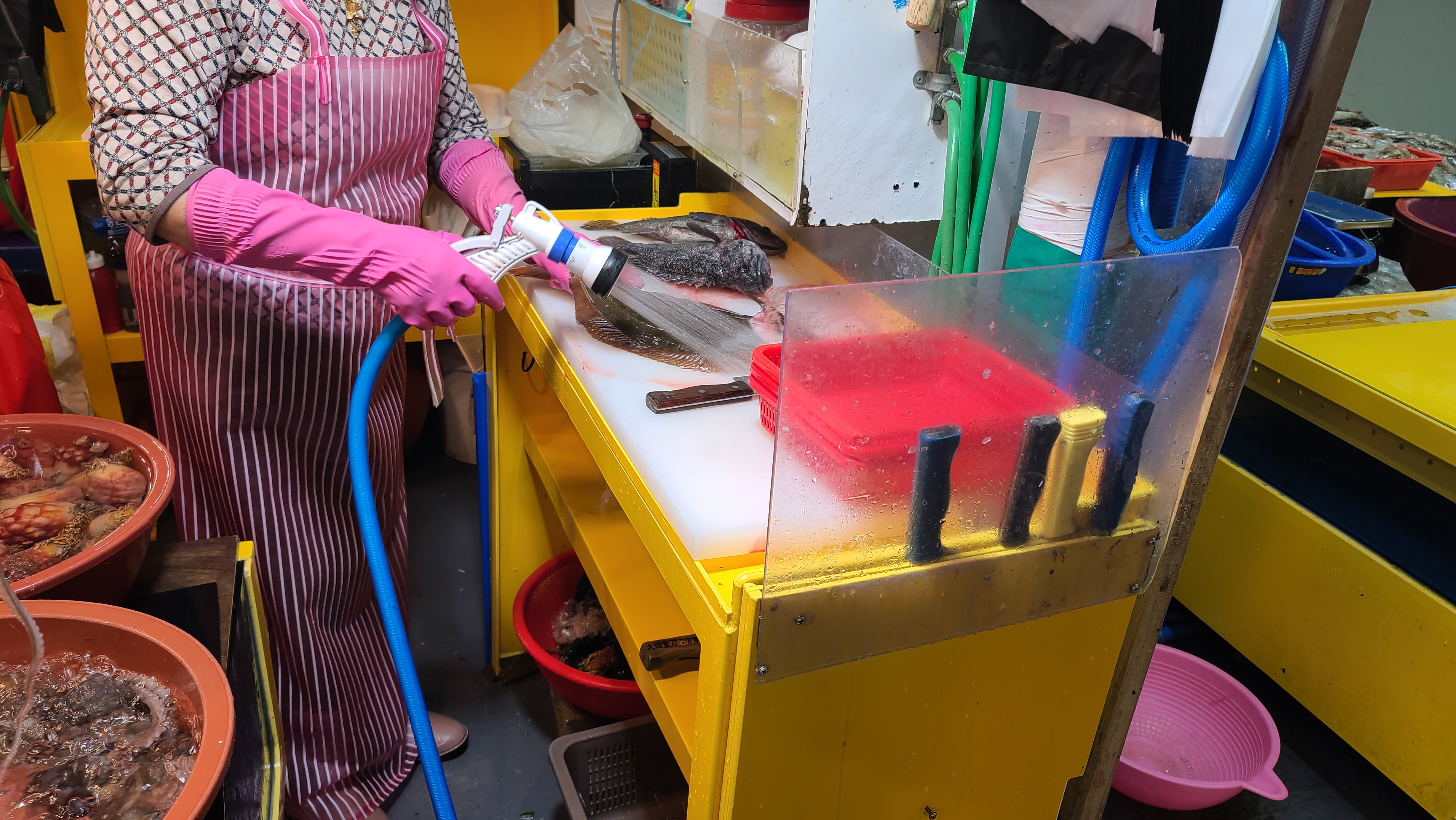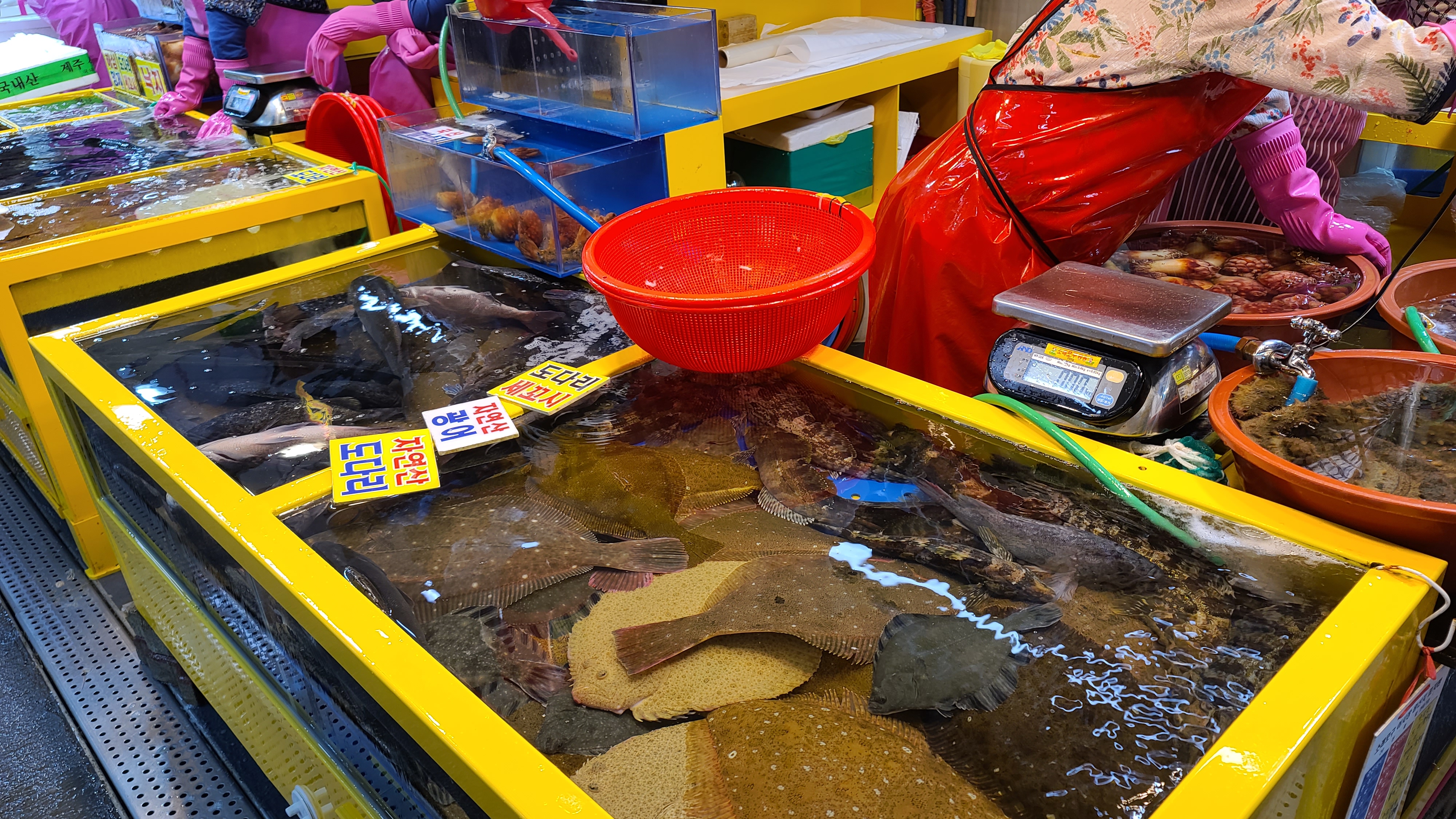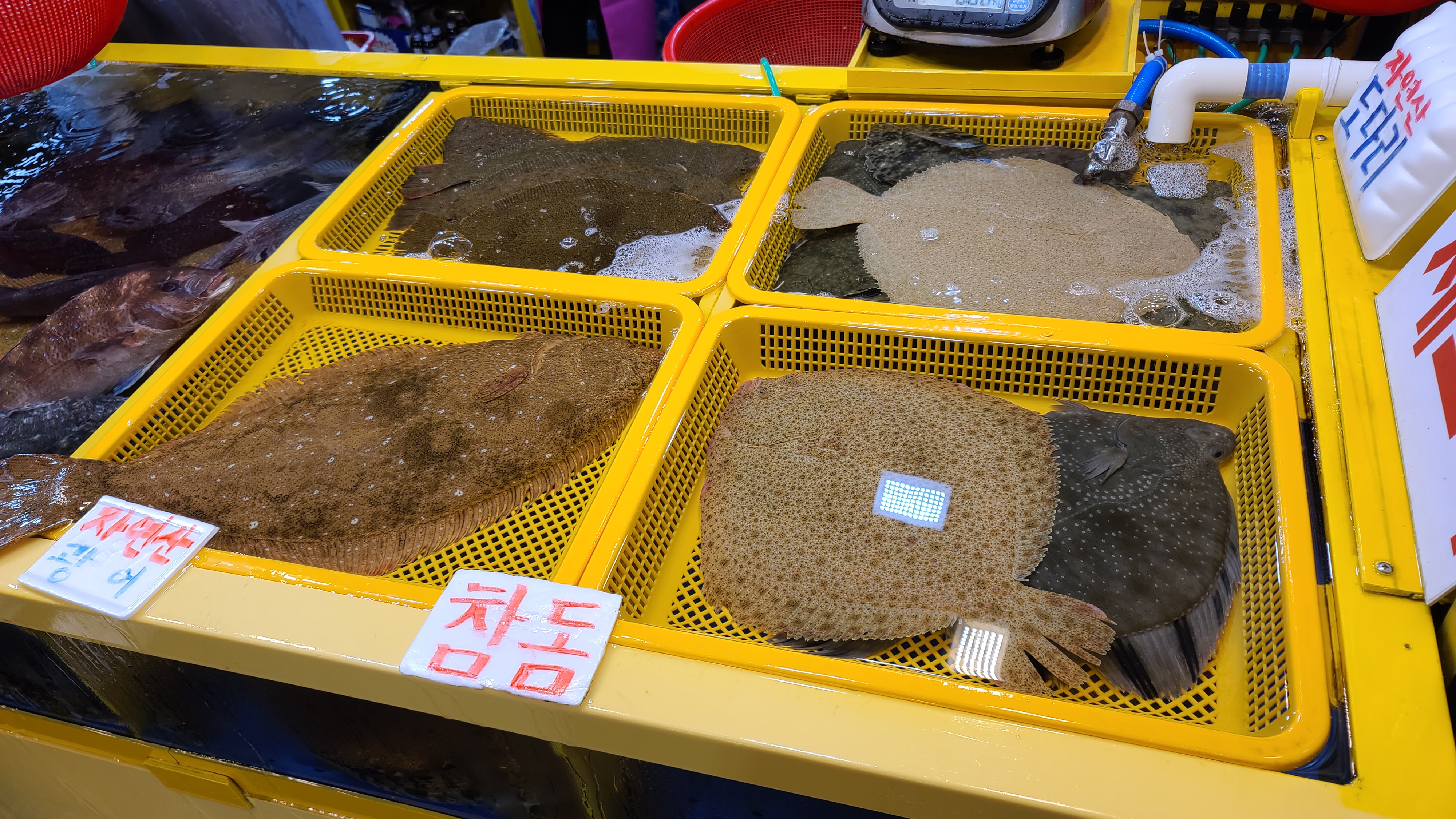 생선 활어를 판매하는 매대를 보니 자연산 광어의 육중함이 느껴지고 색깔이 흰 찰광어, 자연산 도다리 등 다양한 횟감이 신선해 보입니다. 자연산 광어나 도다리가 역시 횟감으로는 최고의 가성비를 가지고 있는 종류라는건 부정할 수 없는 사실입니다.