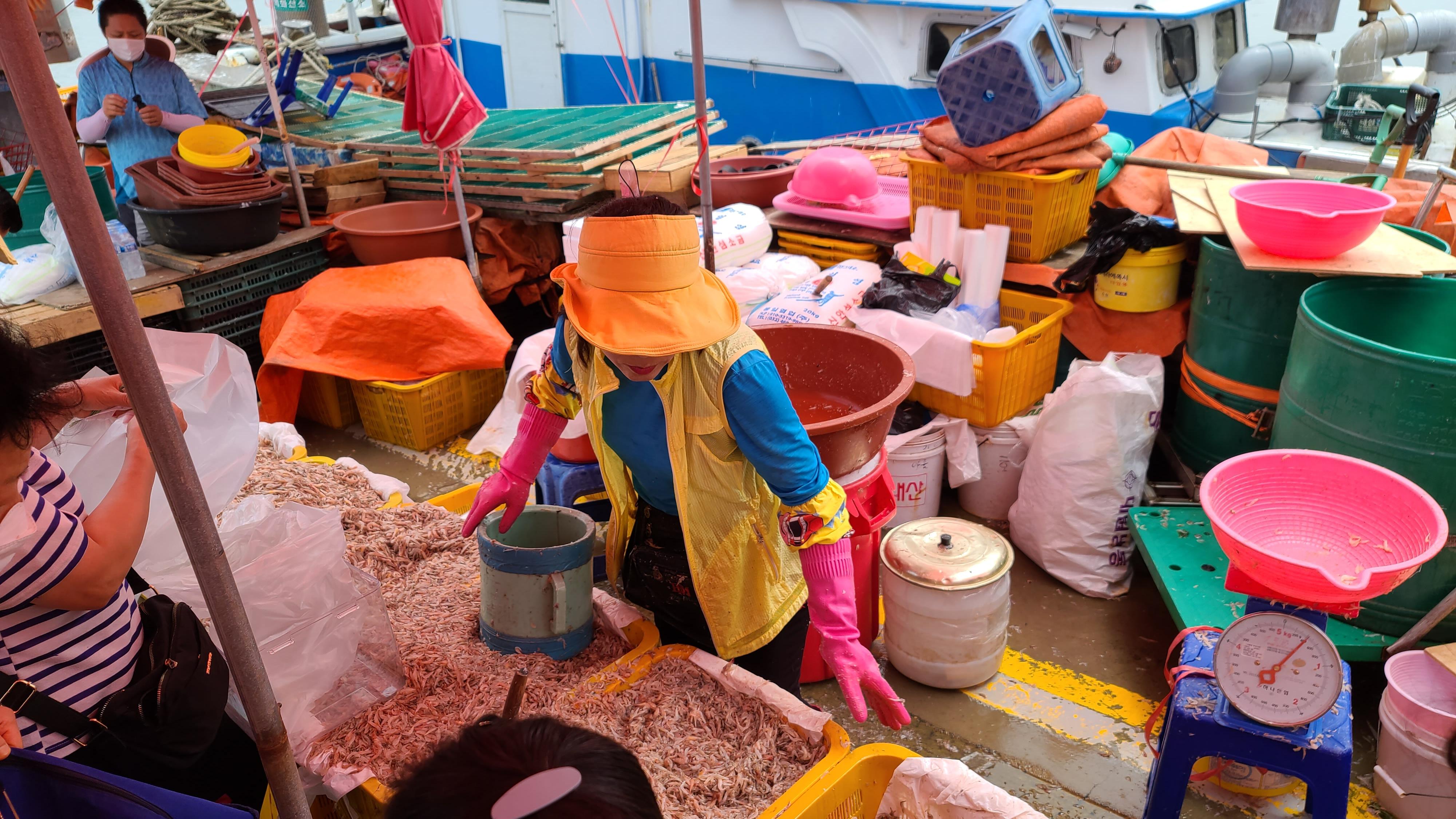 오늘도 역시나 새우젓을 구하려는 사람들로 줄이 길게 늘어서 있습니다. 삼만원정도면 새우젓을 10키로이상 가득 가져갈수 있기 때문에 김치냉장고통, 양동이 등 다양한 통을 들고 사람들이 기다리는 모습이 매우 인상적입니다.