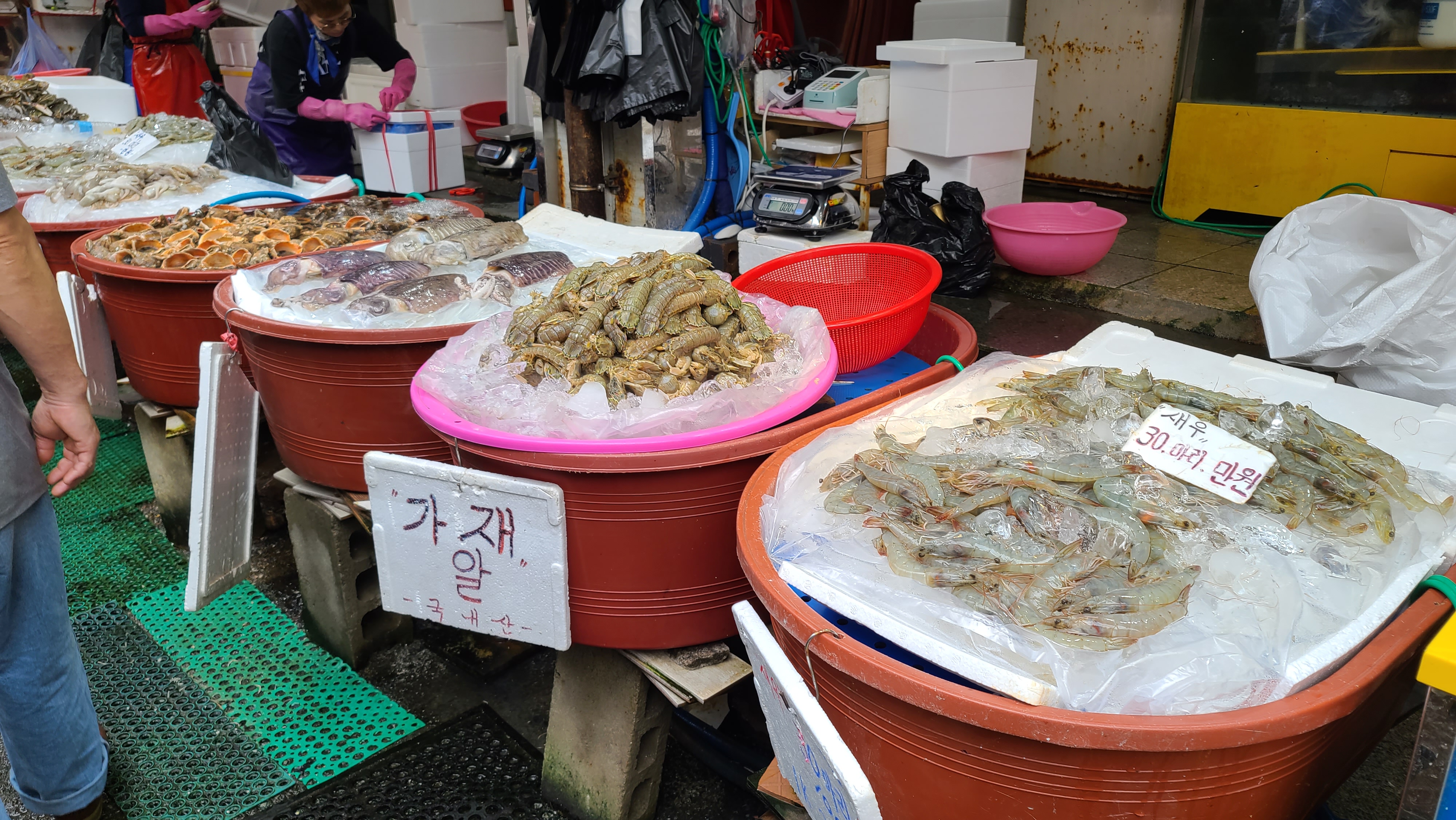 갑오징어와 새우 등 다양한 두족류와 갑각류도 보입니다. 가재알이라니 어떤 맛일까 궁금하게 느껴지는 매대입니다.