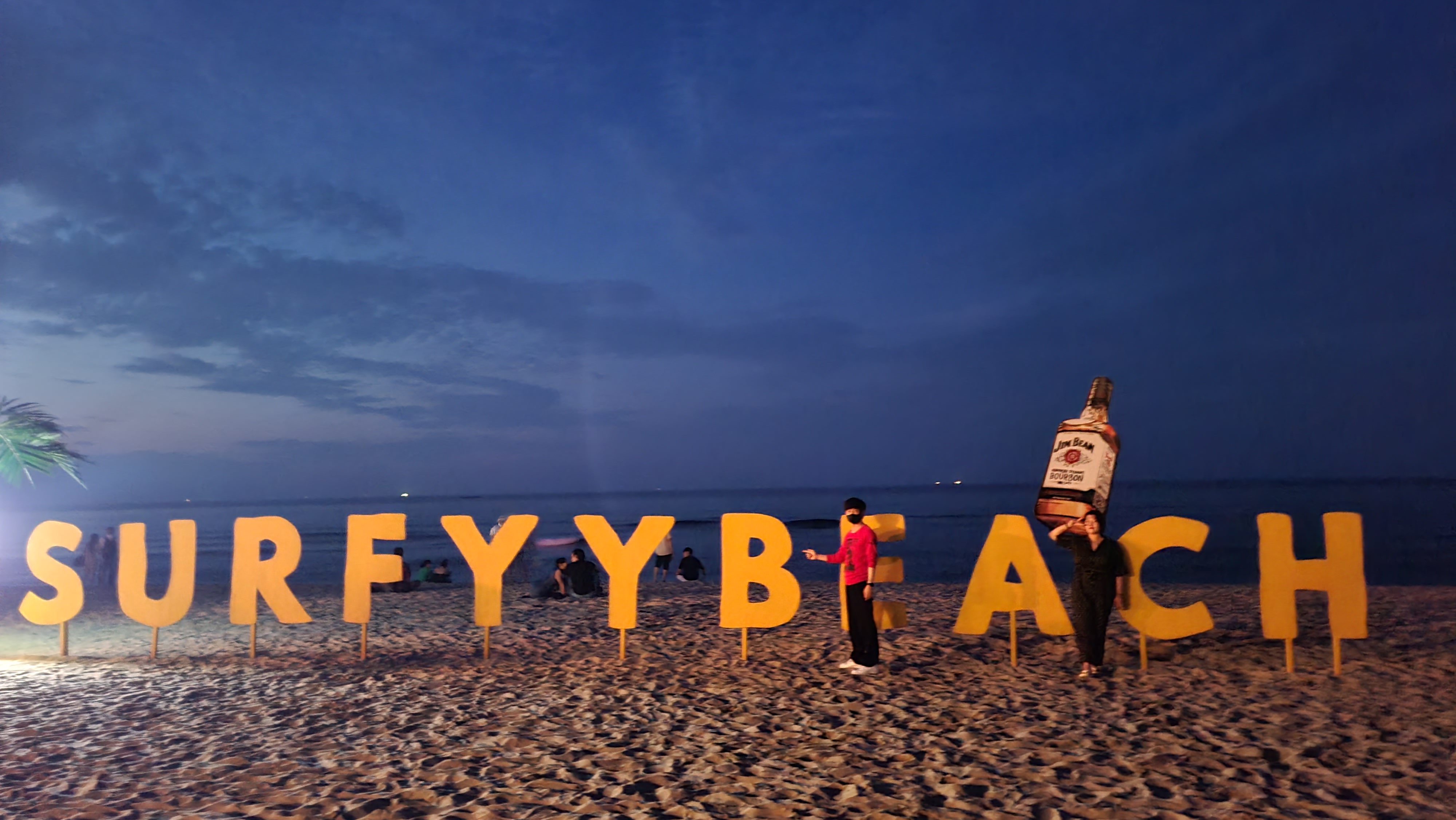 서피비치라고 쓰여진 포토존에서 사람들이 이미 많이 사진을 찍고 있는 모습이야
