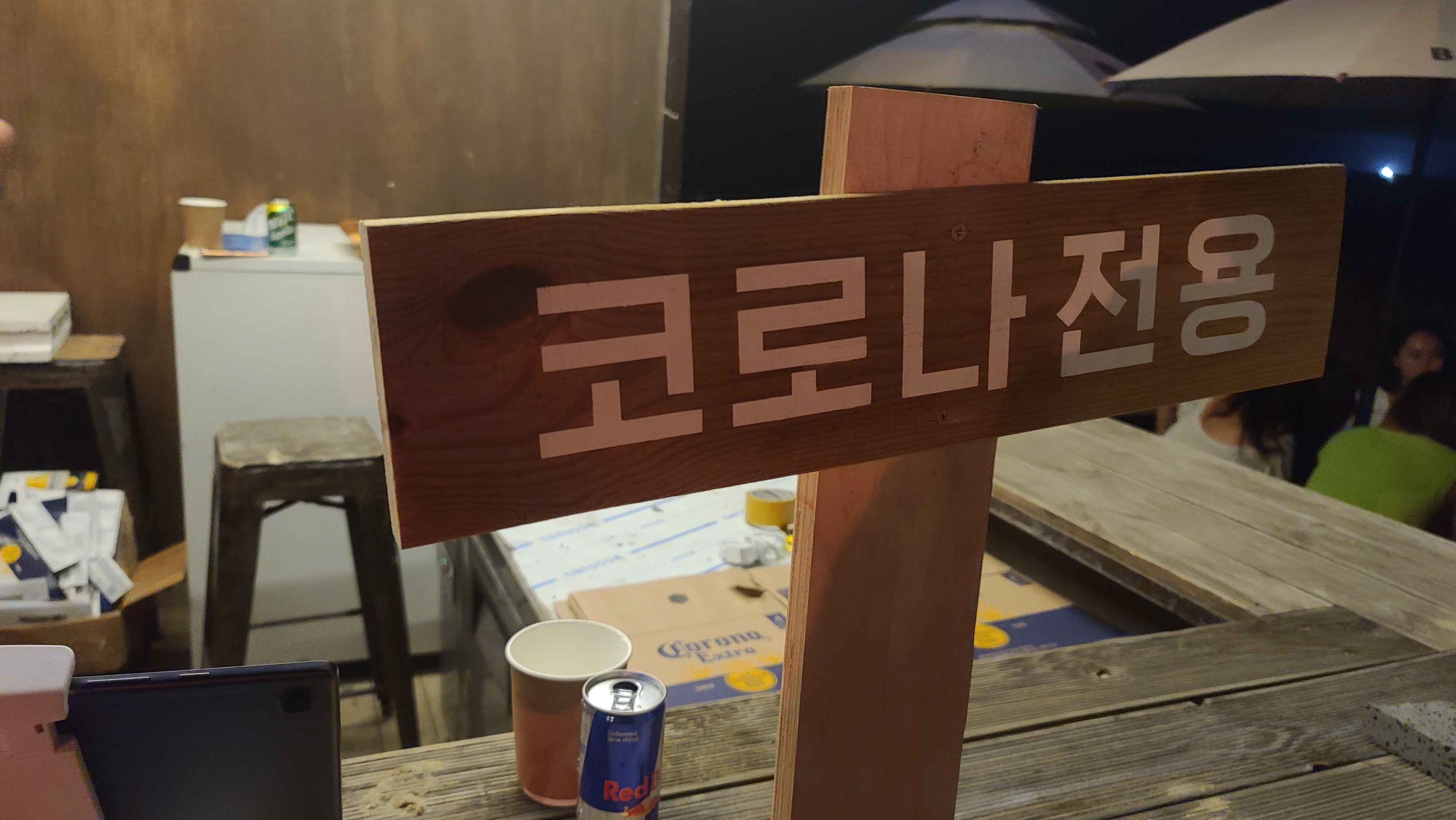 간판을 보고 깜짝놀라는 사람?! 코로나 맥주 전용이라는 뜻이야.