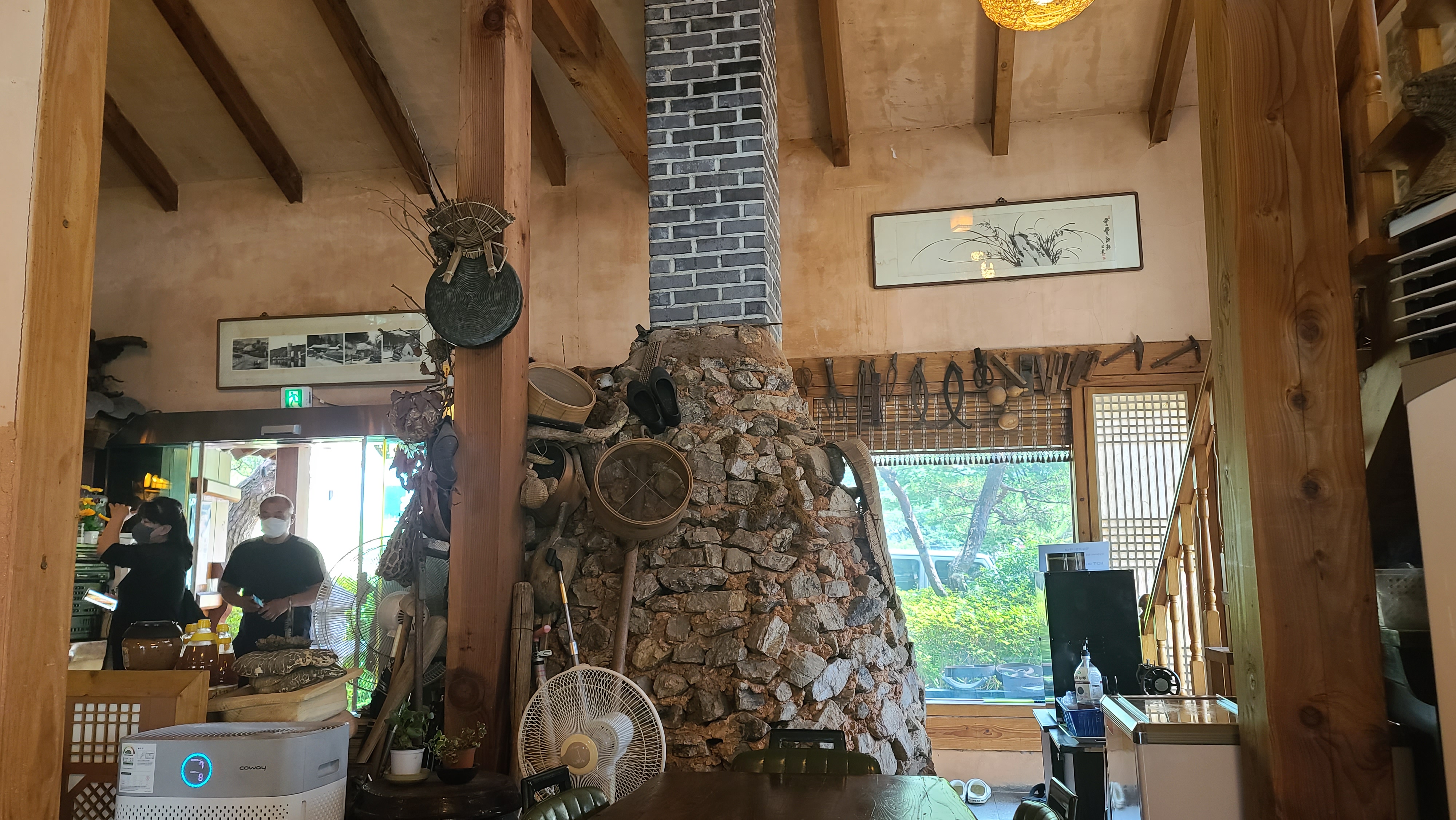 들어가서 인테리어를 살펴보니 황토벽에 돌장식 한옥을 연상케하는 정취가 느껴지고 있습니다. 강가에 위치해있기 때문에 창문가 자리에 우선 사람들이 가득한 모습도 보입니다.
