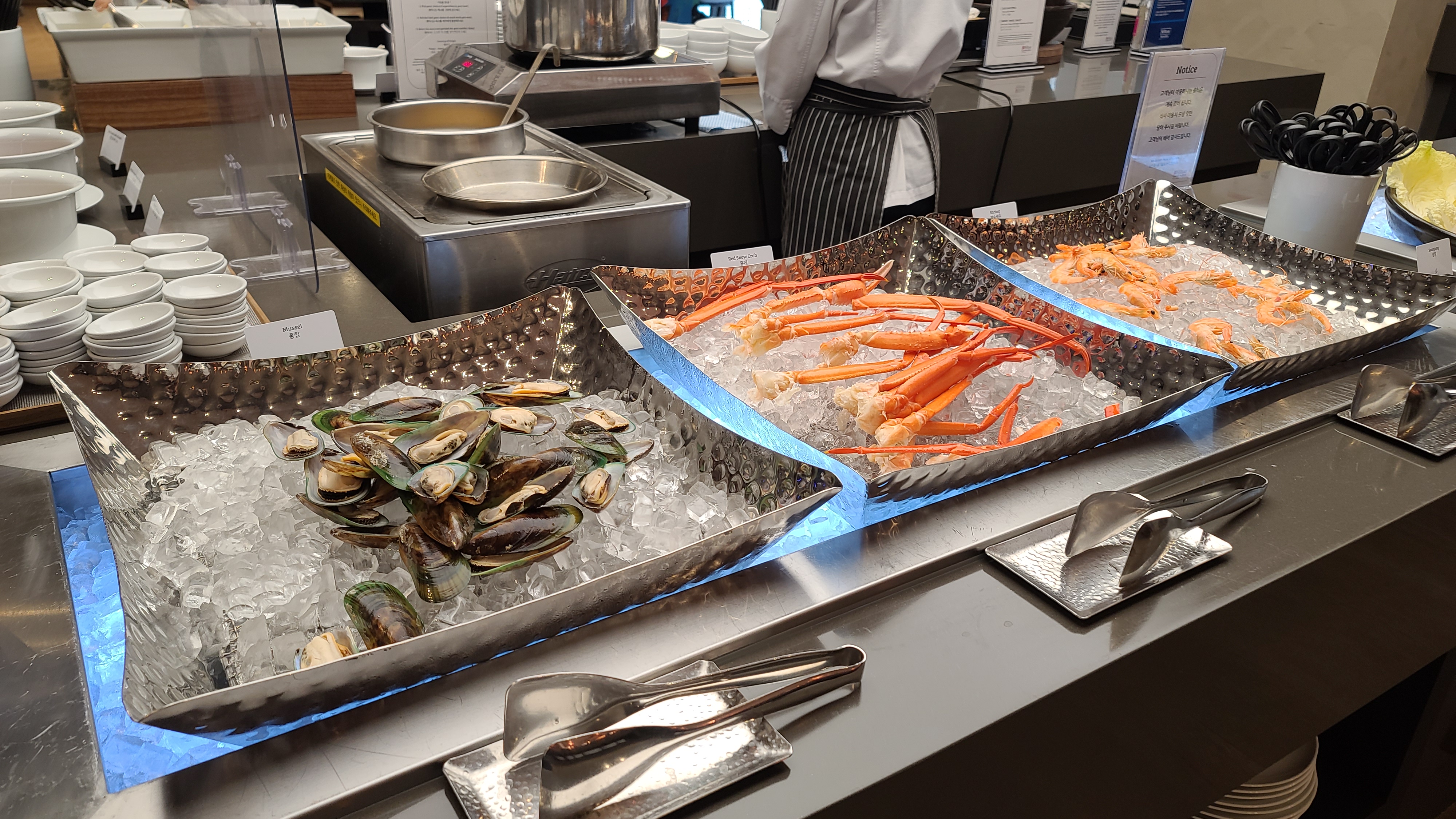대게, 홍게, 홍합, 새우 수산물 시리즈가 있는 테이블입니다. 대게는 조금 짠맛이 있는 스타일이며 홍합은 나쁘지 않은 맛이나 아주 감명깊지는 않은 스타일입니다. 새우는 여느 뷔페와 다를바가 없습니다. 수산물 시리즈는 중타라고 볼 수 있습니다.