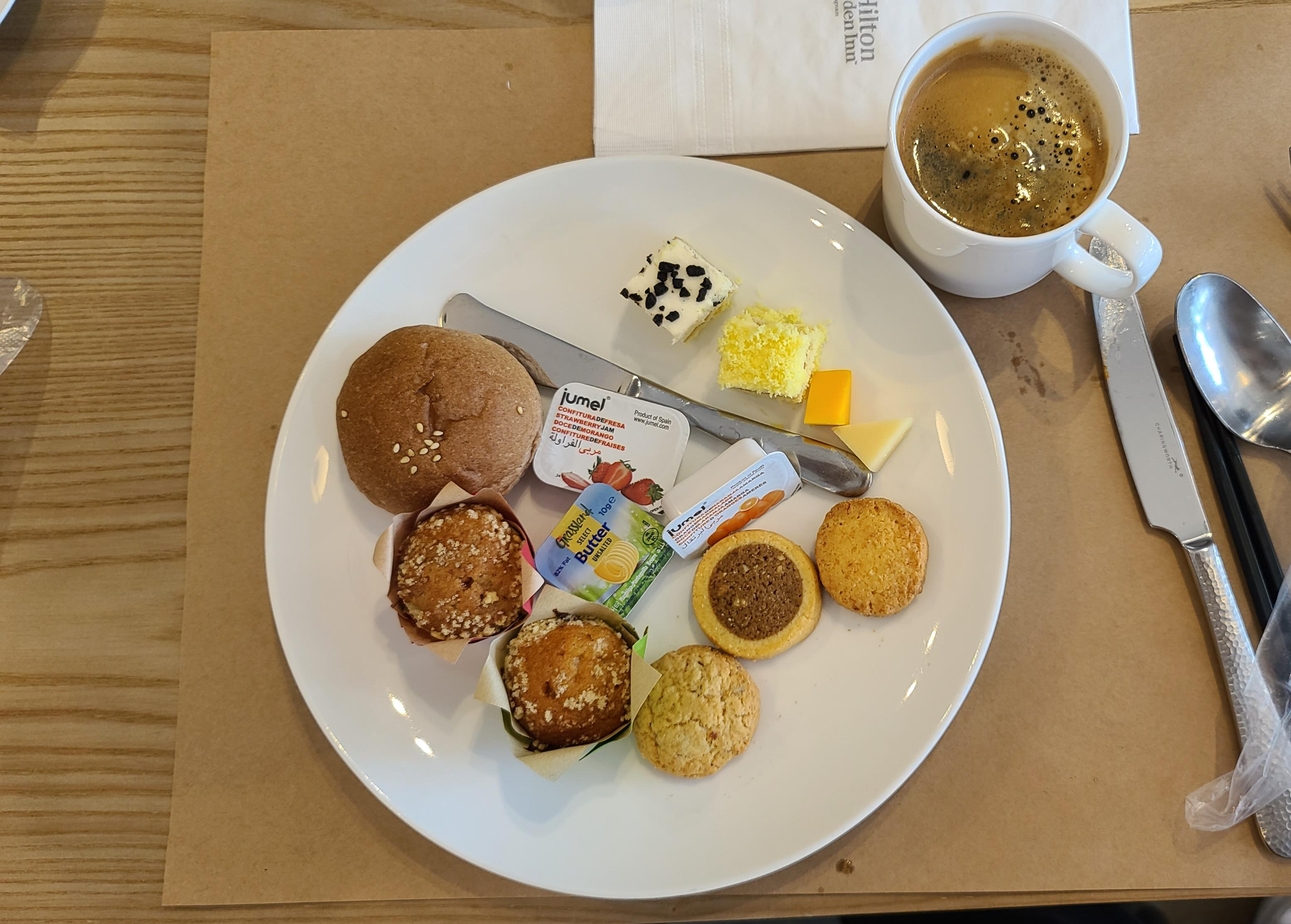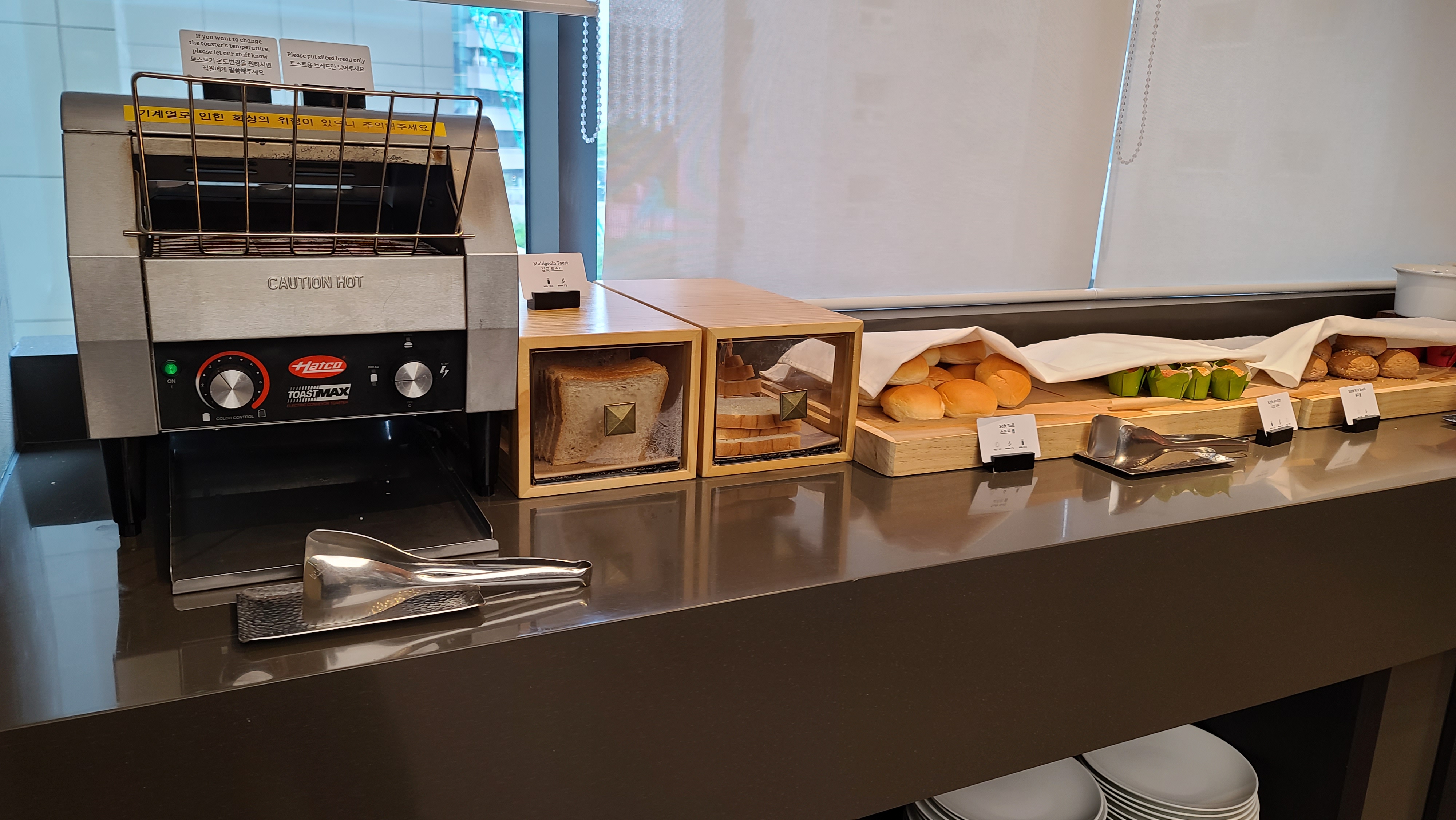 옆쪽으로는 빵과 토스트 잼 등 다양한 양식 메뉴가 준비되어 있습니다. 잼과 버터는 일회용 기성품이며 모닝빵이나 식빵등도 역시 기성품으로 보여 중간정도의 퀄리티를 보여주고 있습니다.