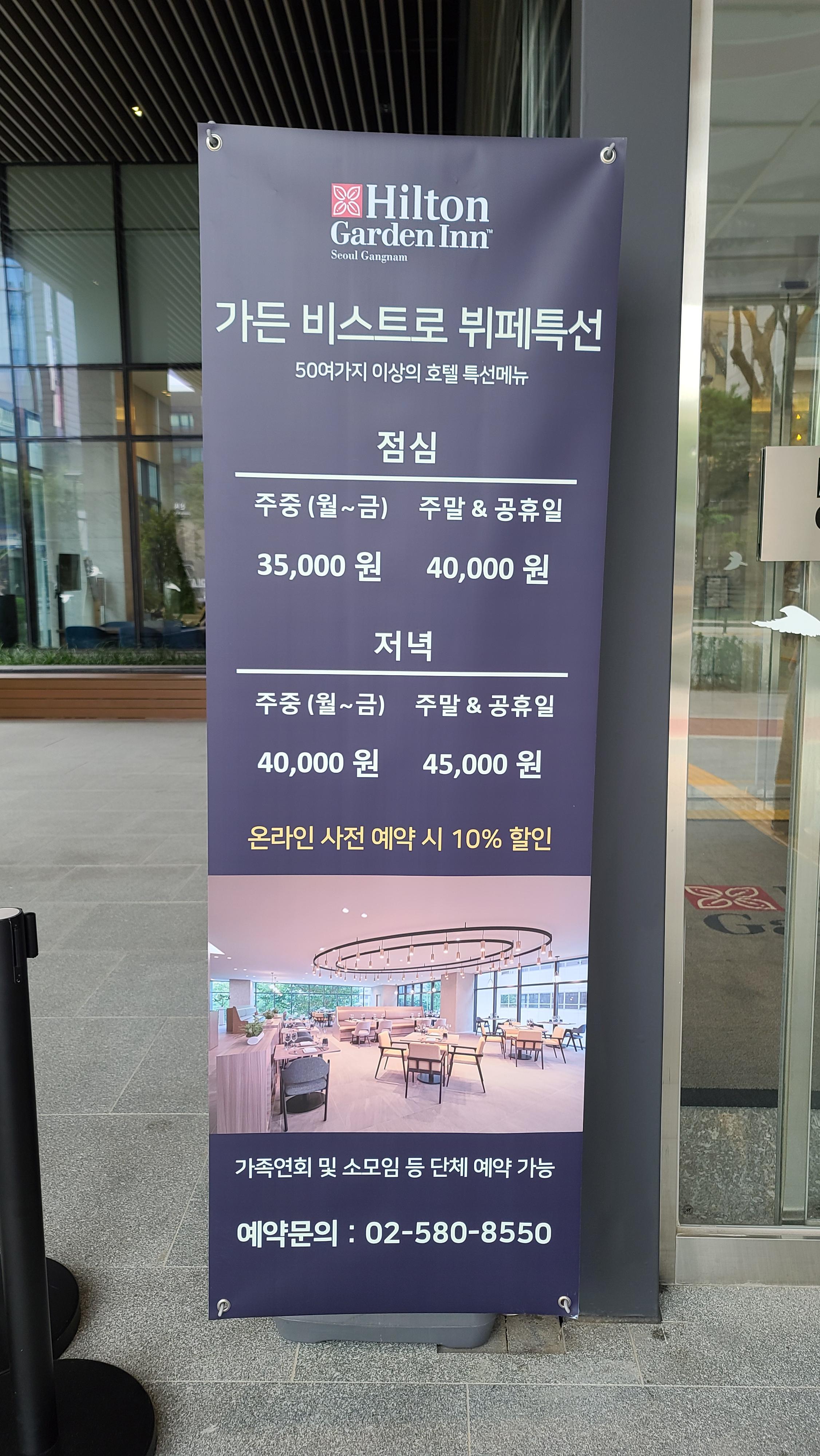 입구에 살펴보니 가든 비스트로 뷔페 시간 및 가격 배너가 걸려있습니다. 온라인 사전예약시 10%를 할인해주는 것이 보이고 다음에는 온라인 예약을 이용해봐야겠다는 생각이 들게 됩니다.