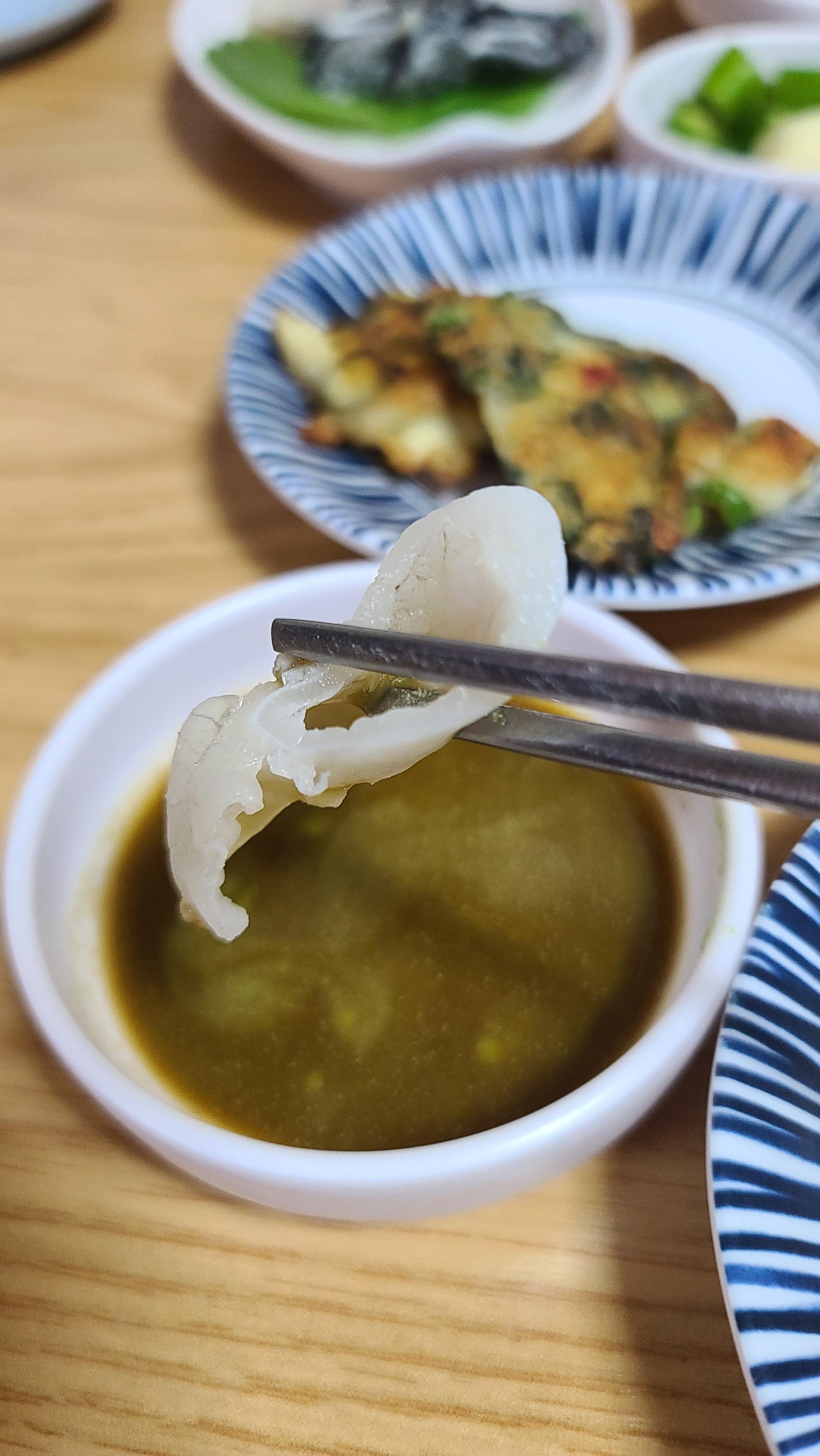 먹음직스러워 보이는 비주얼의 민어를 간장에 찍어서 순수하게 맛을 보기도 쌈에 싸서 먹어보기도 합니다. 소문난 계절횟집이라고 해서 왔고 여름민어에 대한 기대가 커서인지 민어는 그 맛을 순수히 살리지 못했다는 생각이 듭니다. 민어는 조금 숙성을 거쳐야 본연의 감칠맛과 식감이 어우러지는데, 너무 생으로 내와서 다른 횟집과 다를바가 없게 느껴집니다.
