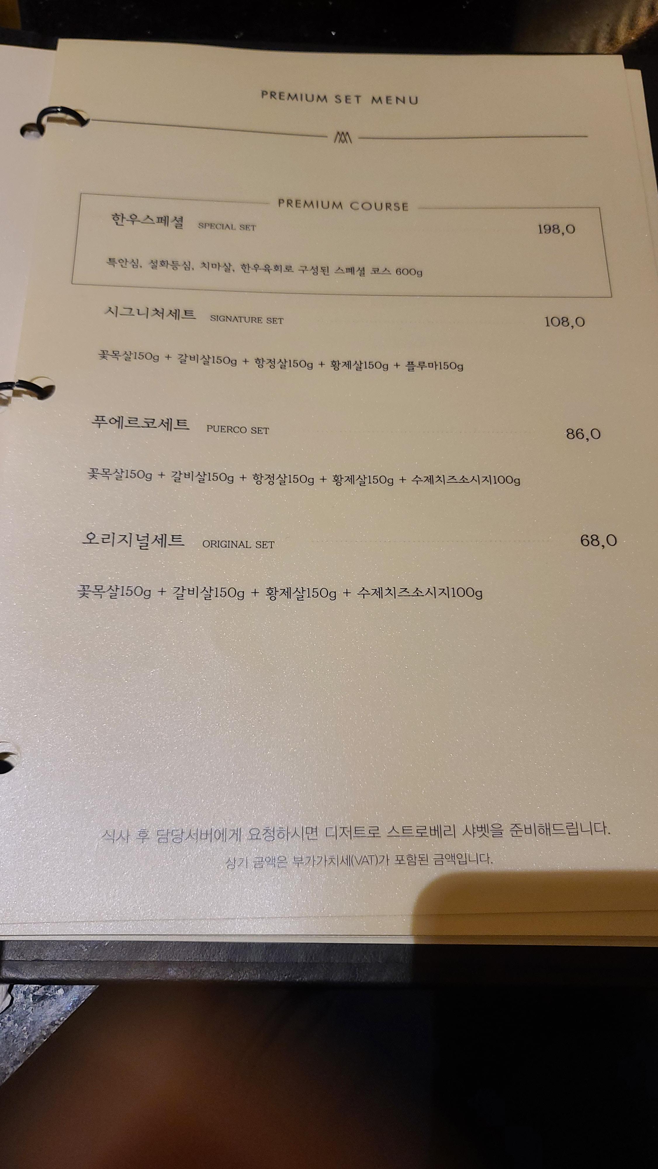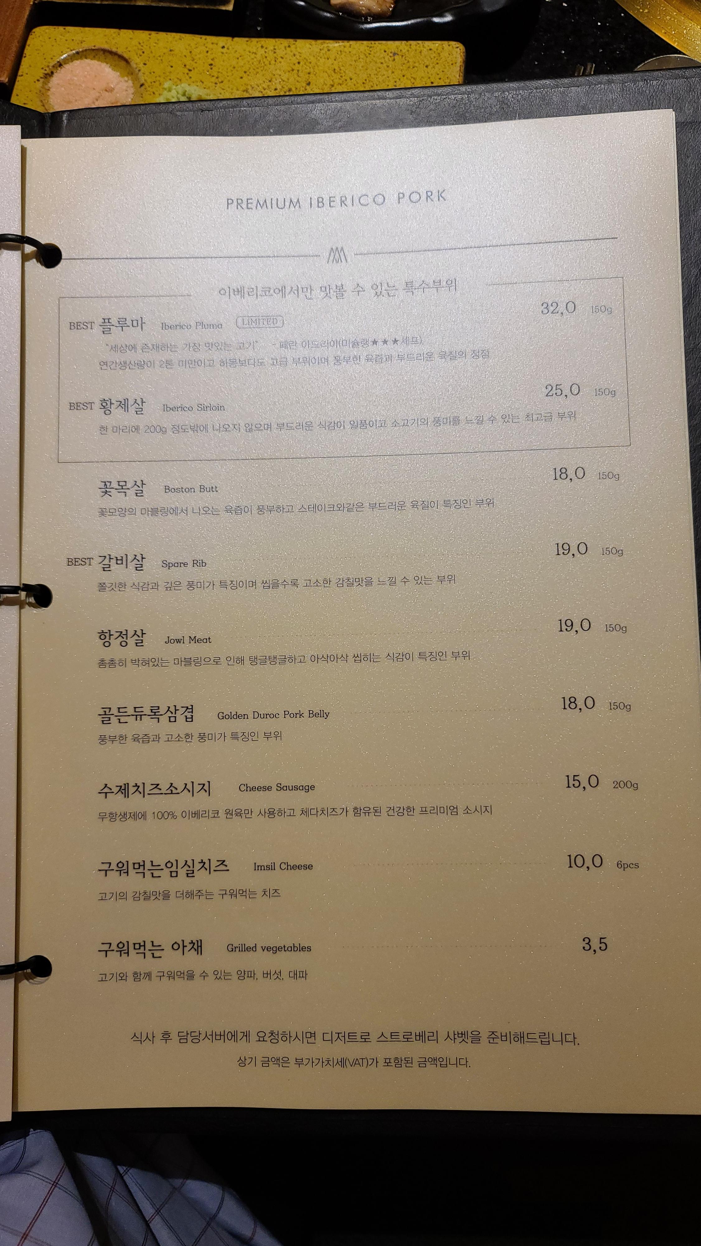 와인과 페어링하여 맛있는 푸에르코 세트를 다 먹고 메뉴판을 봅니다. 가장 맛있었던 황제살을 추가적으로 주문하여 구워봅니다. 역시나 꽃이 핀것 같은 마블링은 예술적이고 식욕을 끌어댕기고 있습니다.