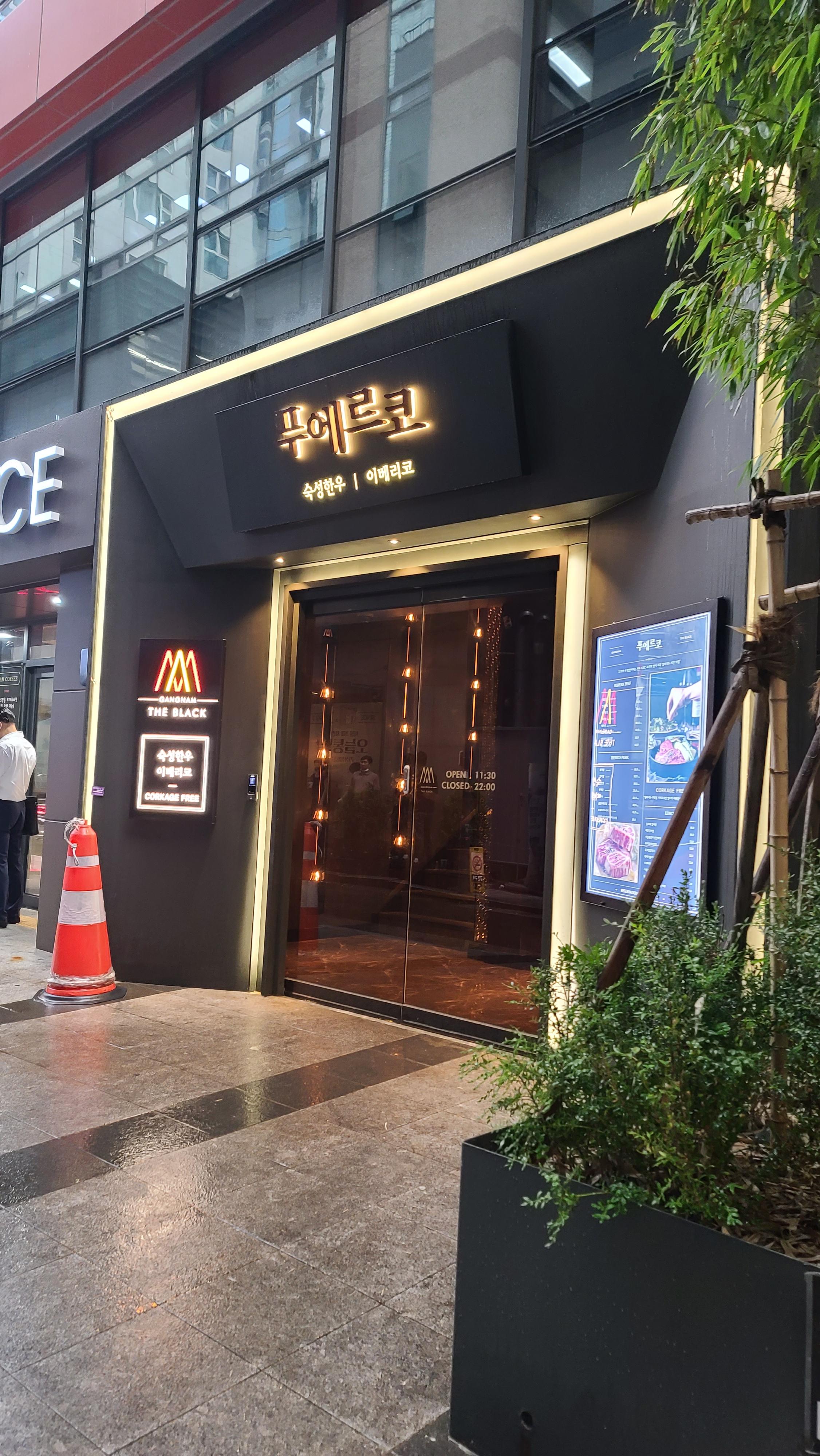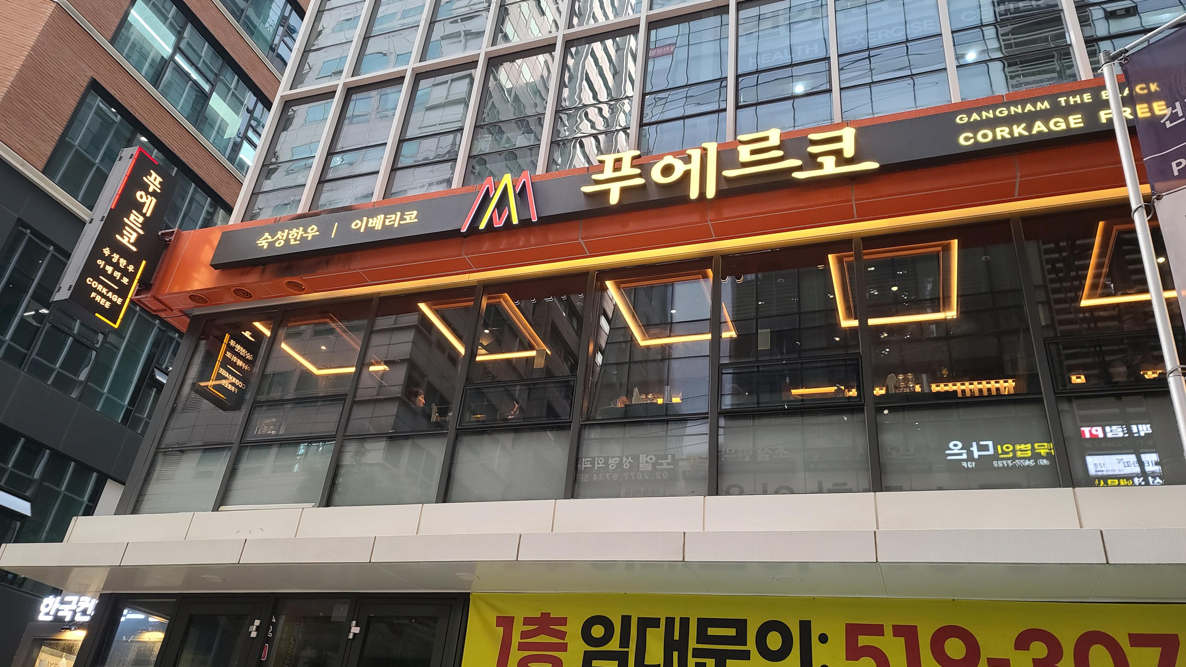 강남역 부근 새로생긴 고기집에서 비즈니스 미팅을 잡고 가게에 도착합니다. 푸에르코 숙성한우, 이베리코라고 간판에 적혀있으며 특이한 점은 간판에 콜키지 프리라고 적혀있습니다.