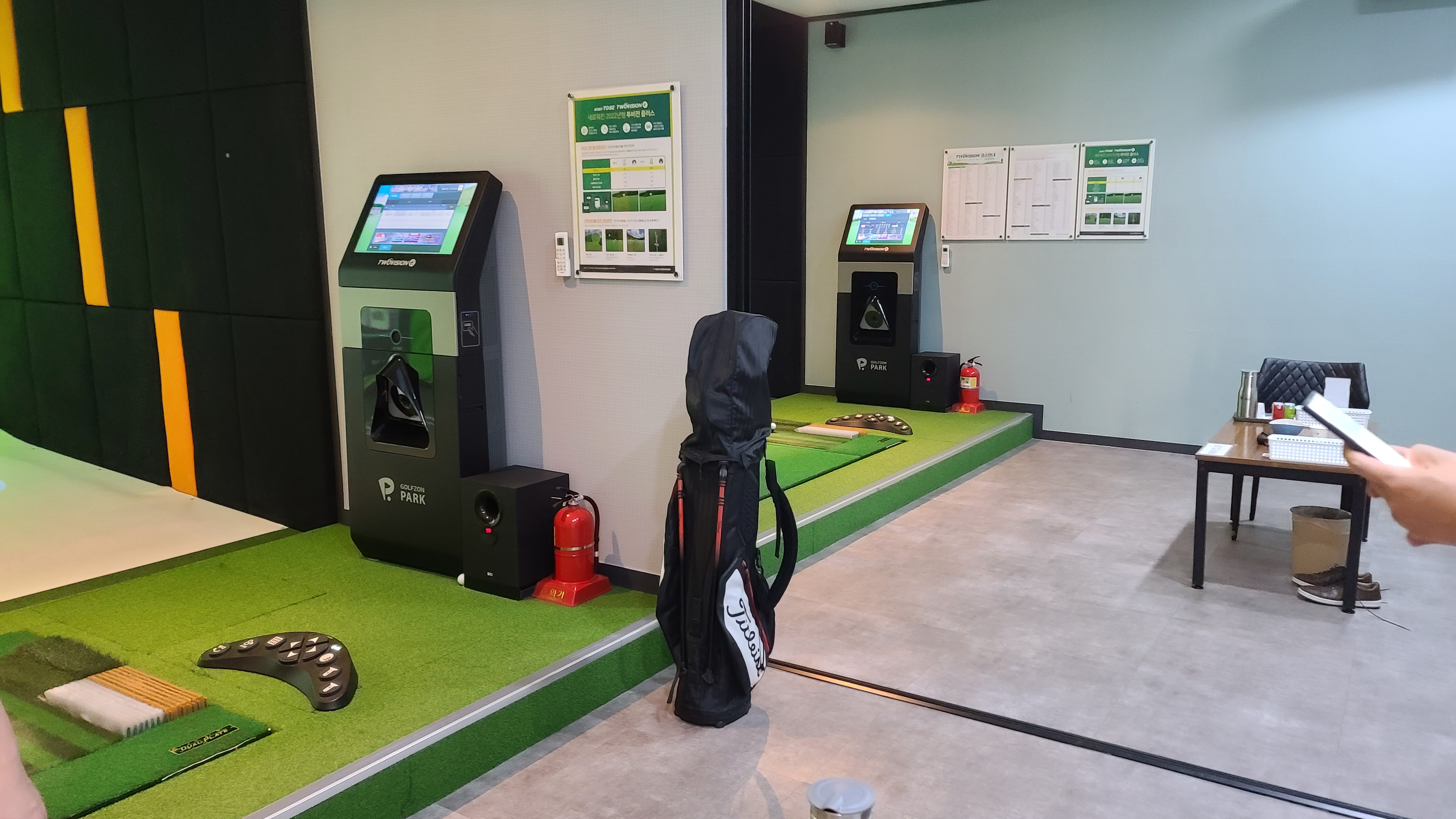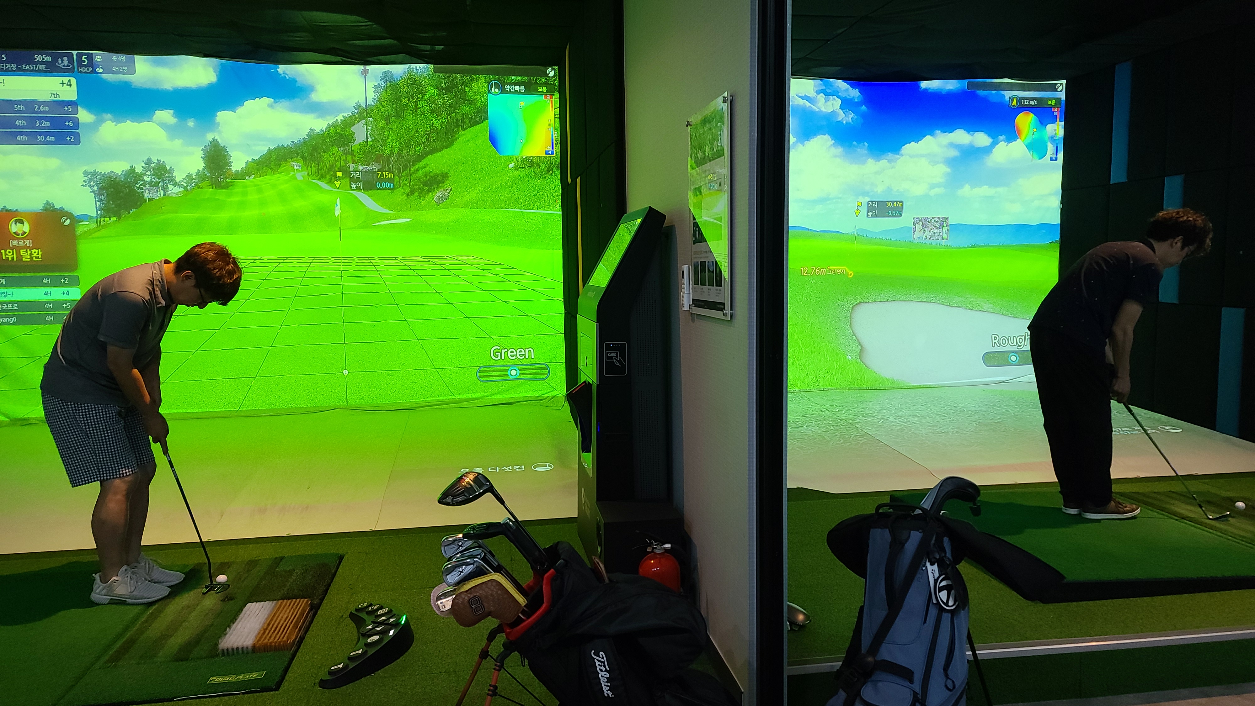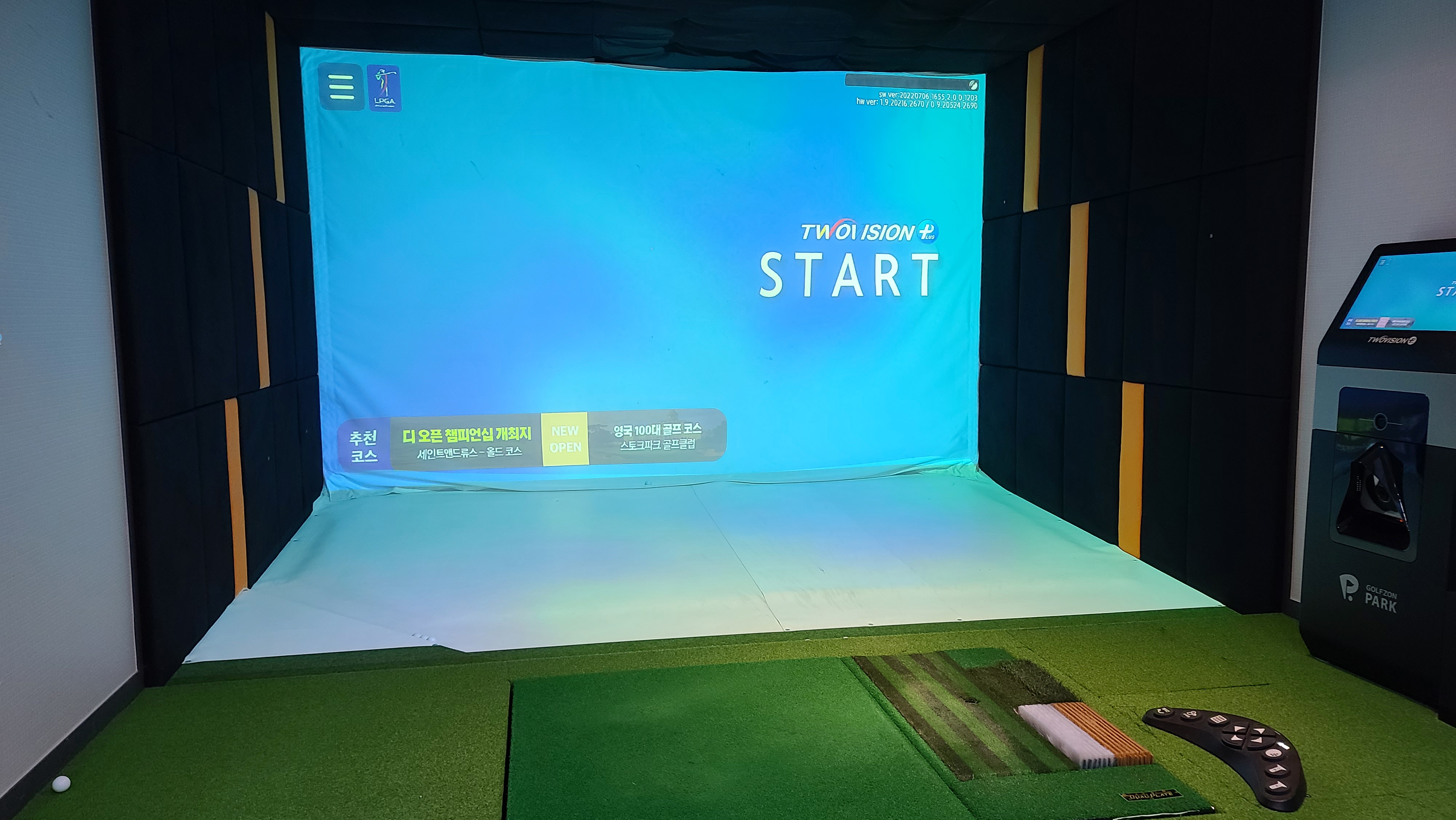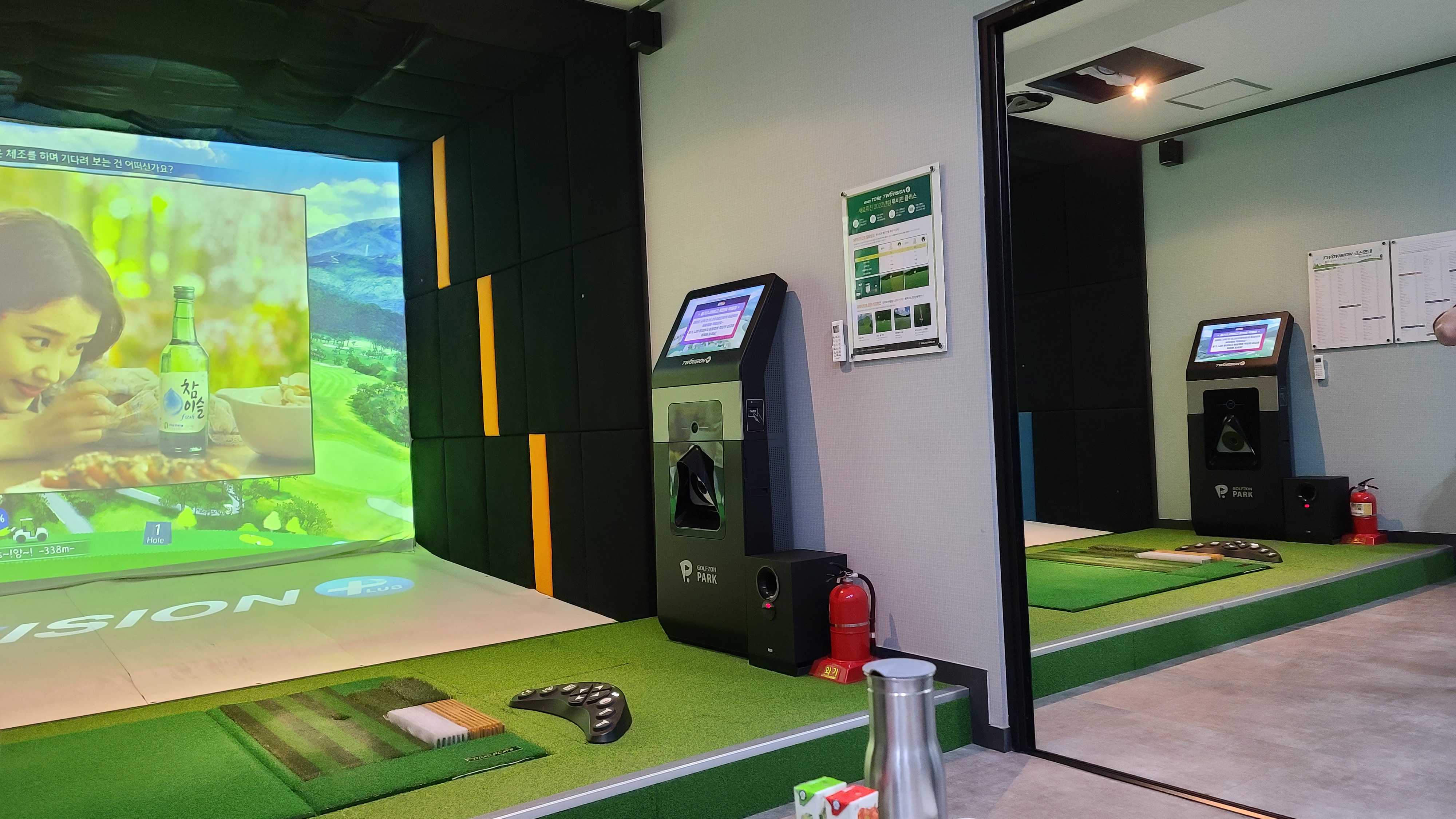 계단이나 엘레베이터를 타고 2층으로 올라가면 스크린골프장이 넓게 펼쳐져 있습니다. 밝은 조명과 장식이 인상적인 스크린 골프장 구조입니다.