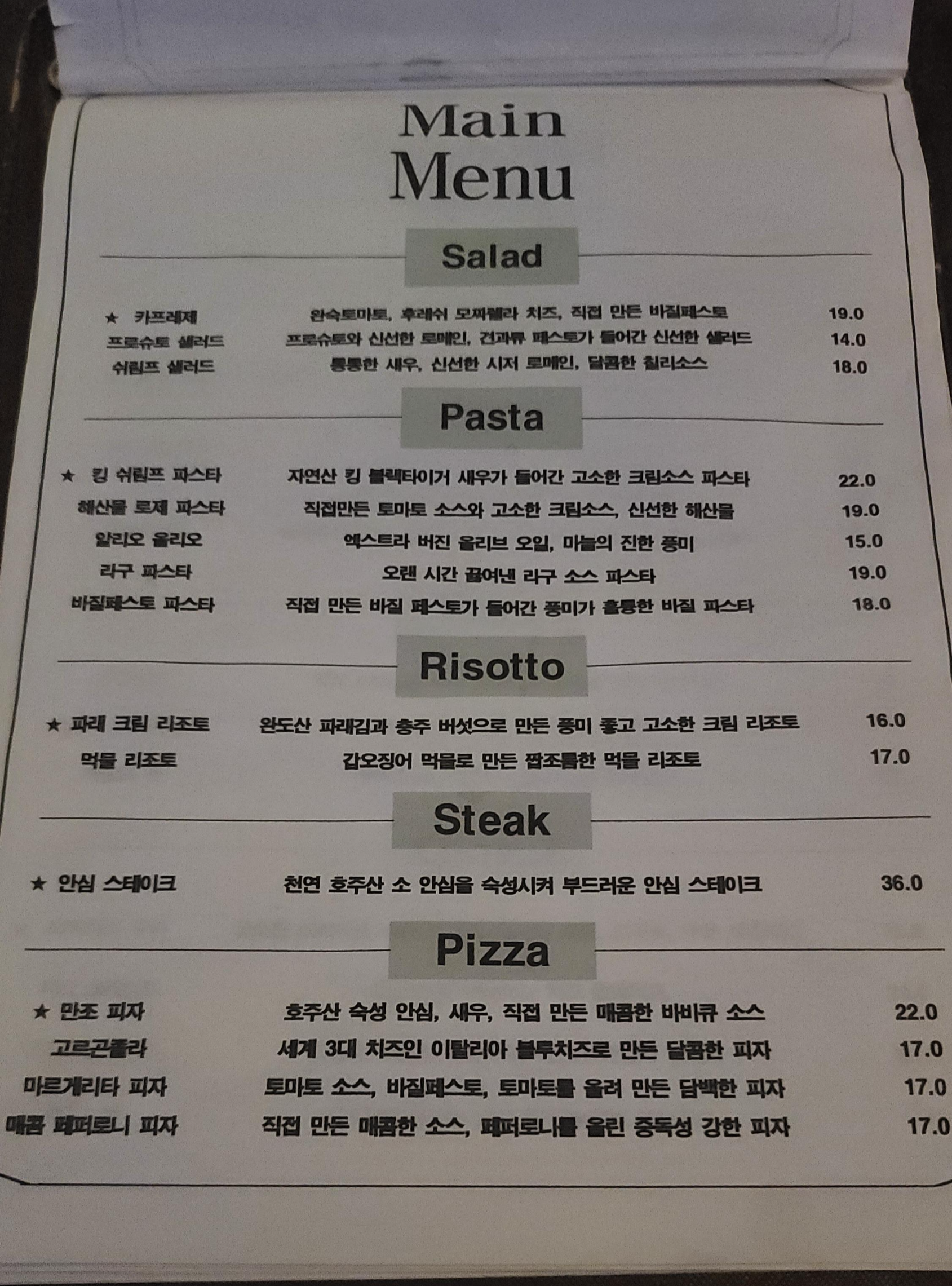 메뉴를 살펴보니 피자와 파스타 그리고 스테이크 까지 전형적인 이탈리안 레스토랑 메뉴의 모습을 보여줍니다.